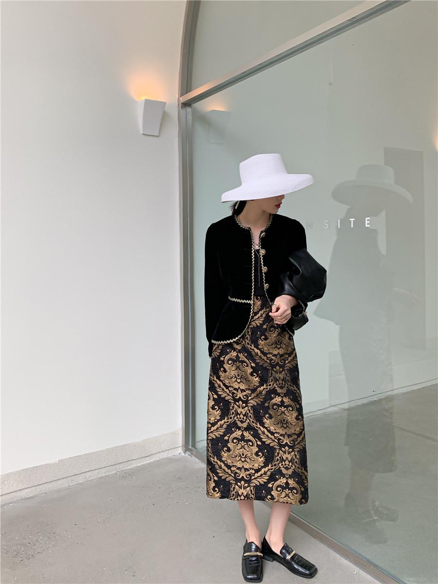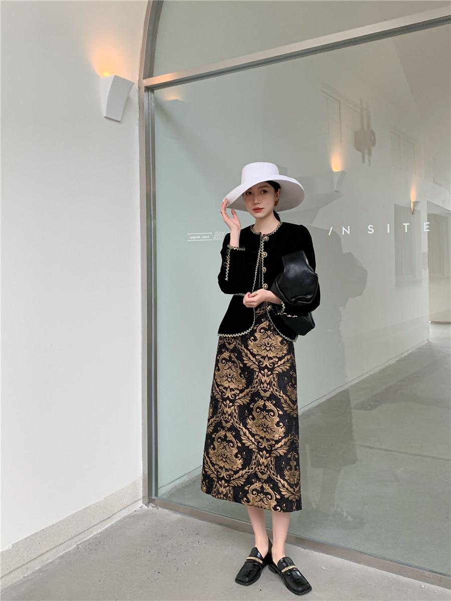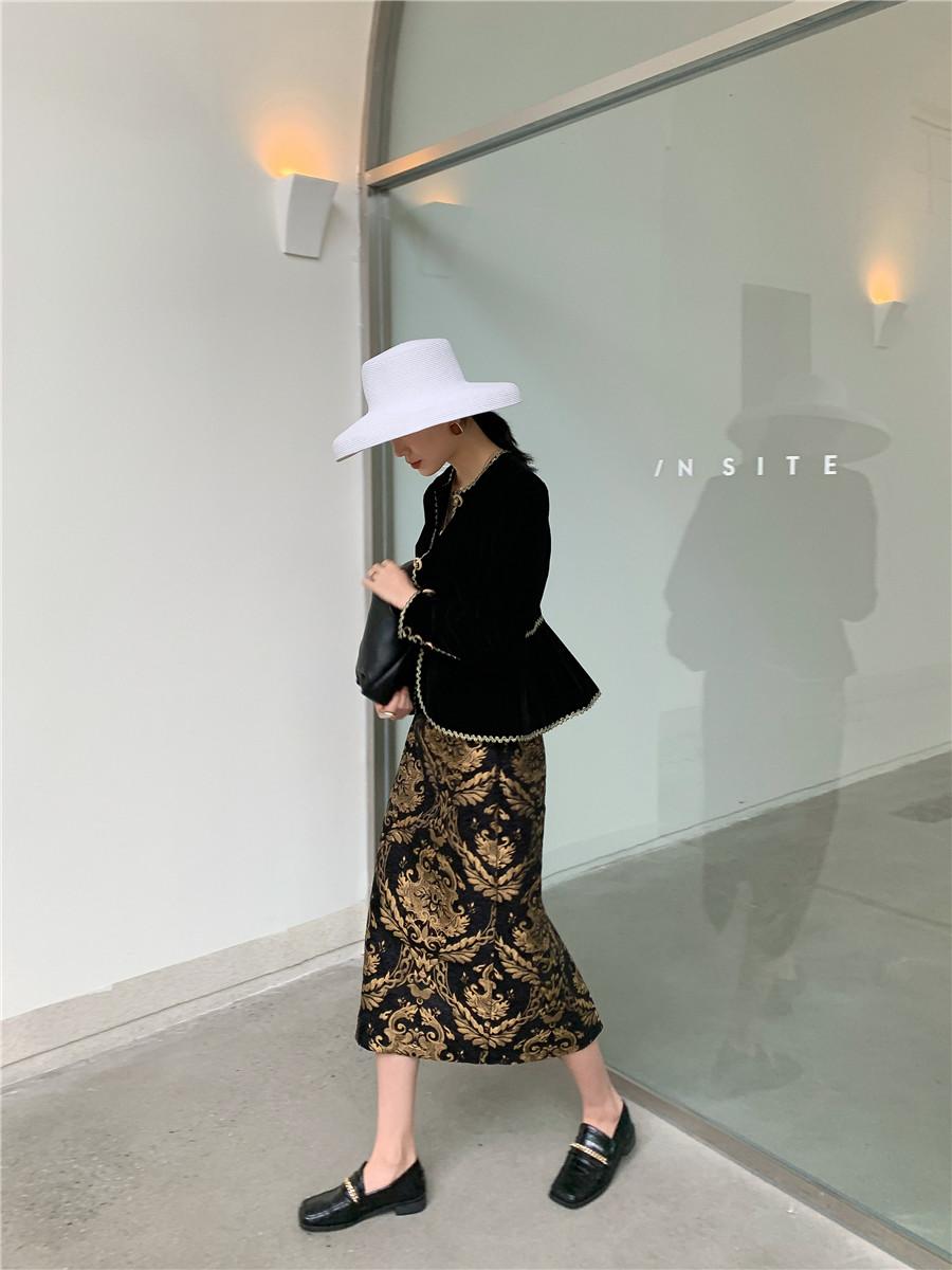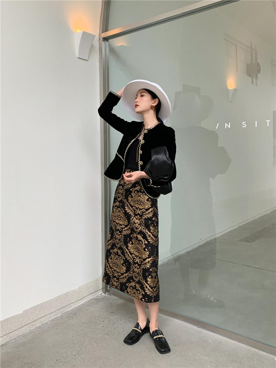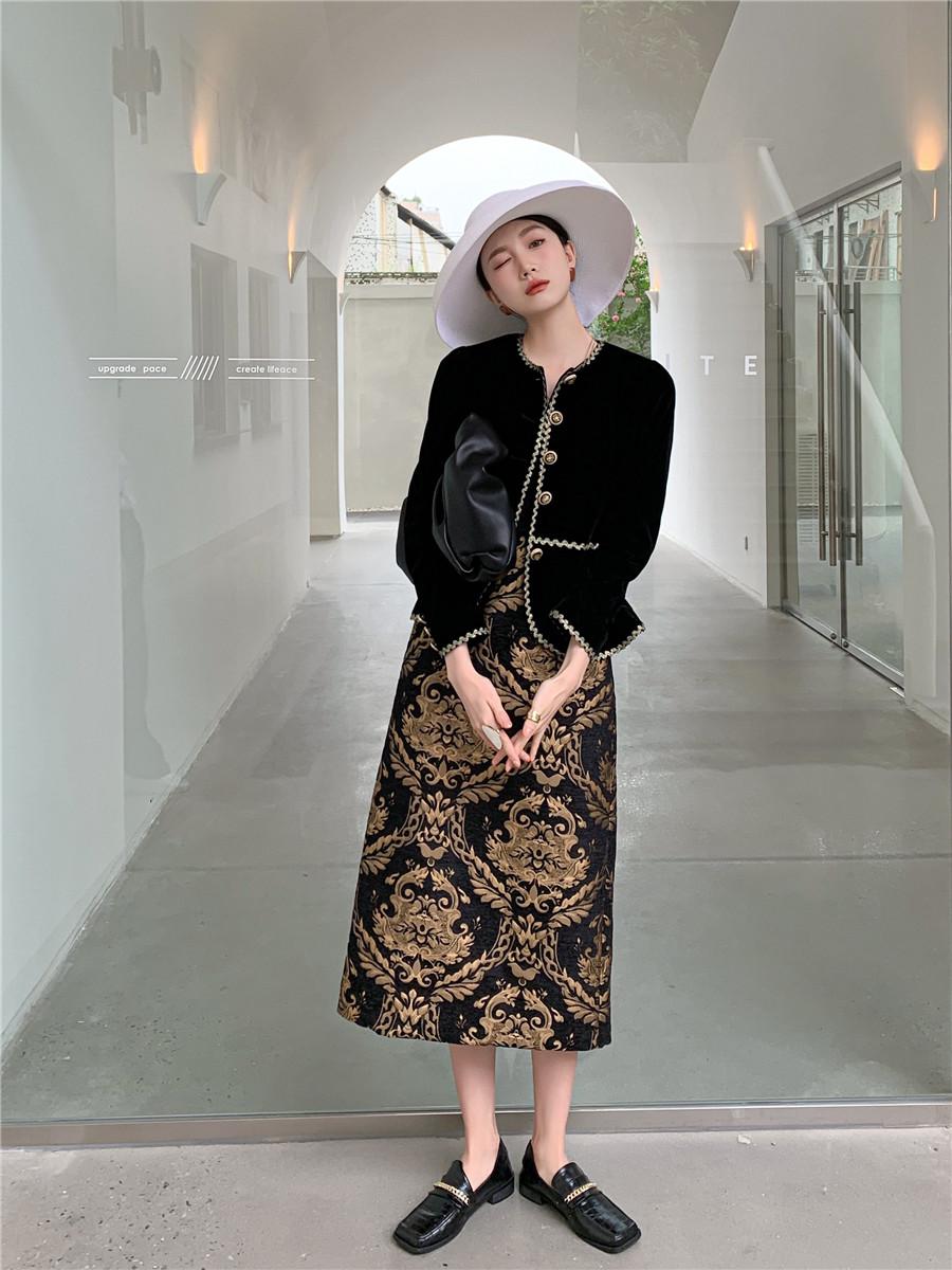 Falda Retro Negra Dorada Nueva Principios de Otoño Estilo Coreano Falda Bordada Cintura Alta Línea A