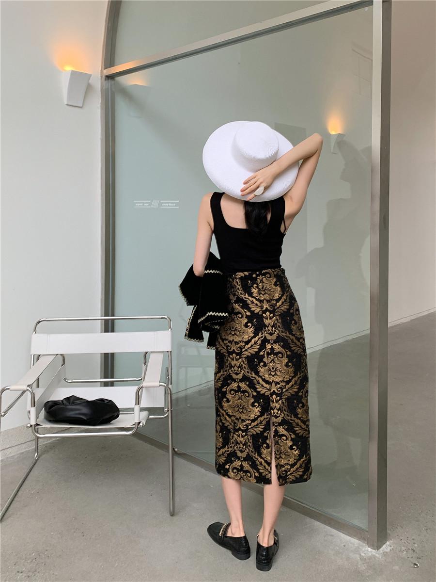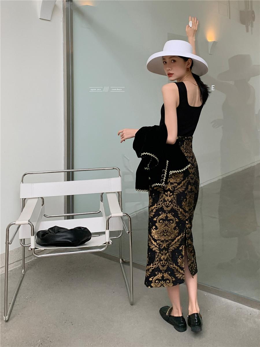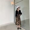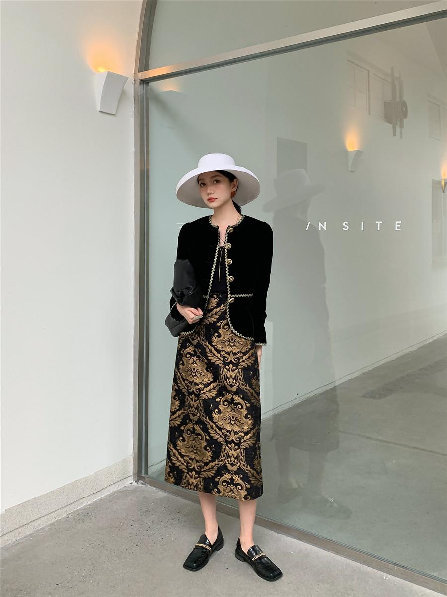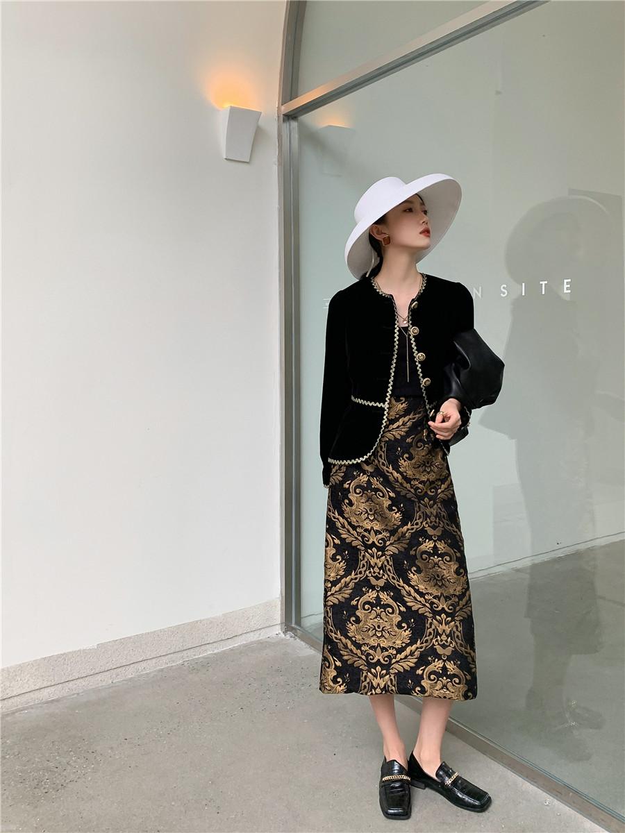 Falda Retro Negra Dorada Nueva Principios de Otoño Estilo Coreano Falda Bordada Cintura Alta Línea A