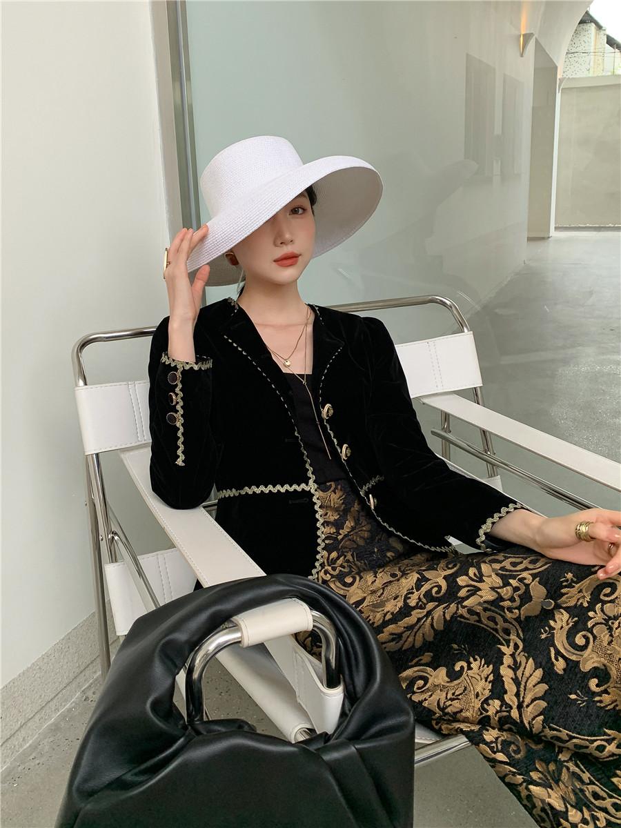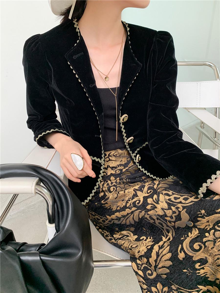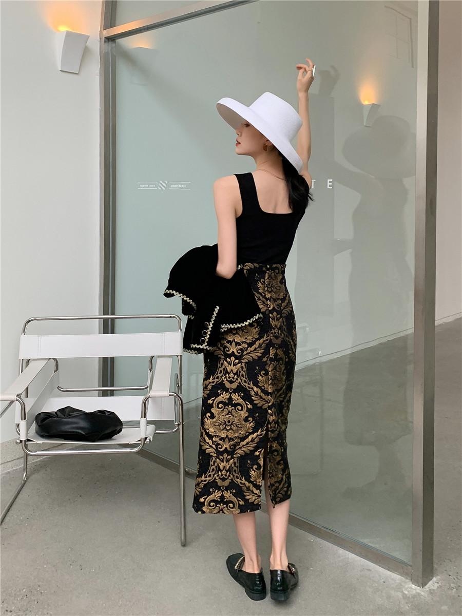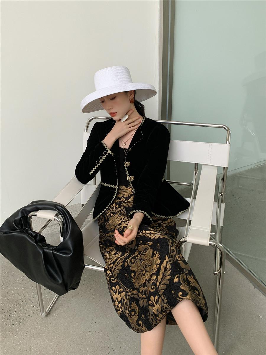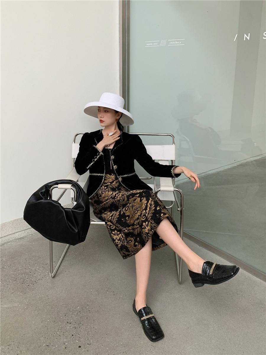 Falda Retro Negra Dorada Nueva Principios de Otoño Estilo Coreano Falda Bordada Cintura Alta Línea A