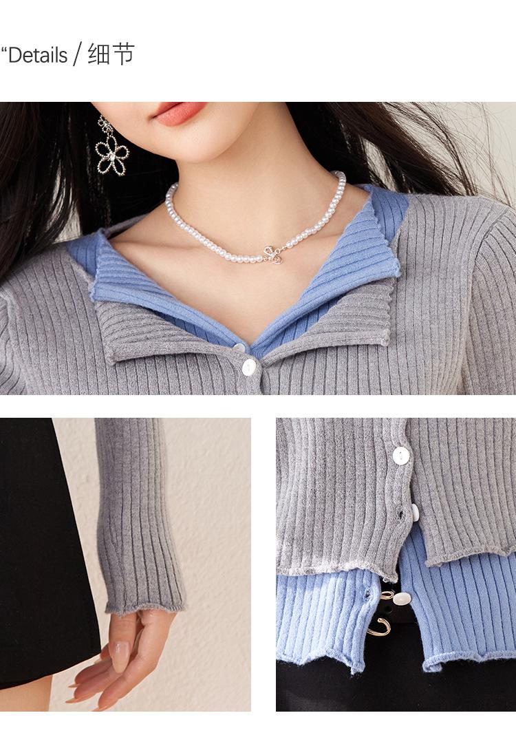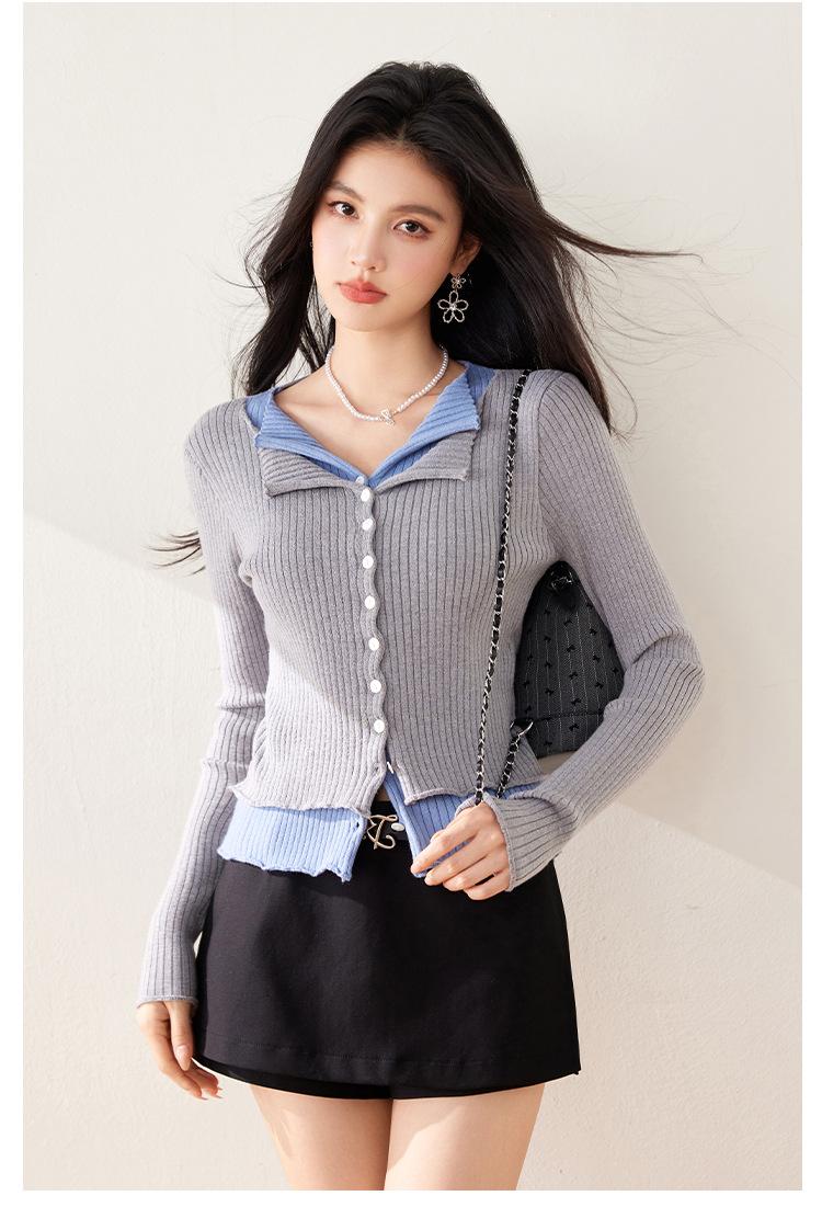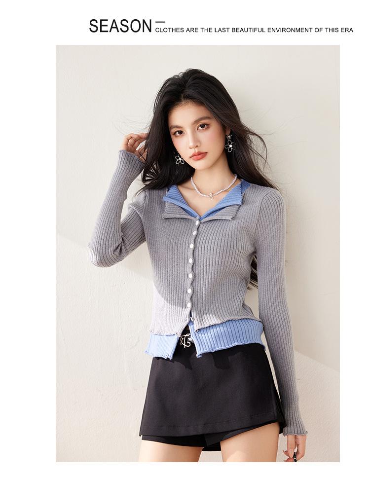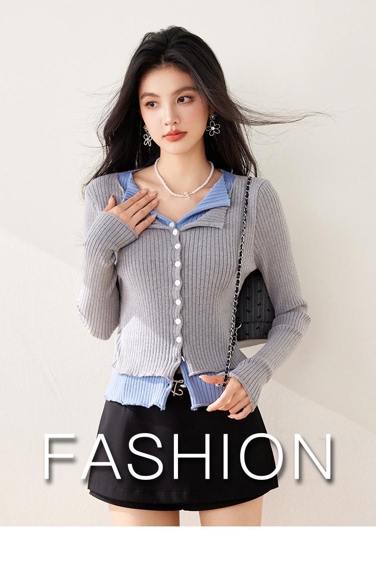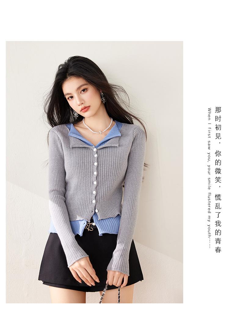 Cárdigan de punto de diseño corto para mujer de primavera temprana 2025, nuevo nicho coreano, color en contraste, cuello en V, diseño de dos piezas falsas.