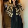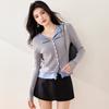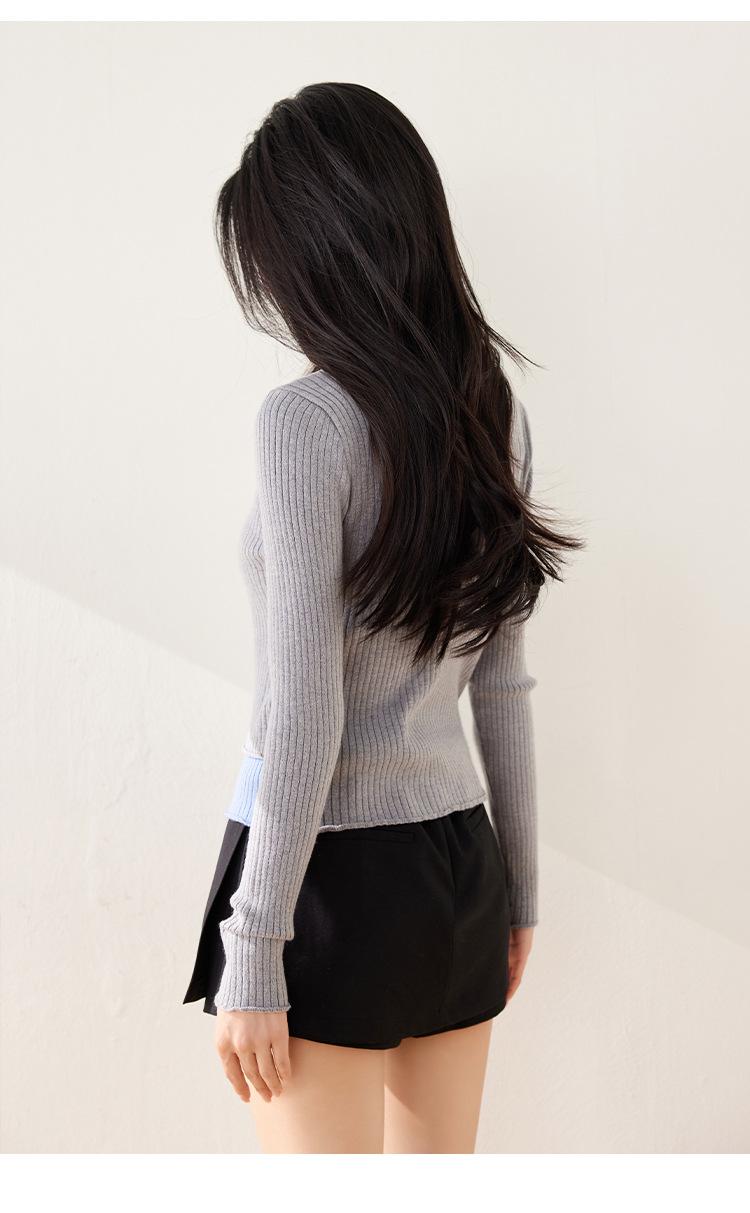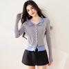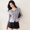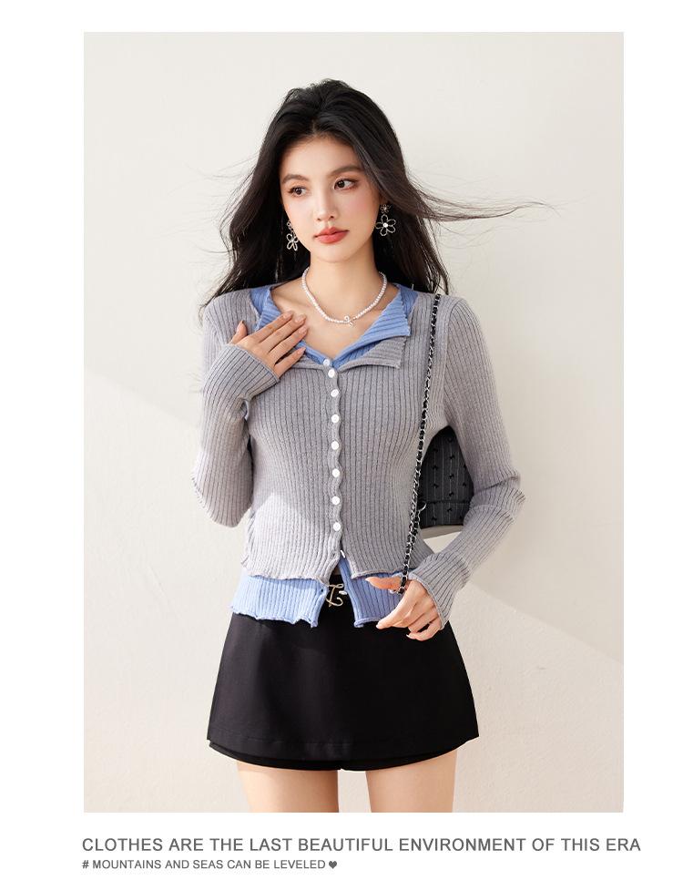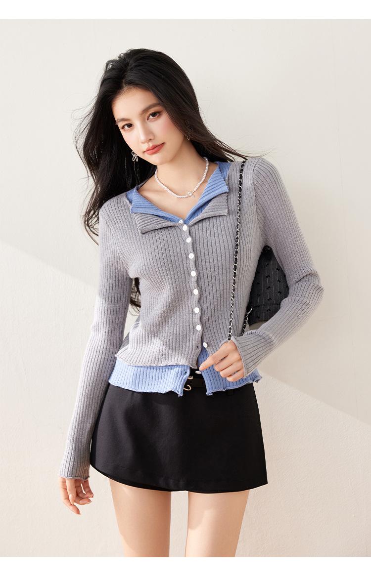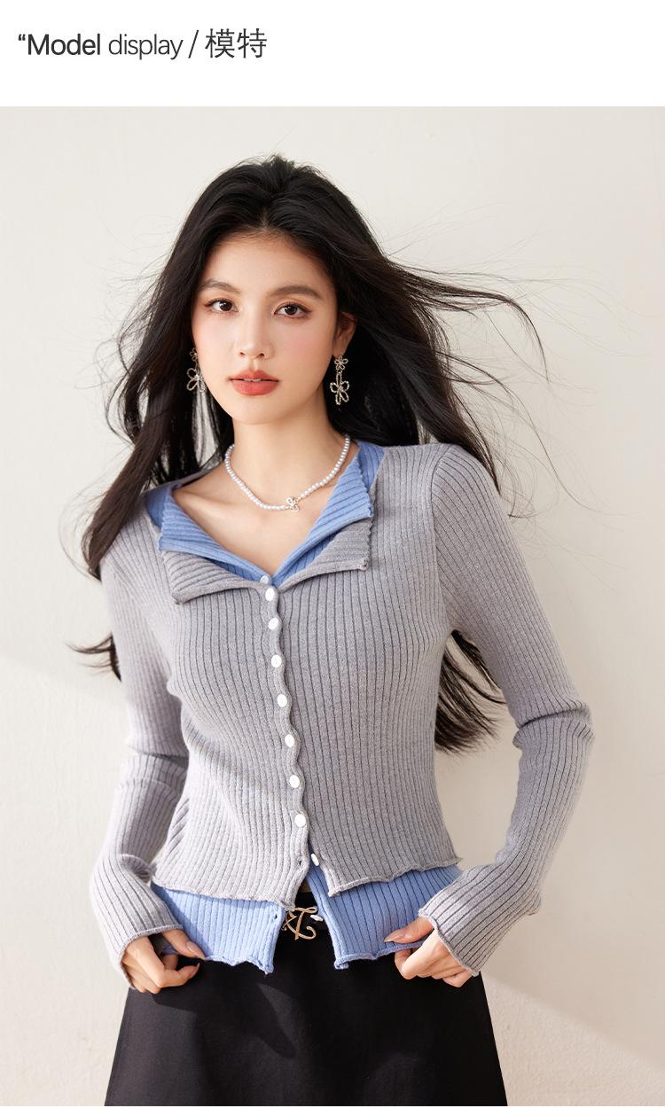 Cárdigan de punto de diseño corto para mujer de primavera temprana 2025, nuevo nicho coreano, color en contraste, cuello en V, diseño de dos piezas falsas.