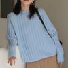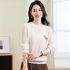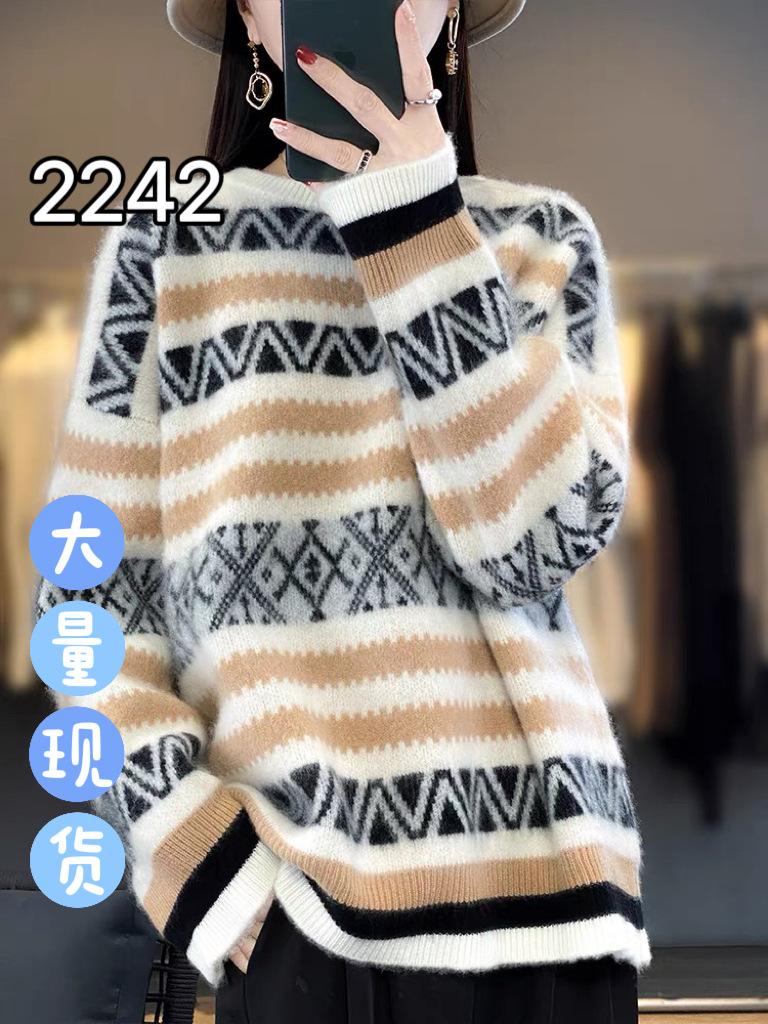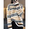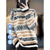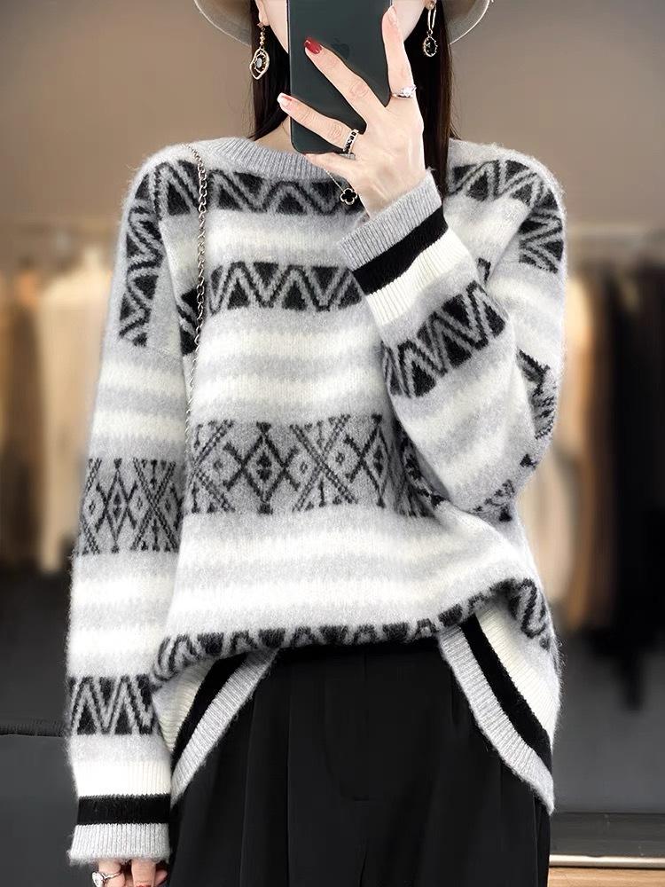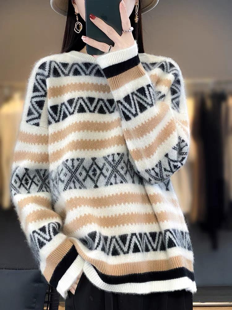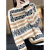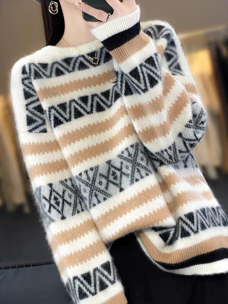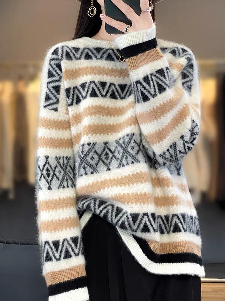 Suéter jacquard de cachemira de cuello redondo para mujer, holgado, con bloques de color, otoño e invierno 2024, camisa básica