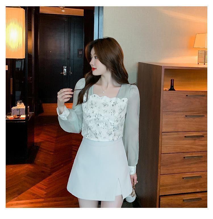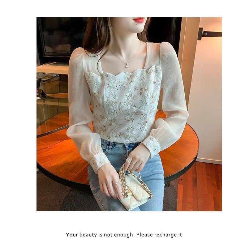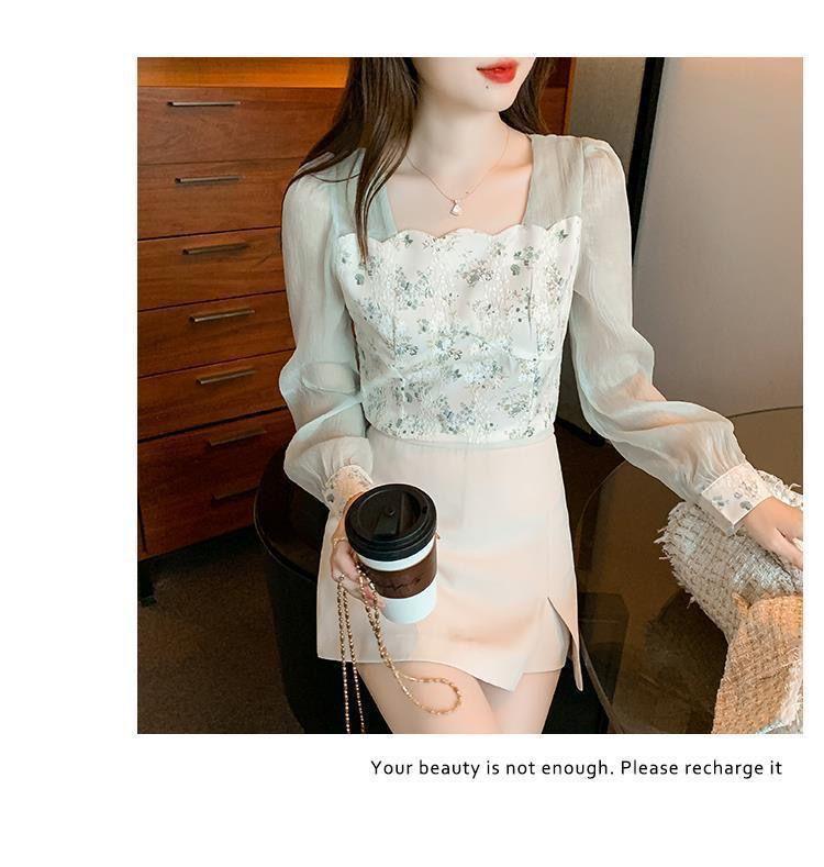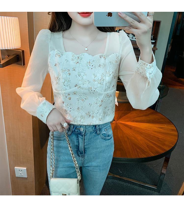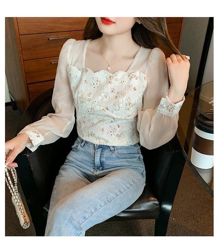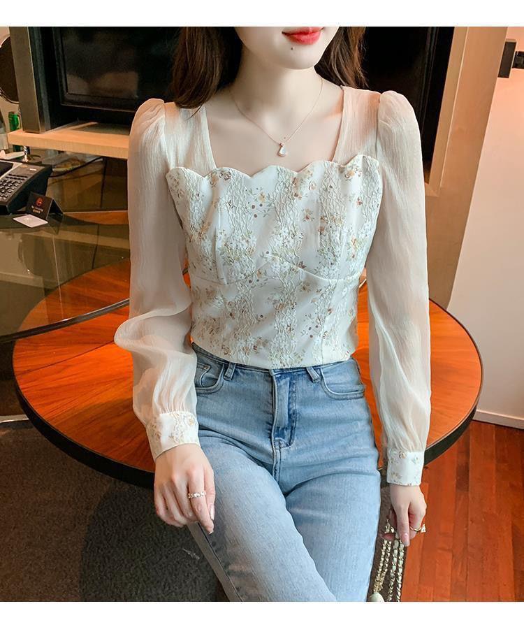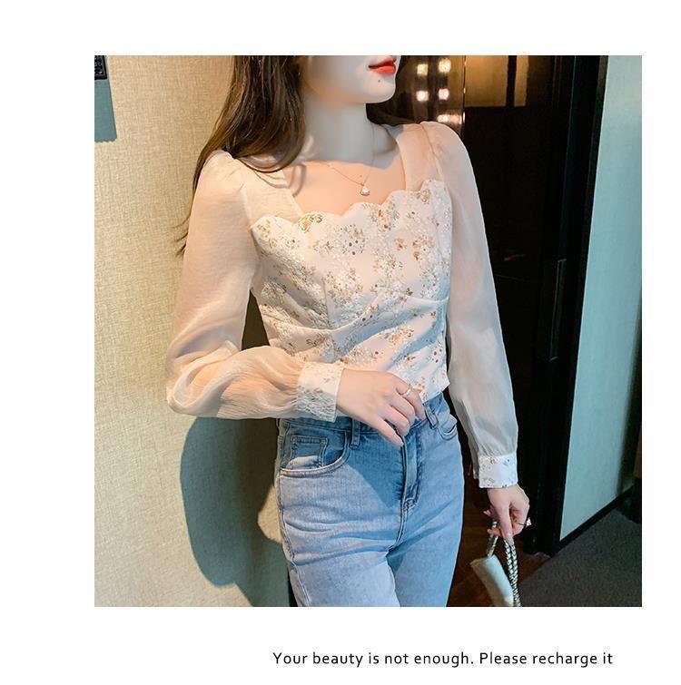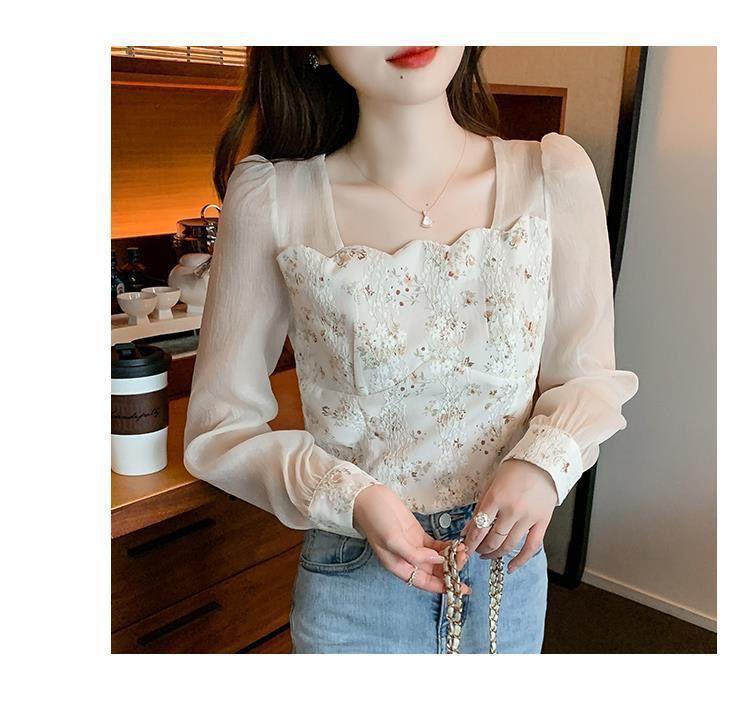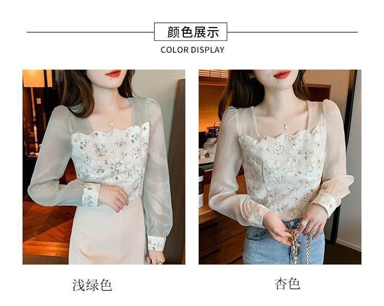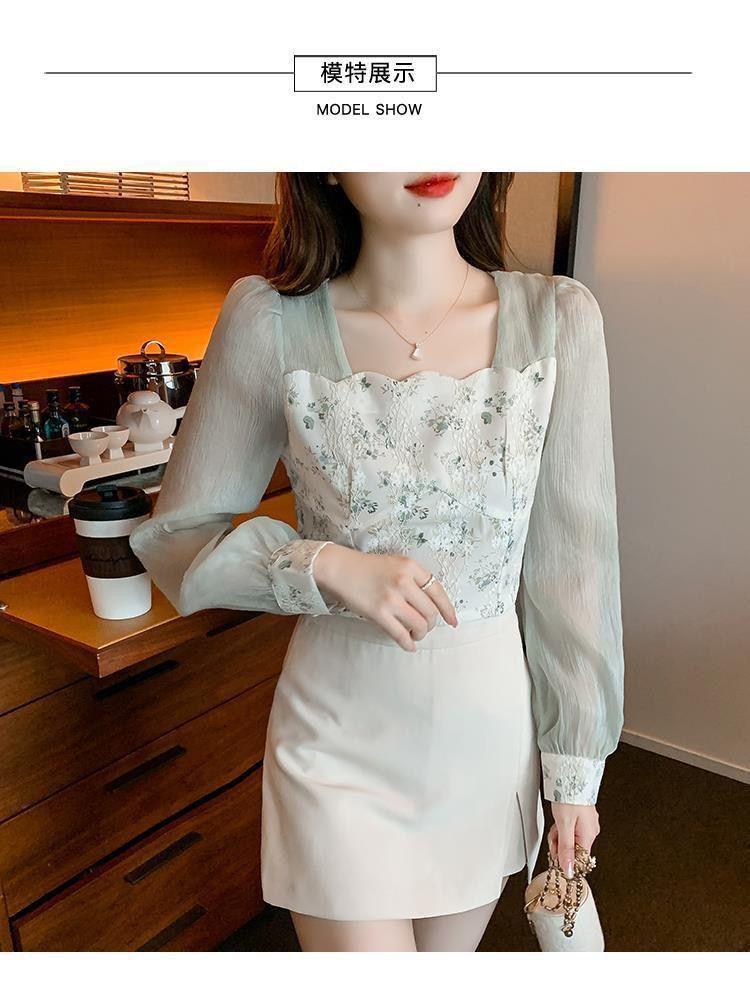 Camisa de gasa con costuras de encaje para mujer, primavera y verano 2024, nueva, pequeña, fresca, dulce, cuello cuadrado, elegante, floral, blusa pequeña