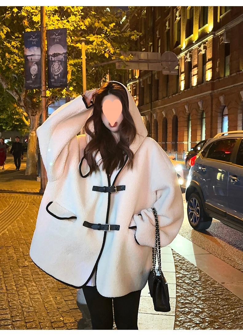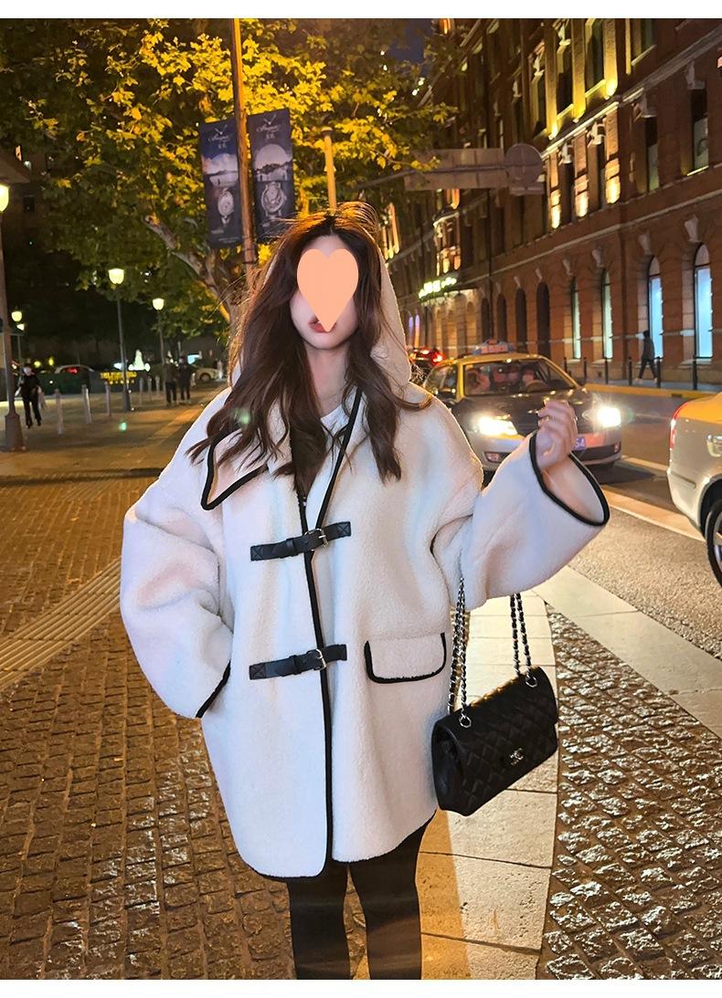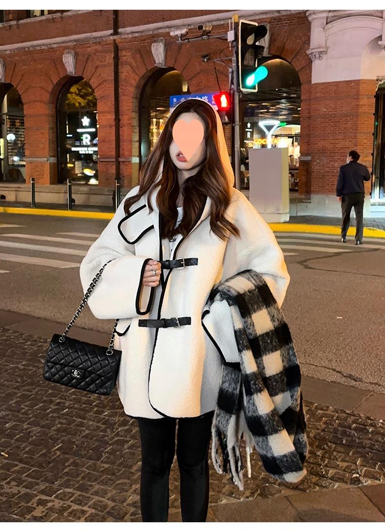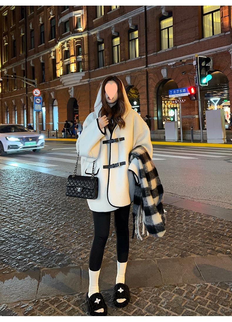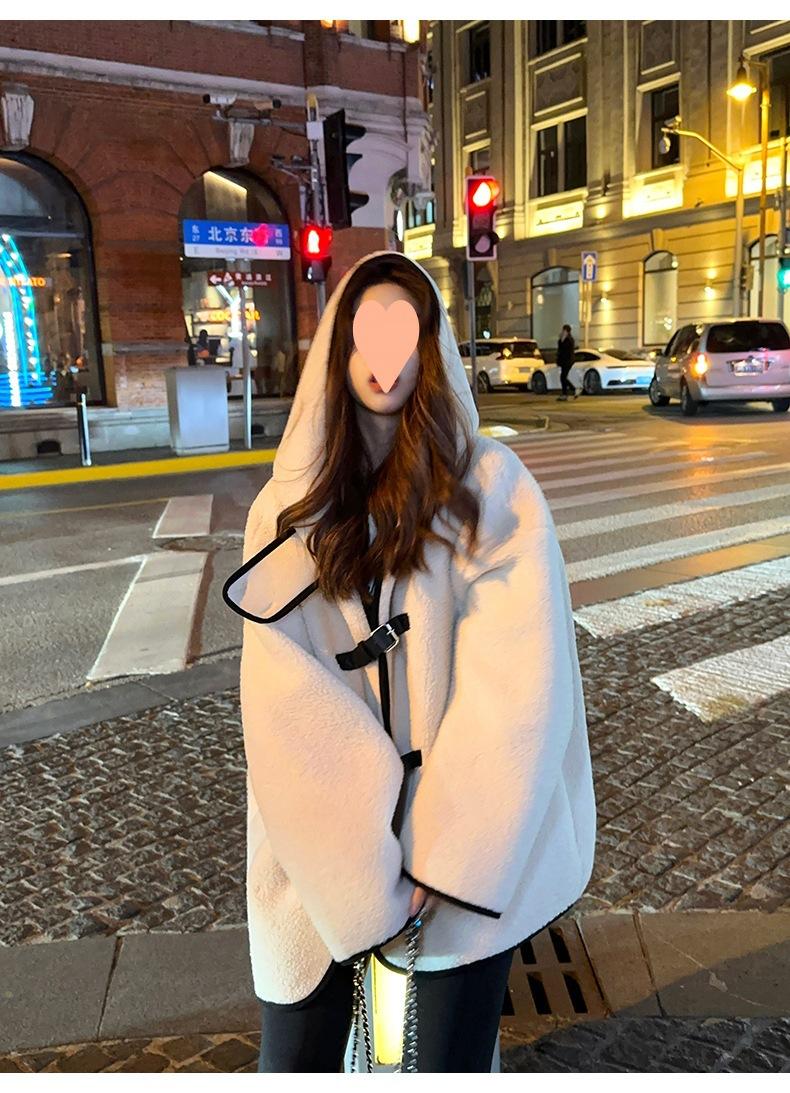 Abrigo casual moderno con capucha de lana de cordero invierno Nuevo estilo coreano holgado con hebilla de cuero cálido diseño blanco sobretodo