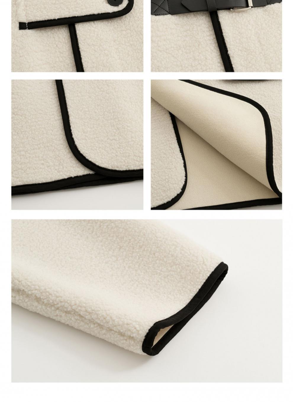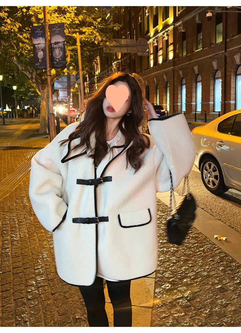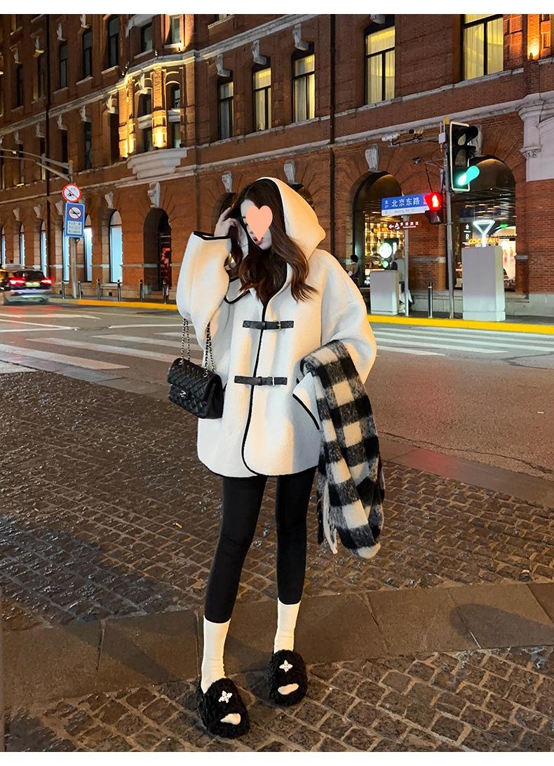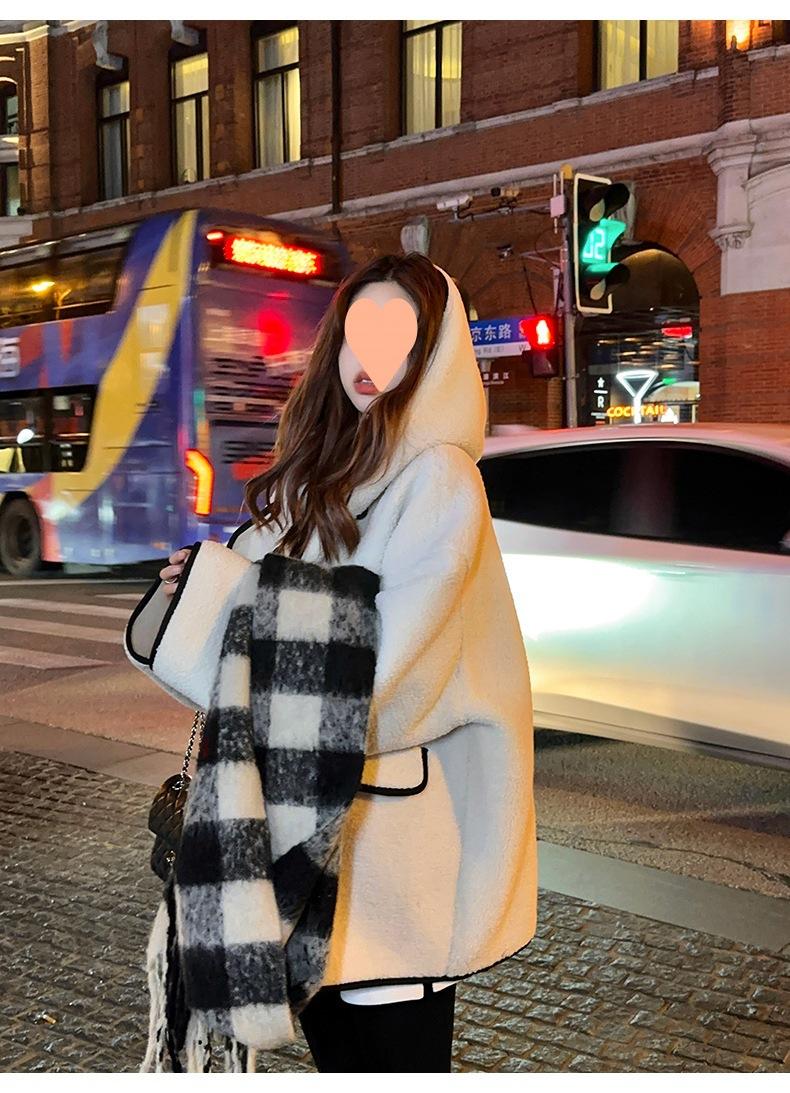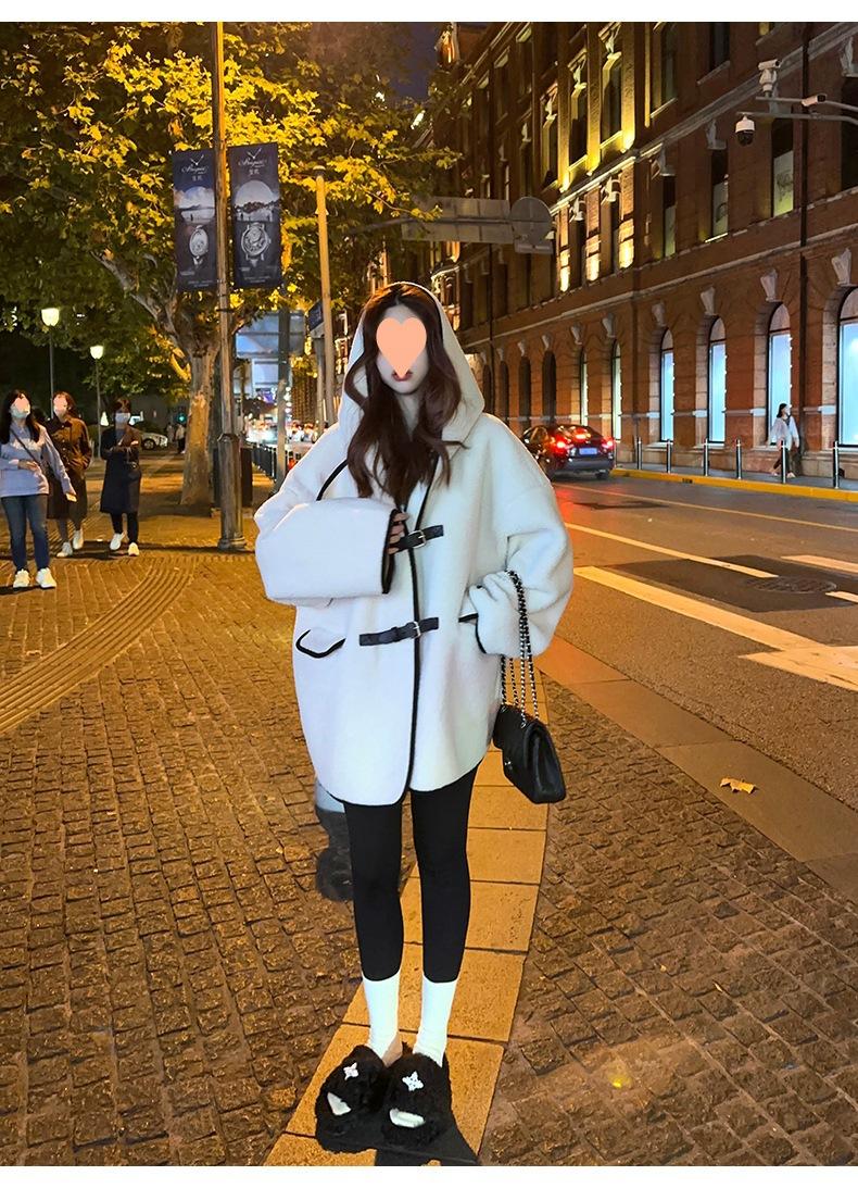 Abrigo casual moderno con capucha de lana de cordero invierno Nuevo estilo coreano holgado con hebilla de cuero cálido diseño blanco sobretodo