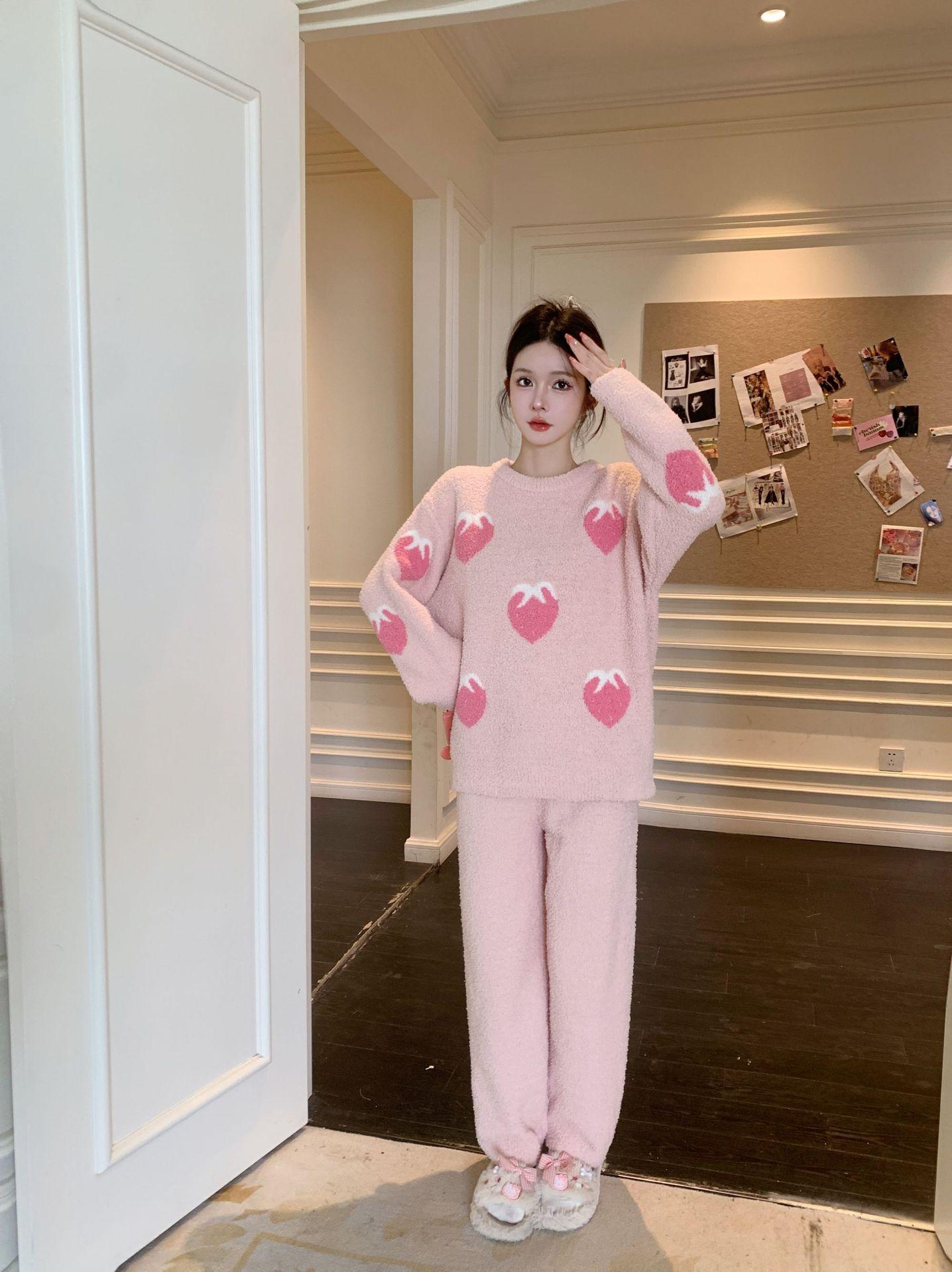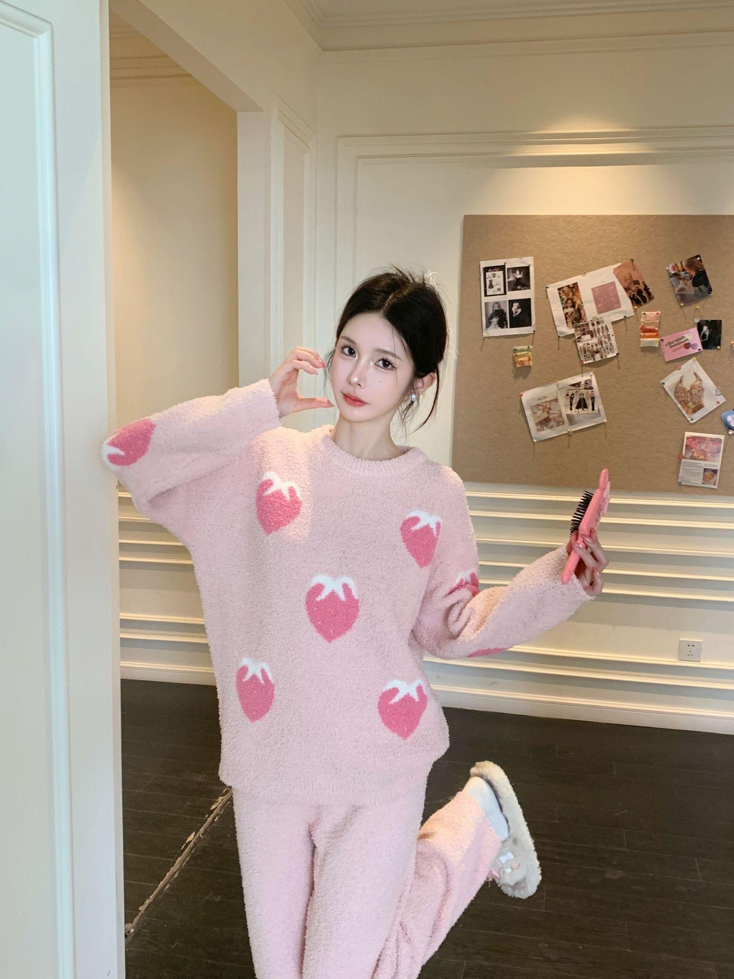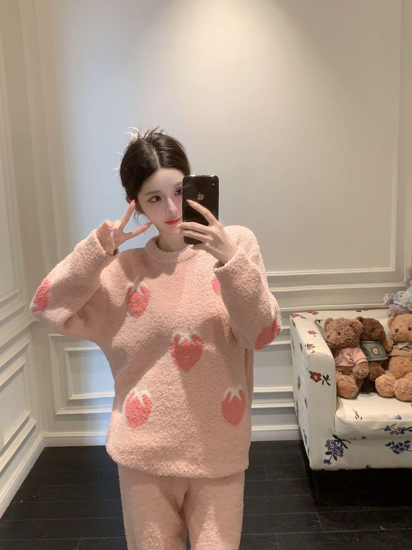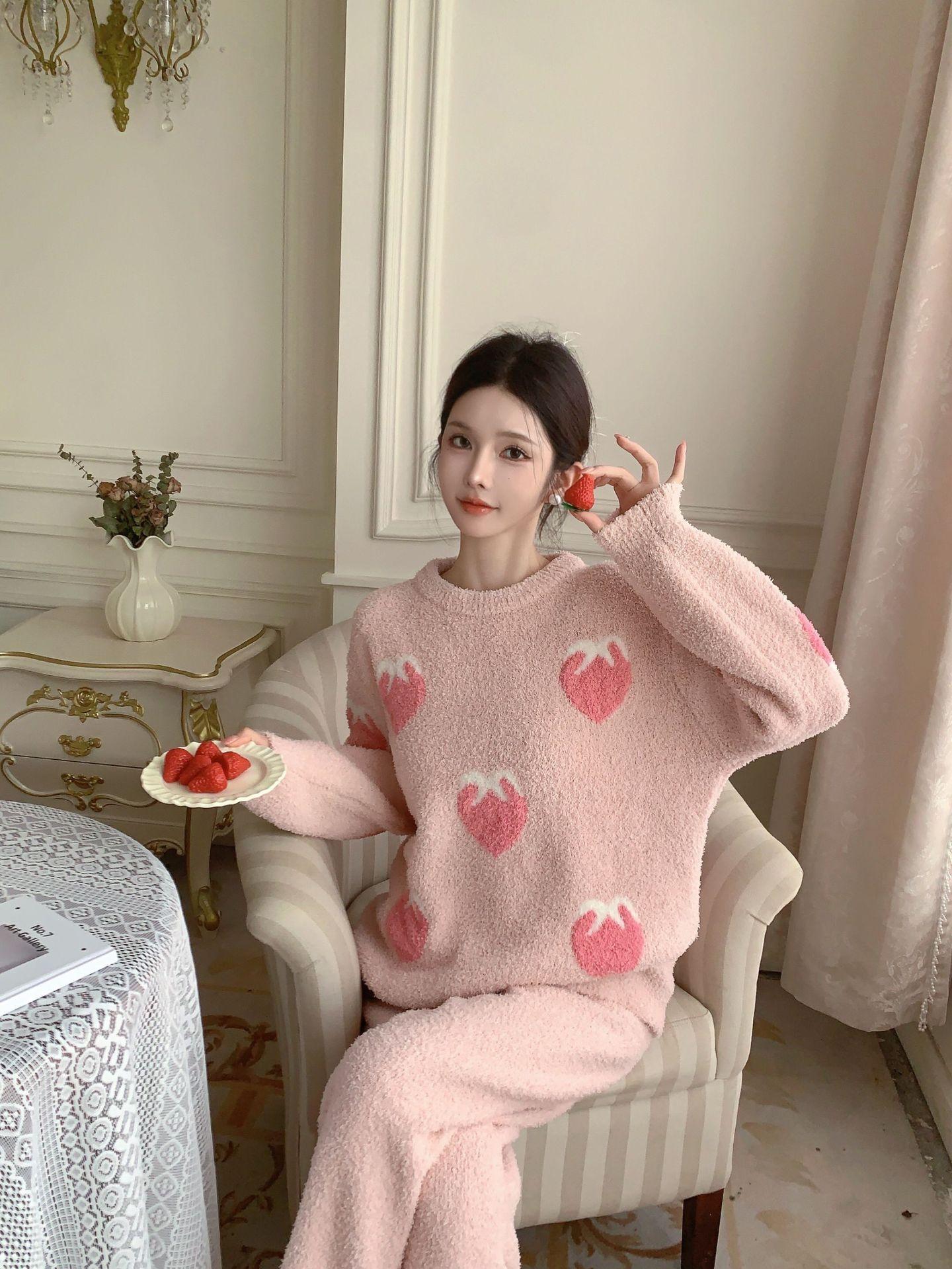 Pijama de terciopelo de estilo coreano para mujer, ropa de invierno, nueva prenda exterior de terciopelo con cuello redondo, ropa para el hogar, traje de chica dulce fresa