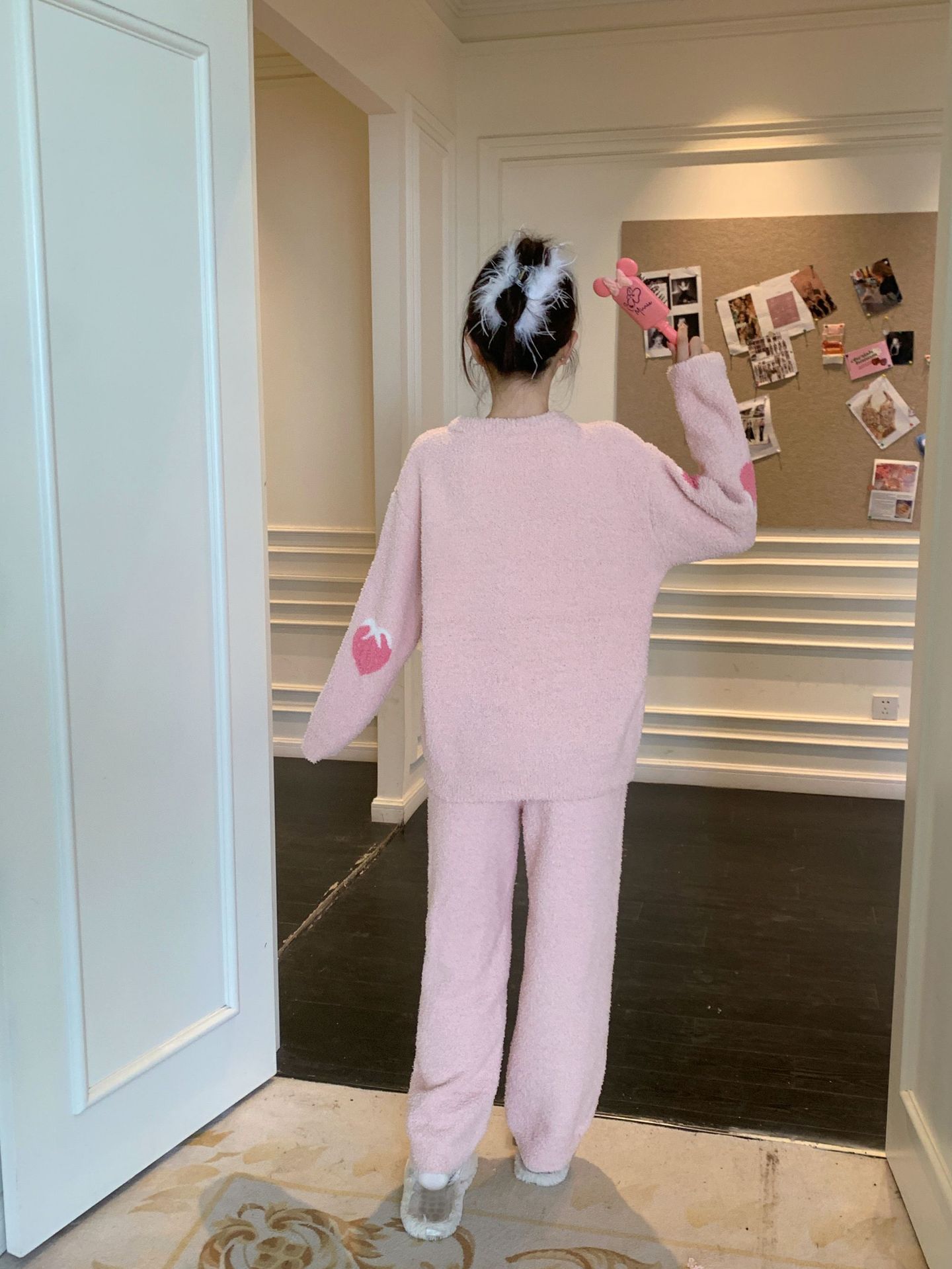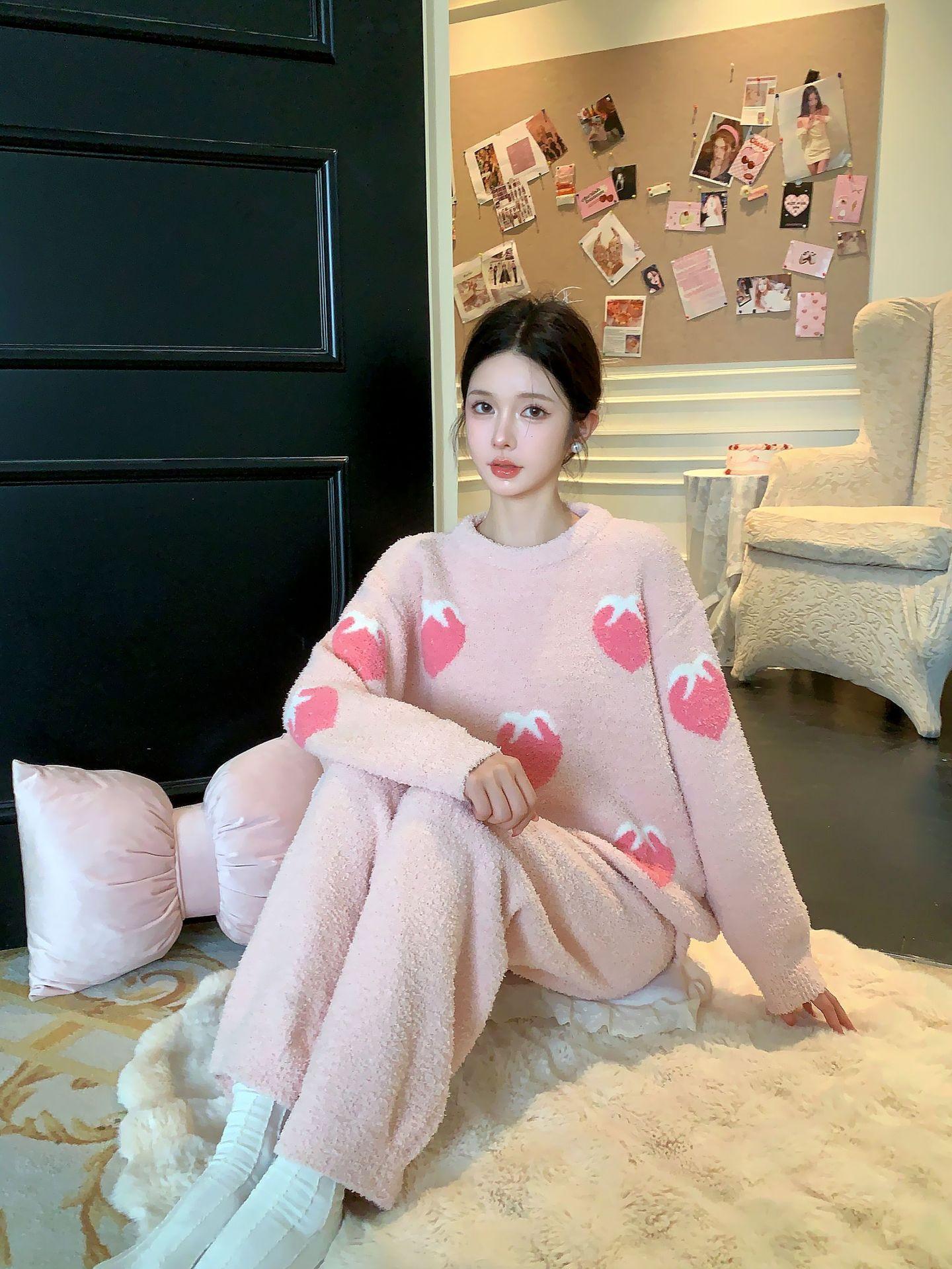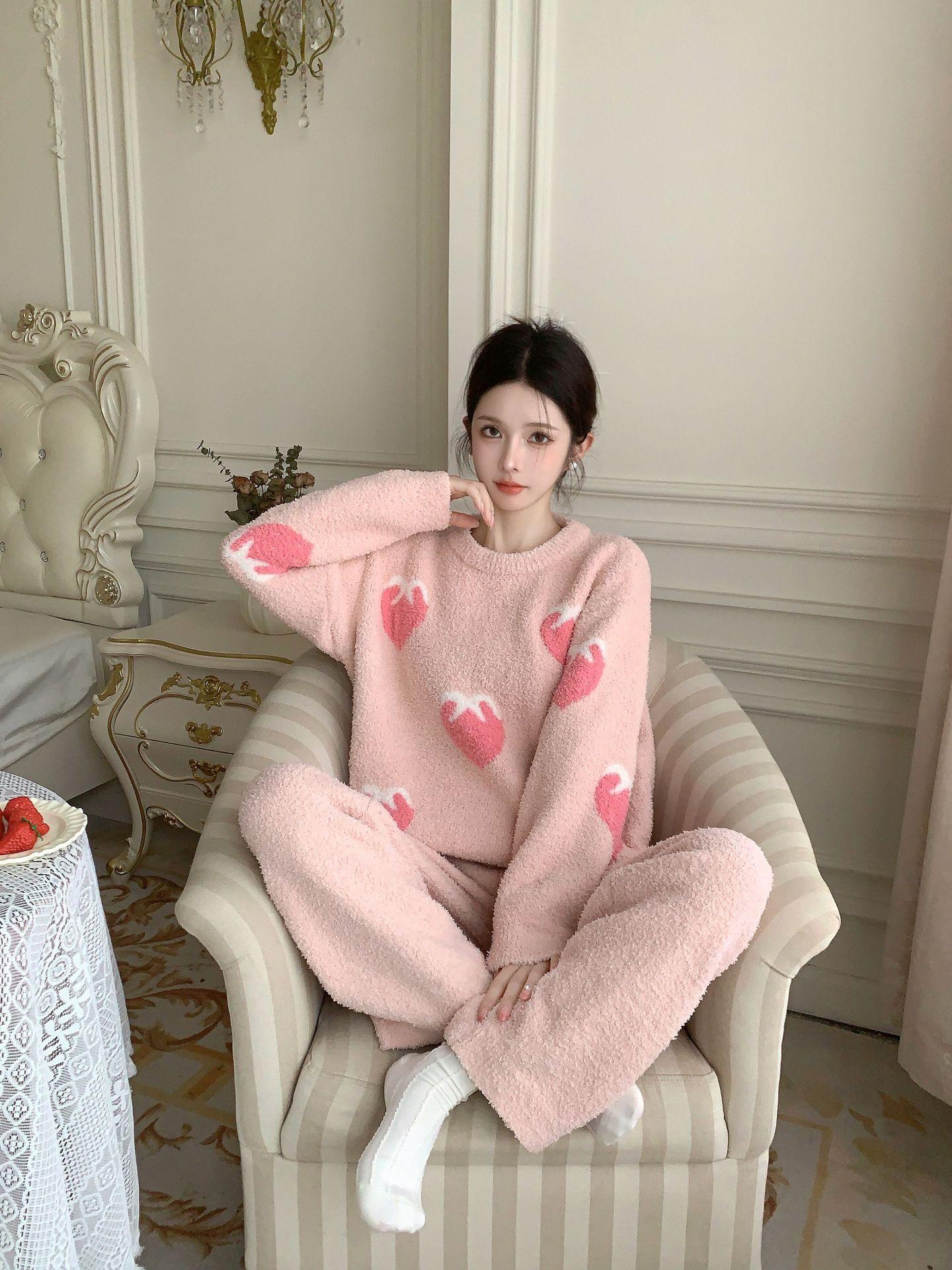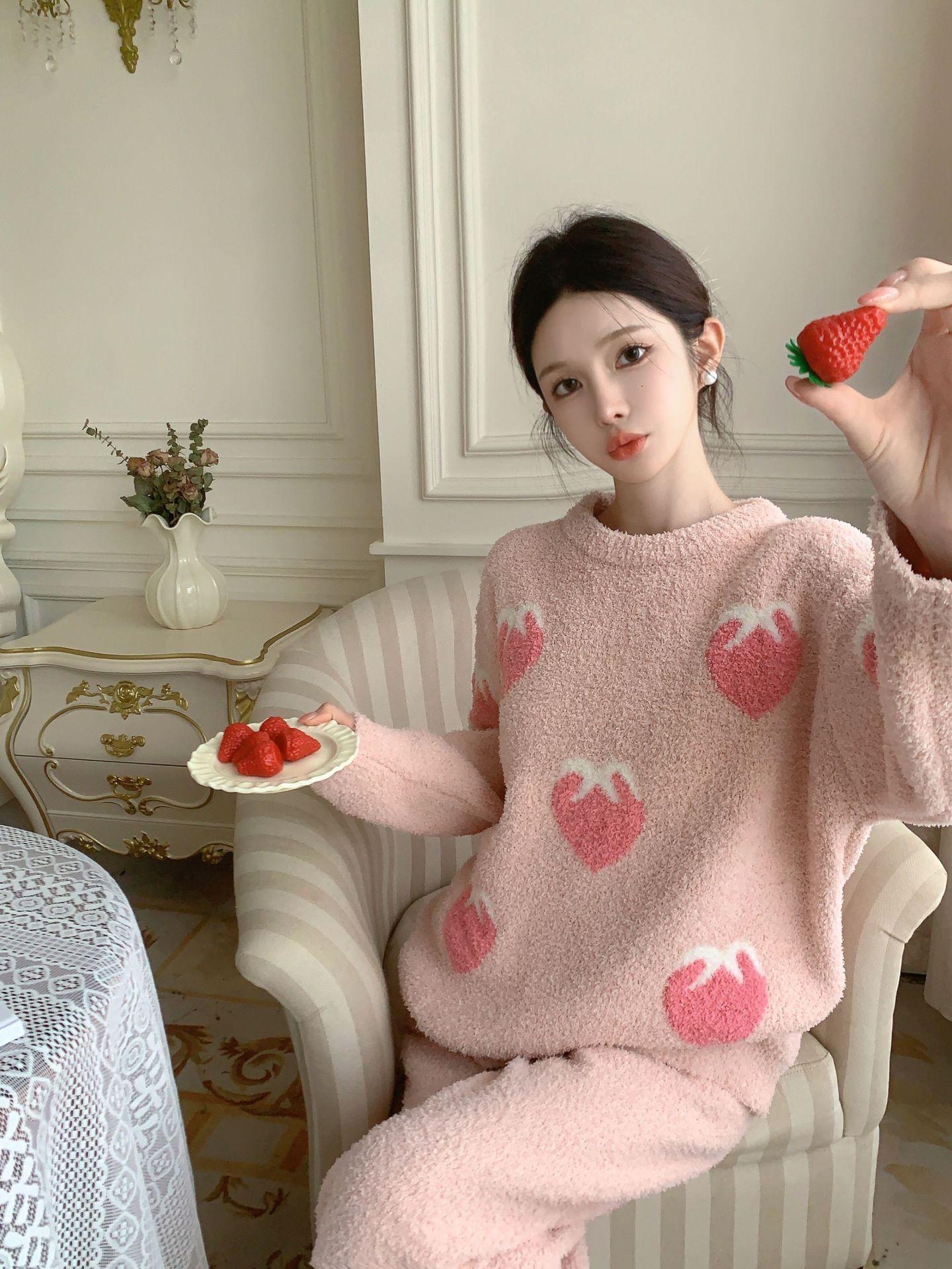 Pijama de terciopelo de estilo coreano para mujer, ropa de invierno, nueva prenda exterior de terciopelo con cuello redondo, ropa para el hogar, traje de chica dulce fresa