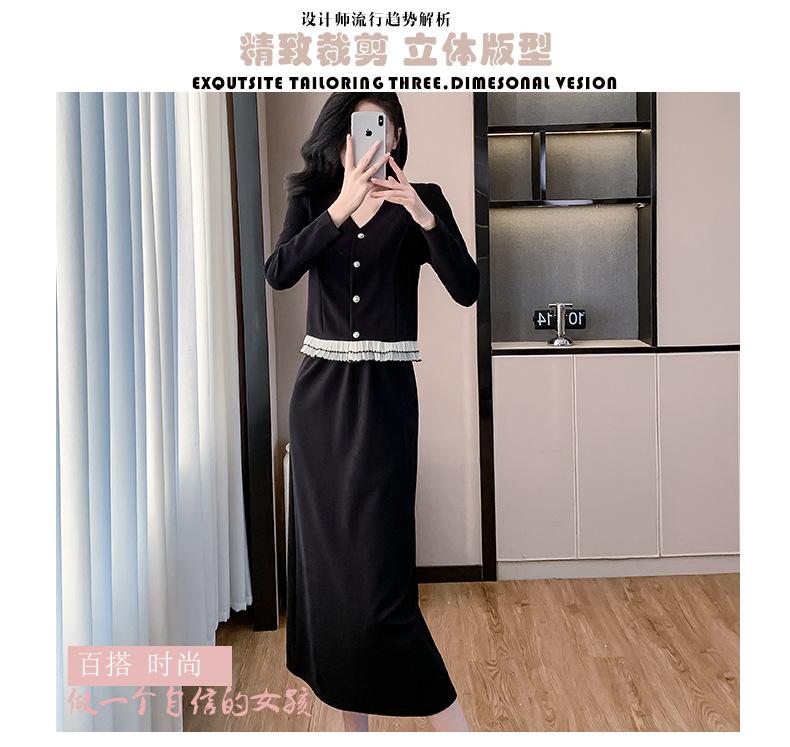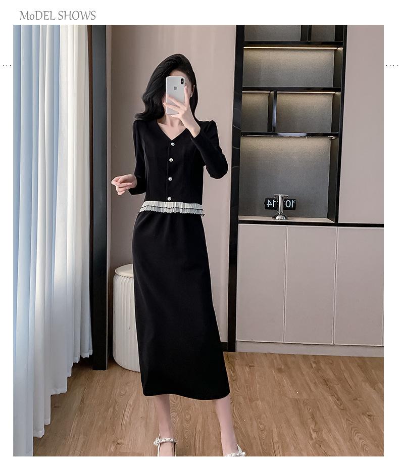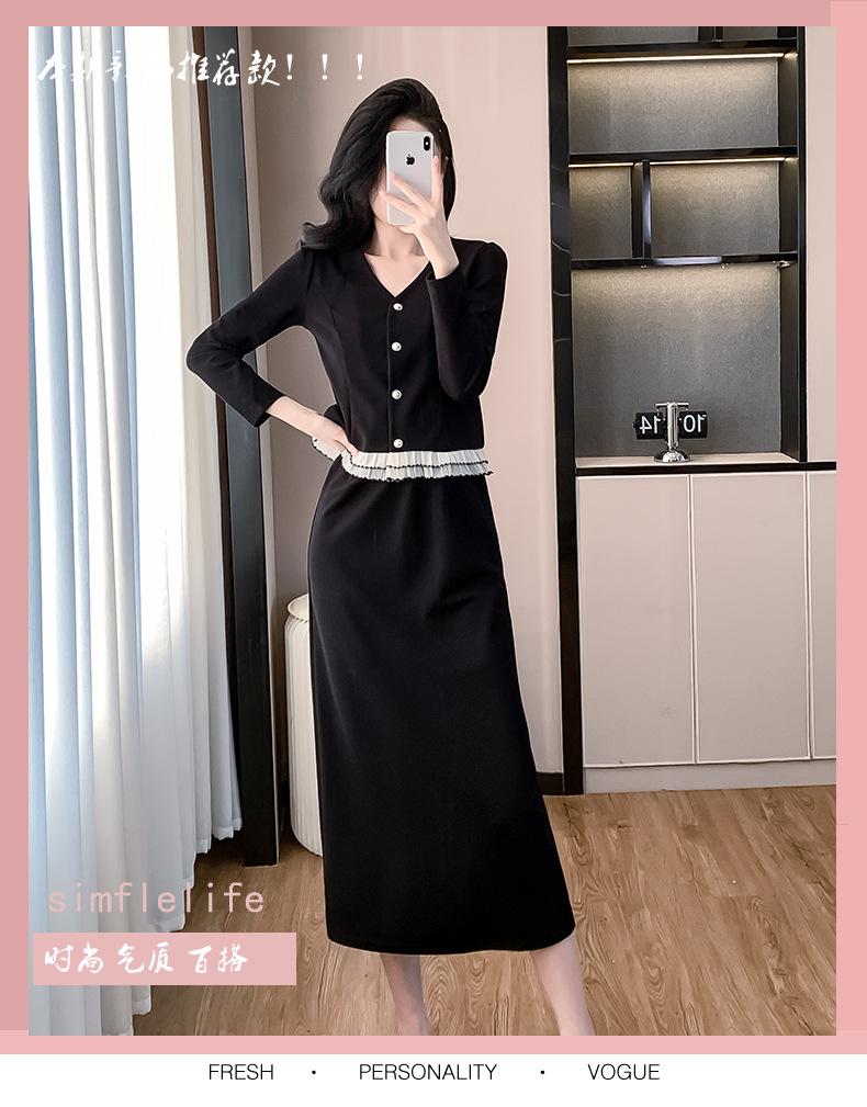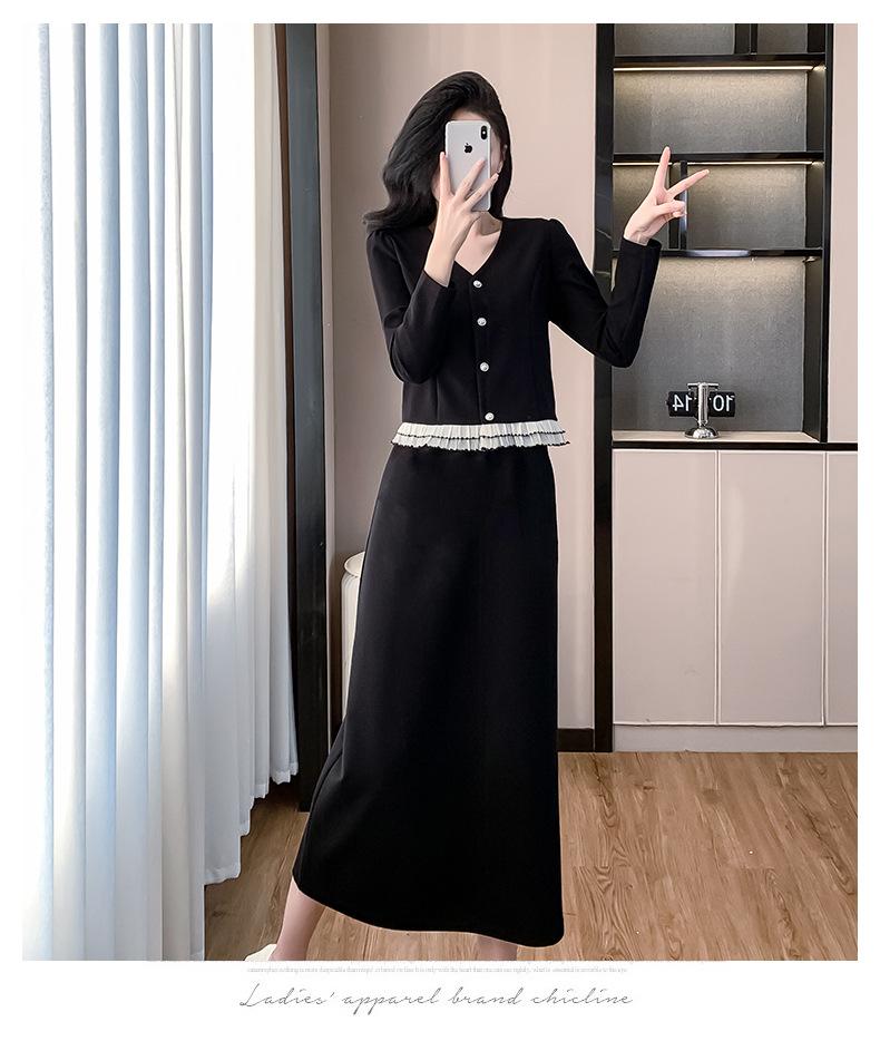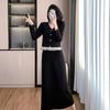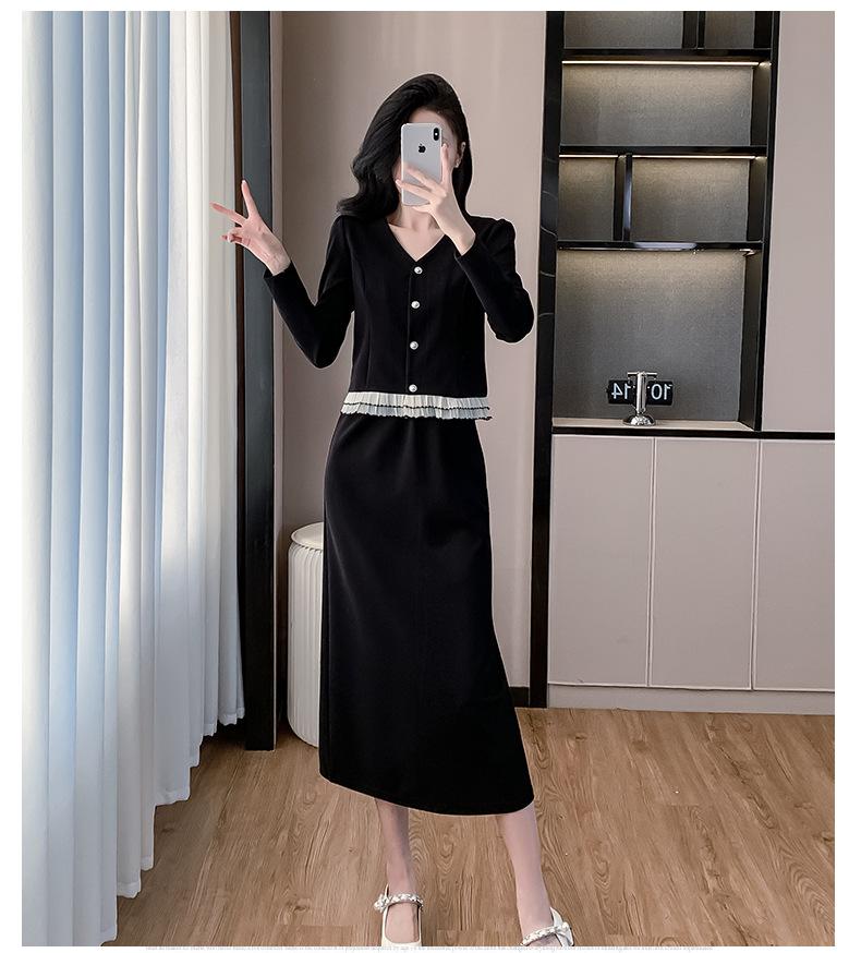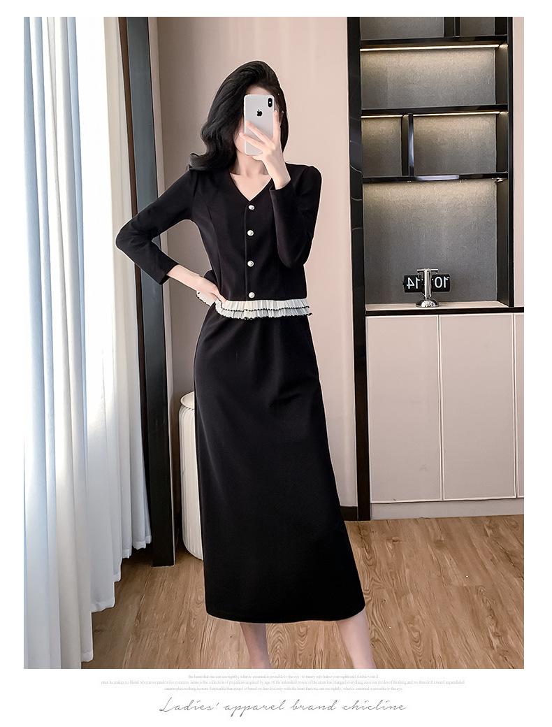 Foto Real del Nuevo Otoño 2025 Cuello en V Solapa Sencilla Acanalado Estilo Pequeño Fragante Falda Larga Traje de Dos Piezas