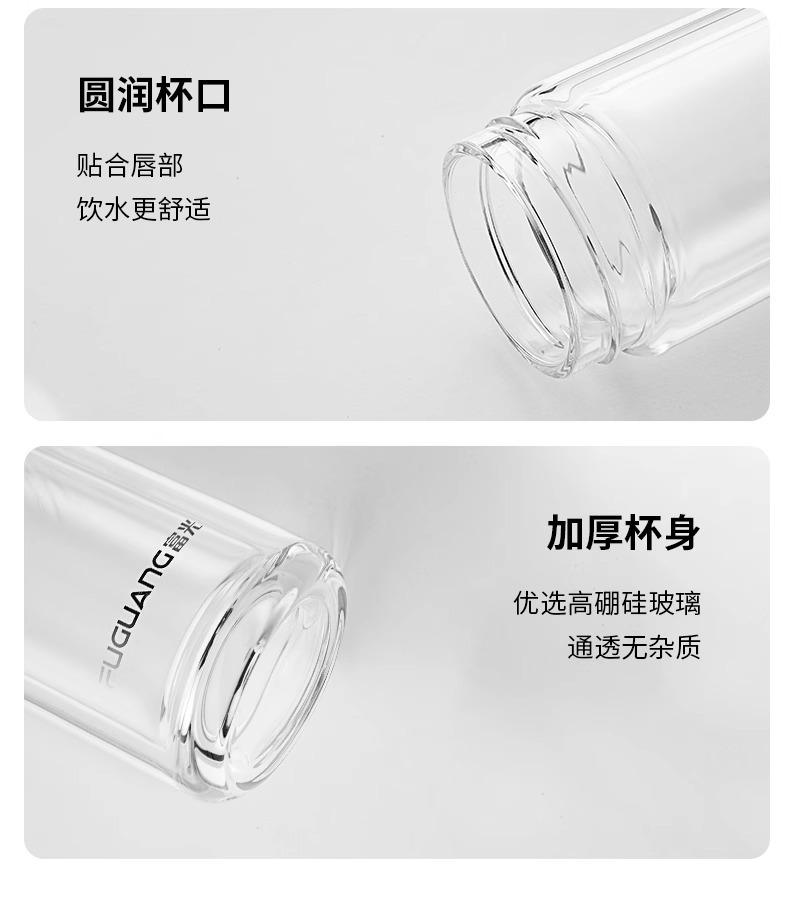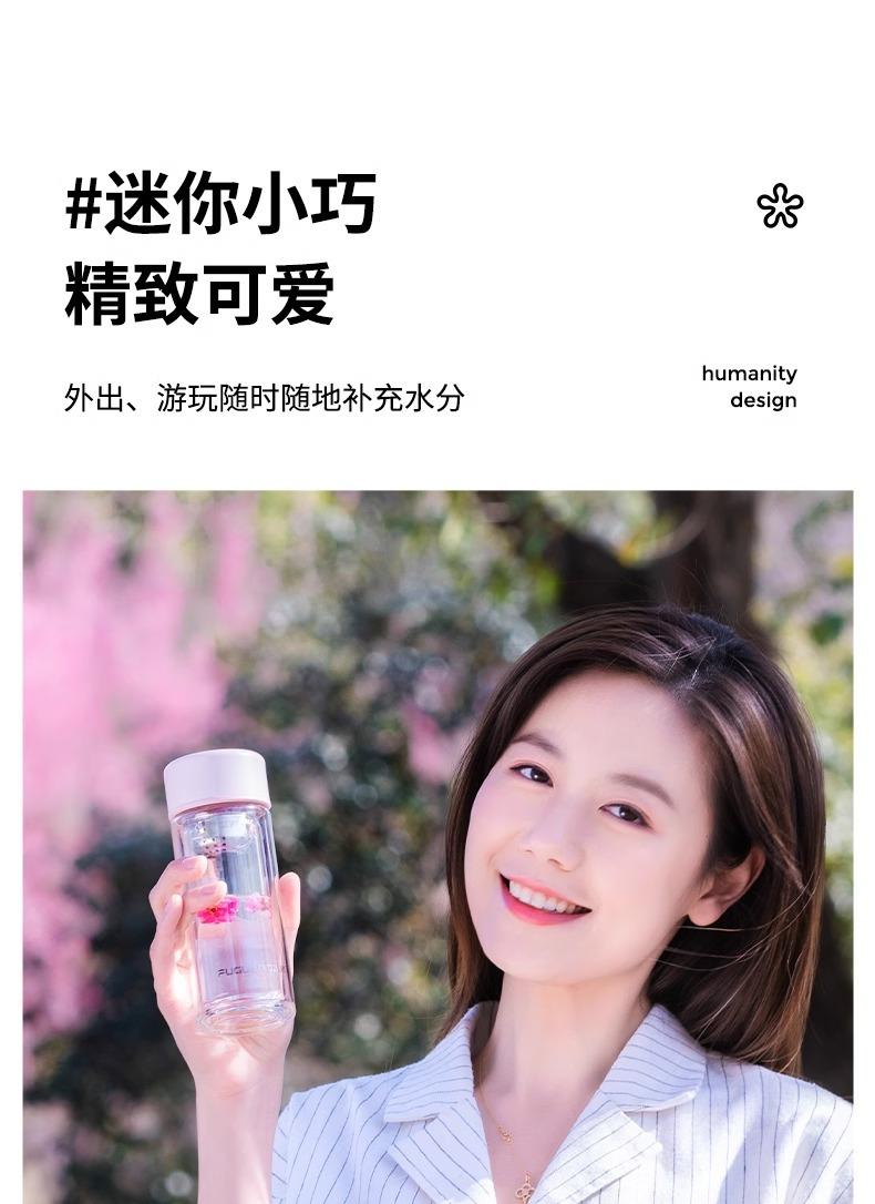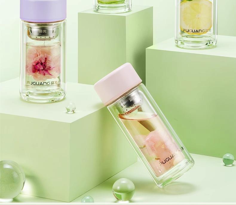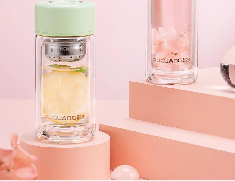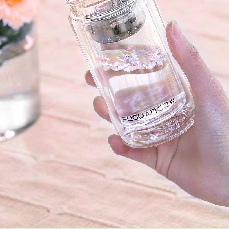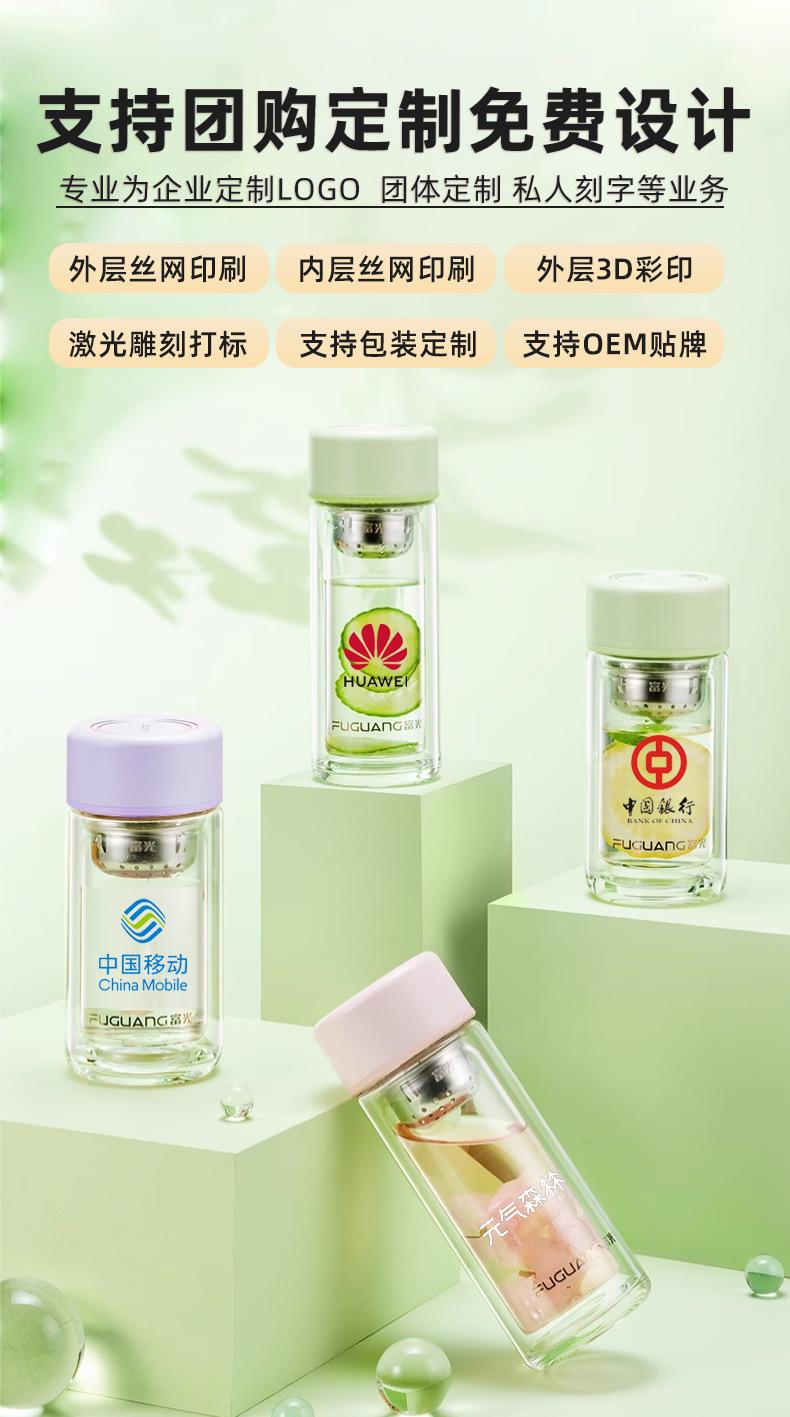 Taza de té de vidrio de doble capa Fuguang para mujer, portátil, de alto valor, mini taza pequeña para beber con letras LOGO