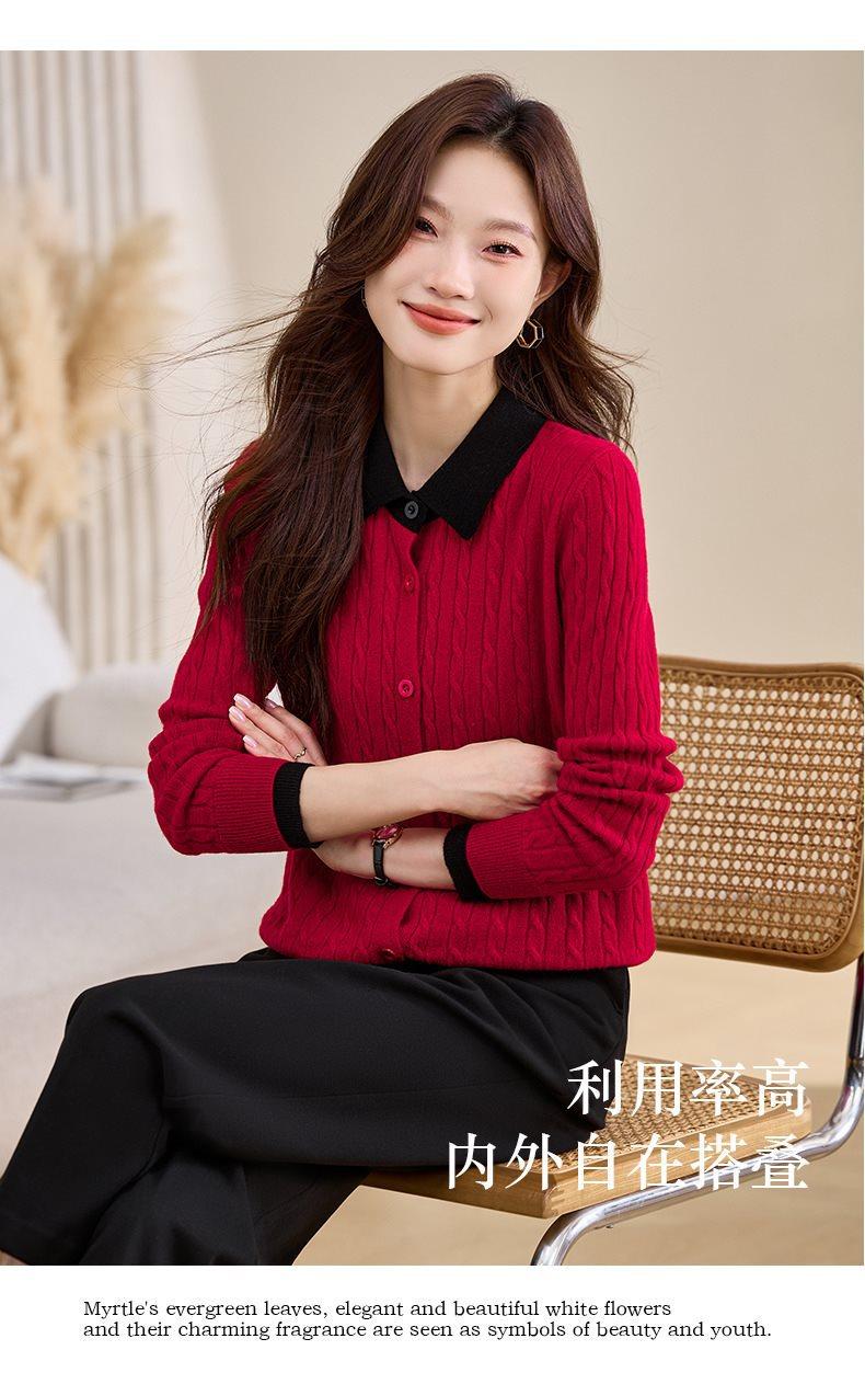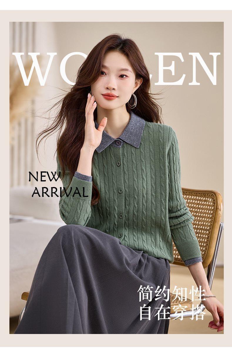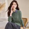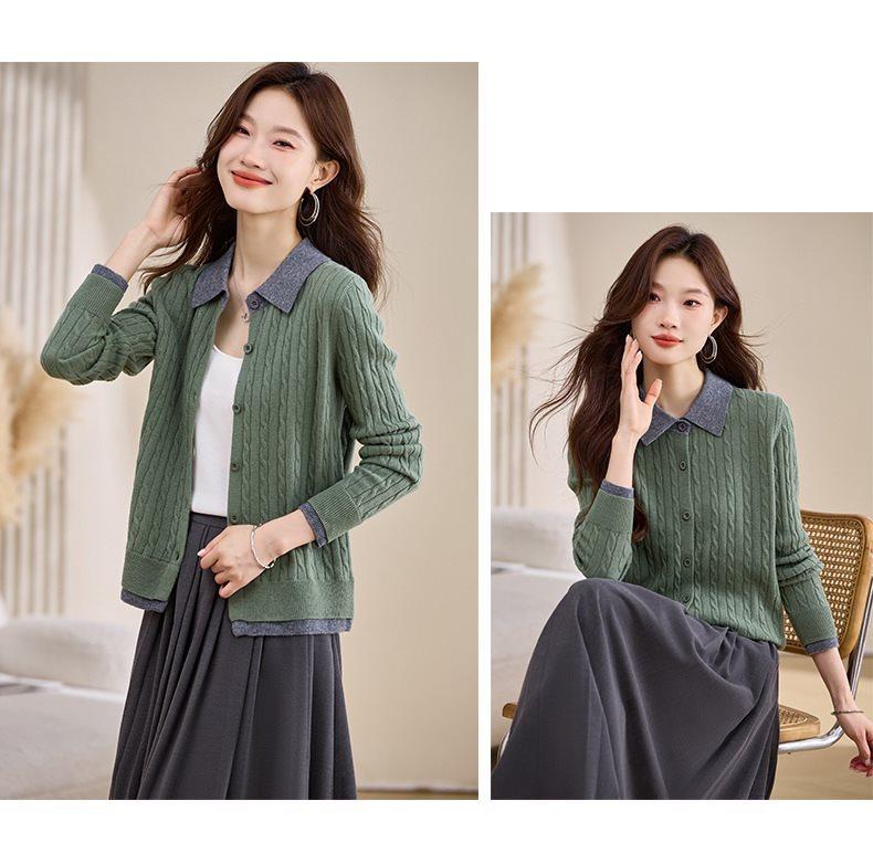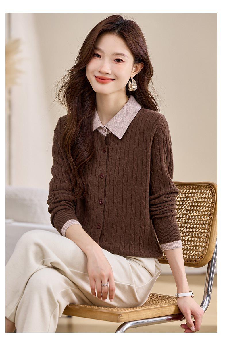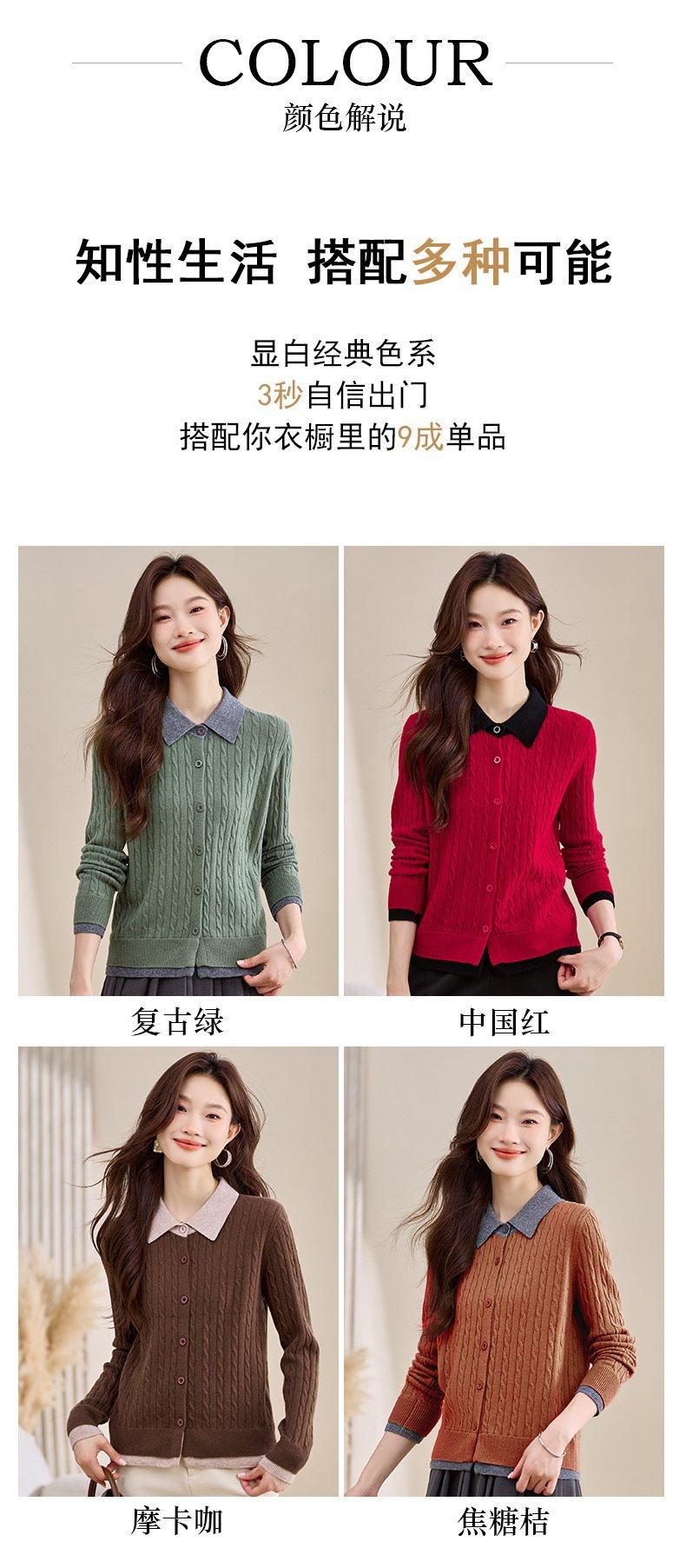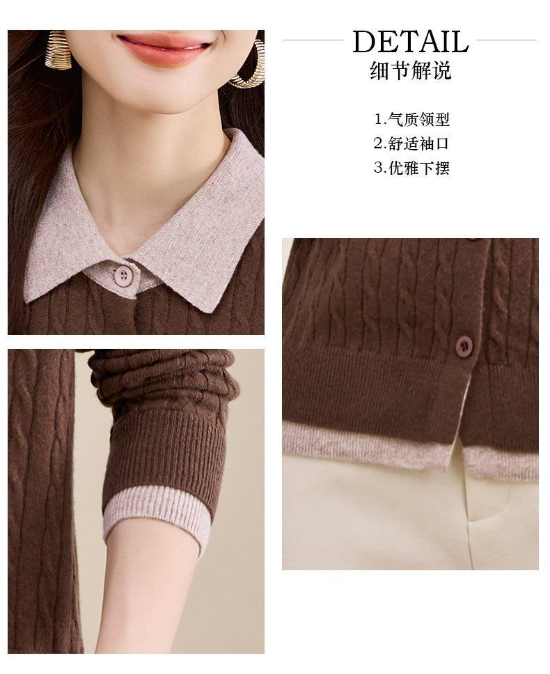 Suéter de lana pura 100% para mujer, cárdigan corto con flores retorcidas para otoño e invierno, cuello polo falso de dos piezas, manga larga, a juego de colores