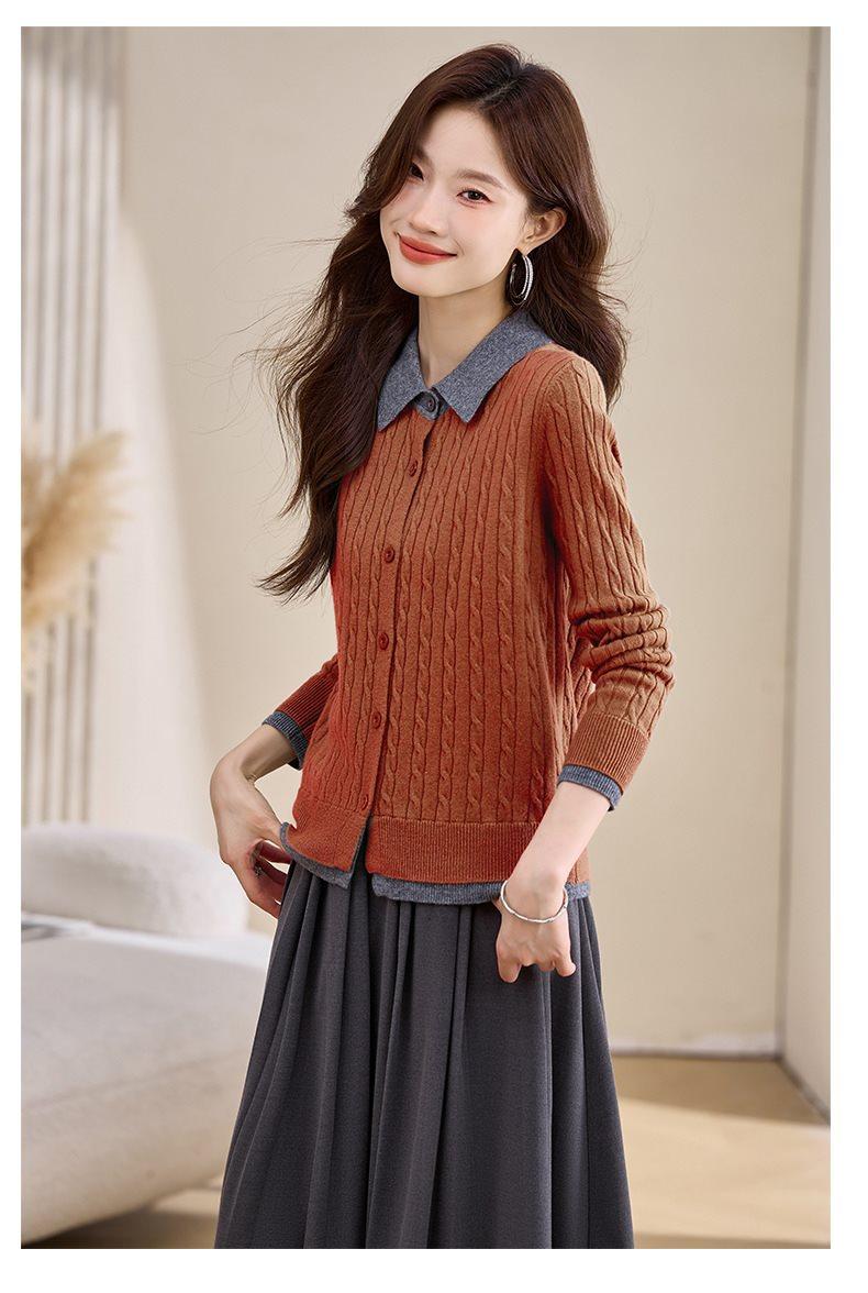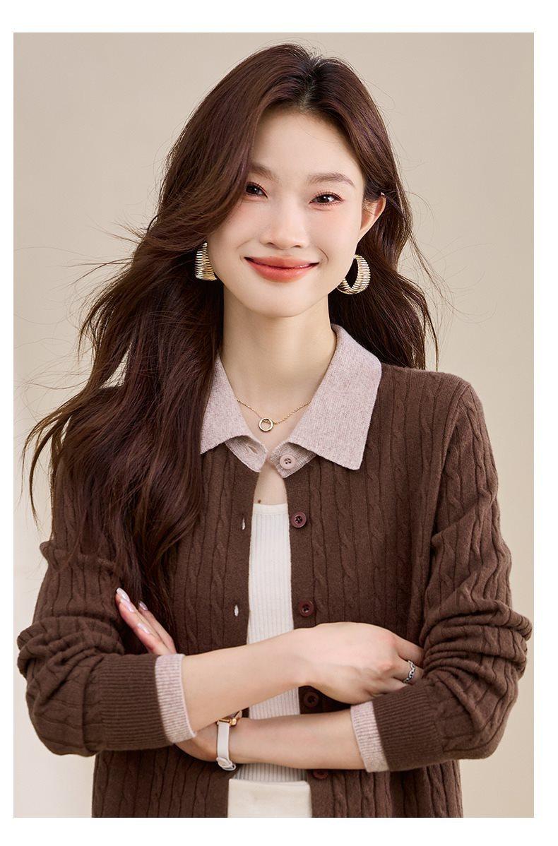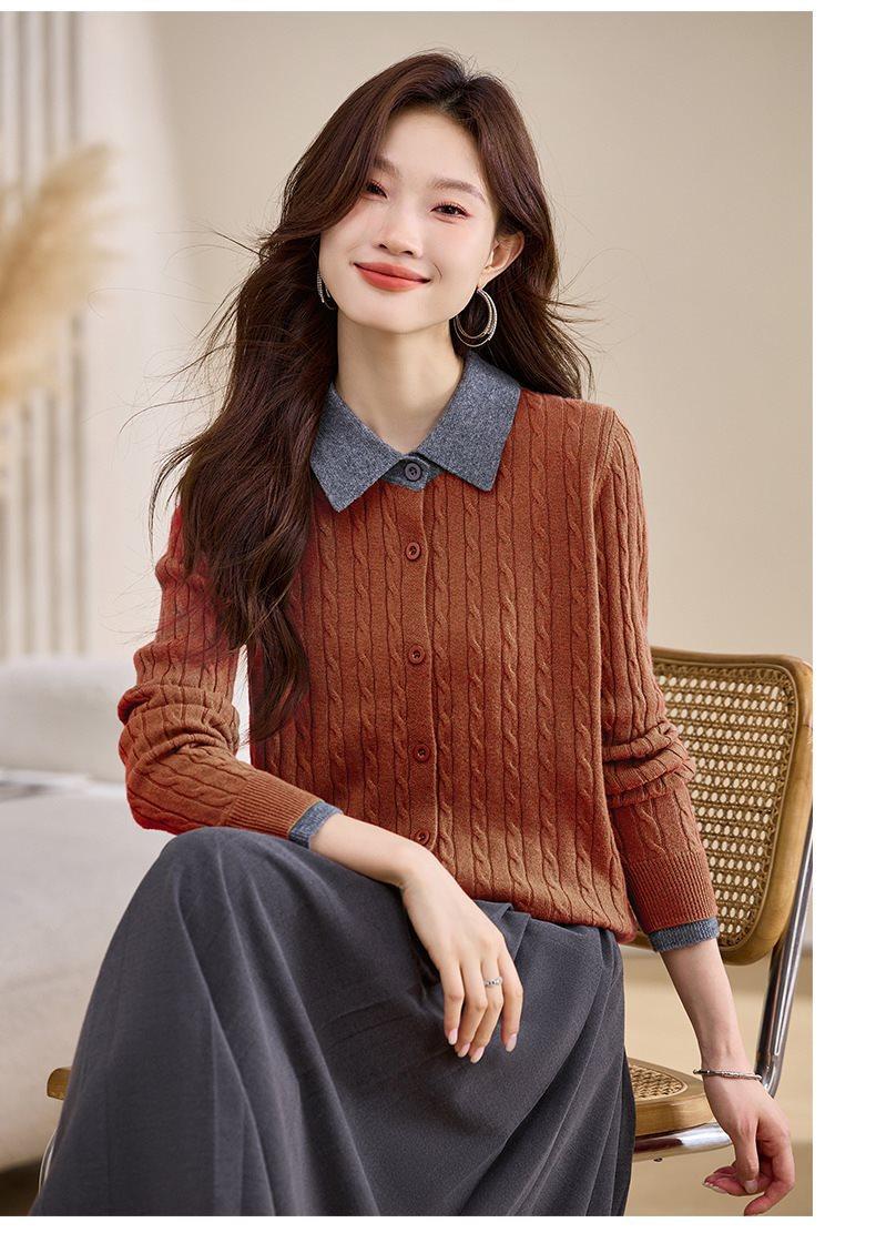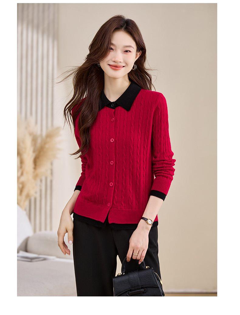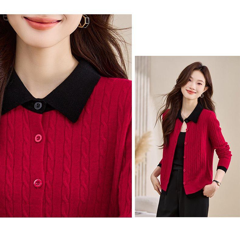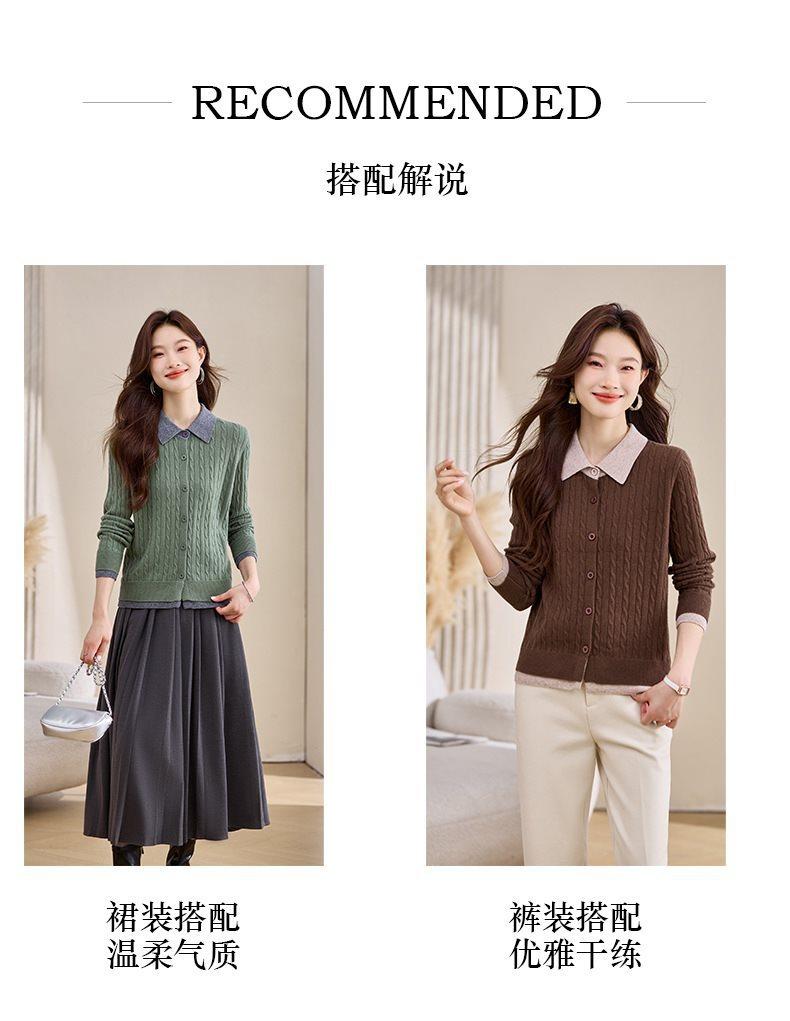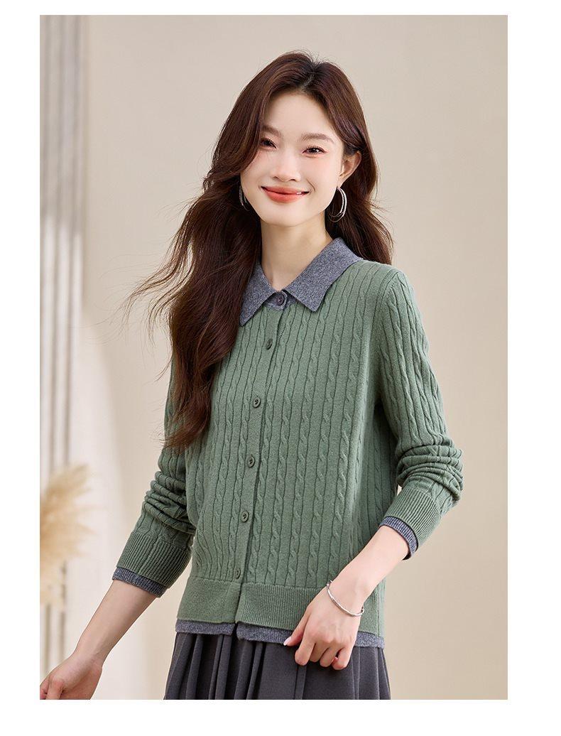 Suéter de lana pura 100% para mujer, cárdigan corto con flores retorcidas para otoño e invierno, cuello polo falso de dos piezas, manga larga, a juego de colores