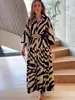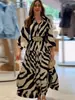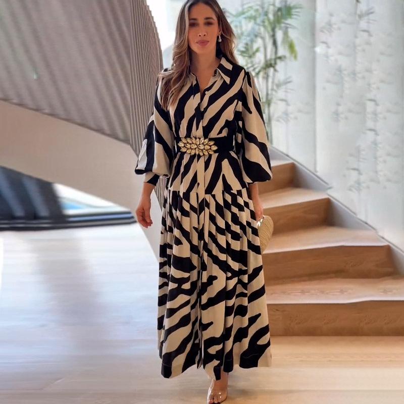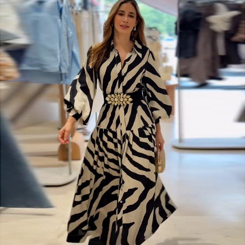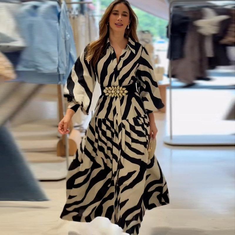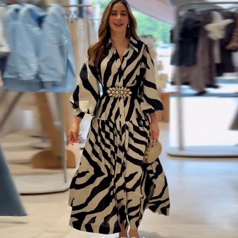 Vestido elegante de verano 2025 para mujer, estilo europeo y americano, con mangas largas y corte entallado, estampado a la moda.