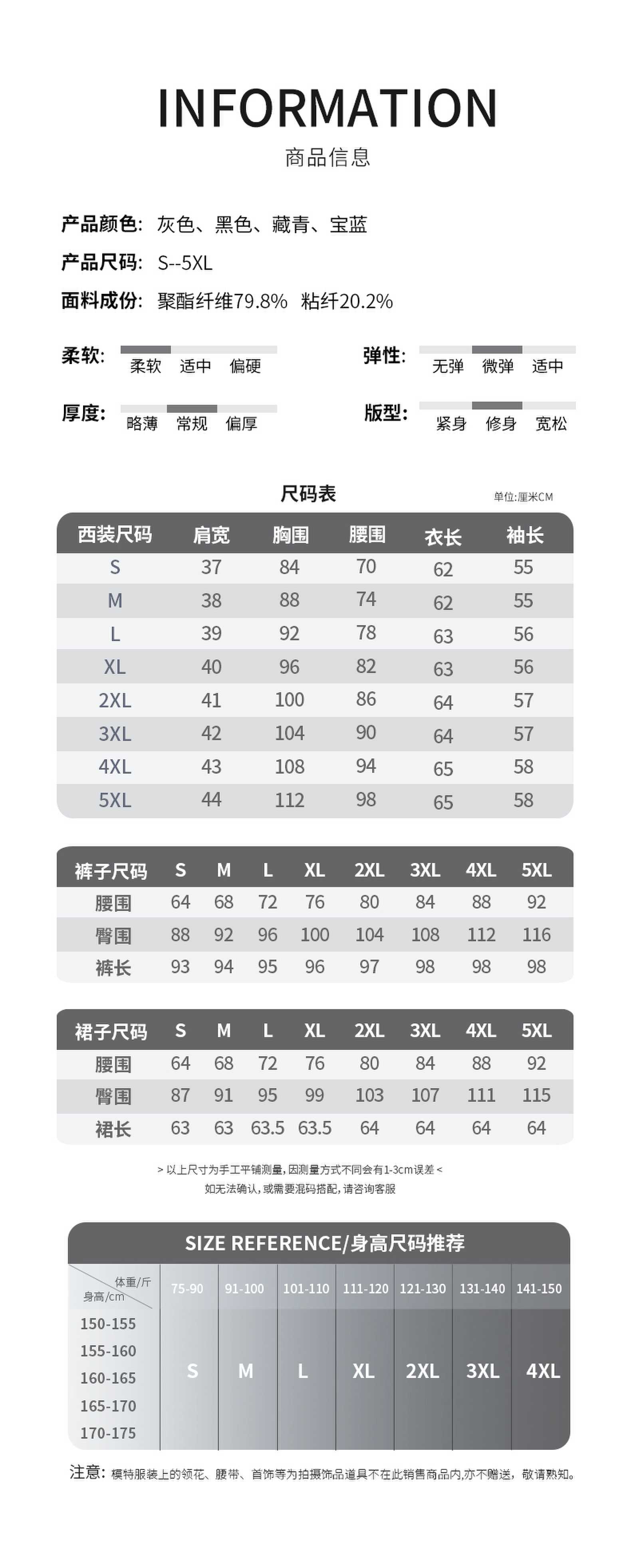 Black one piece suit, Blue one piece suit, Gray one piece suit, Navy blue one piece suit, Black suit + pants, ...