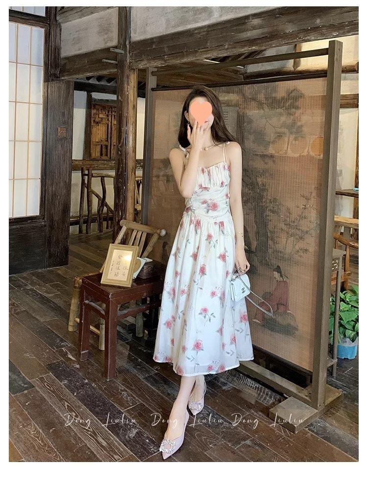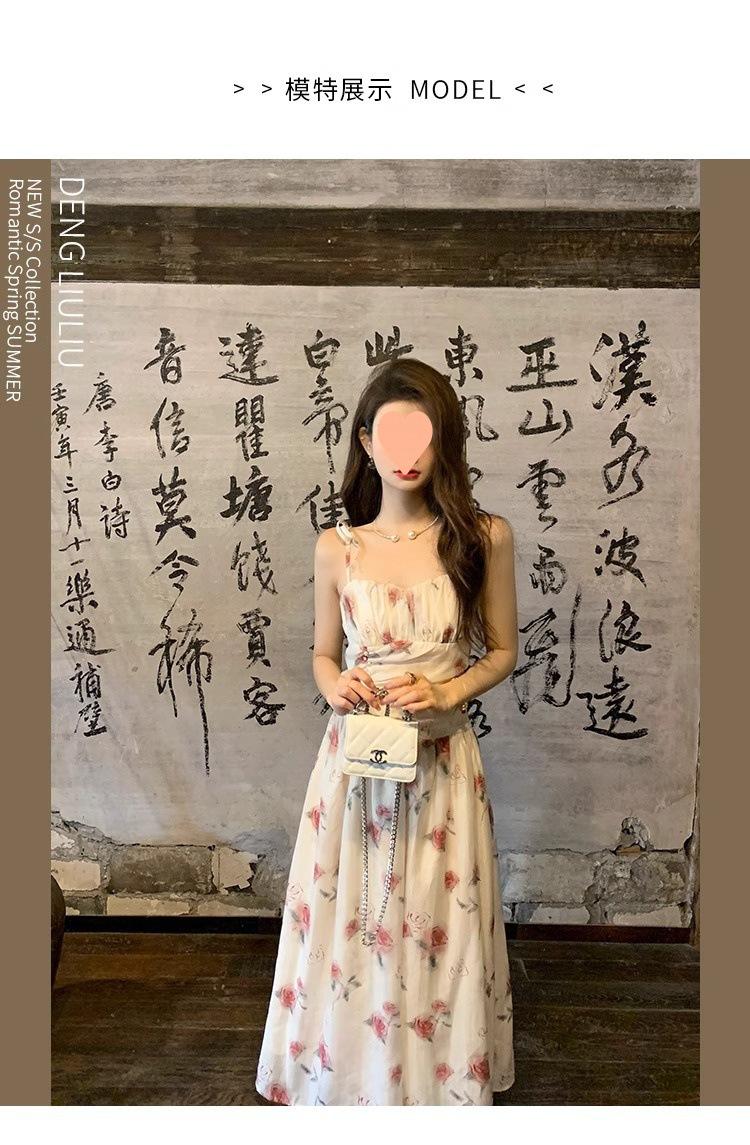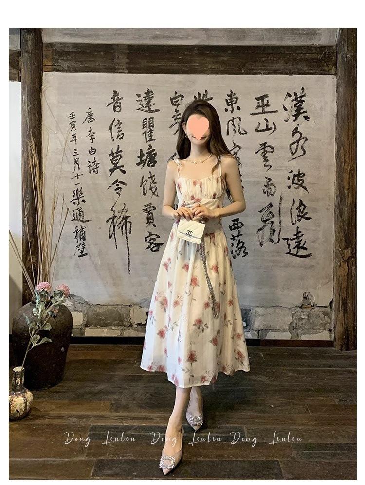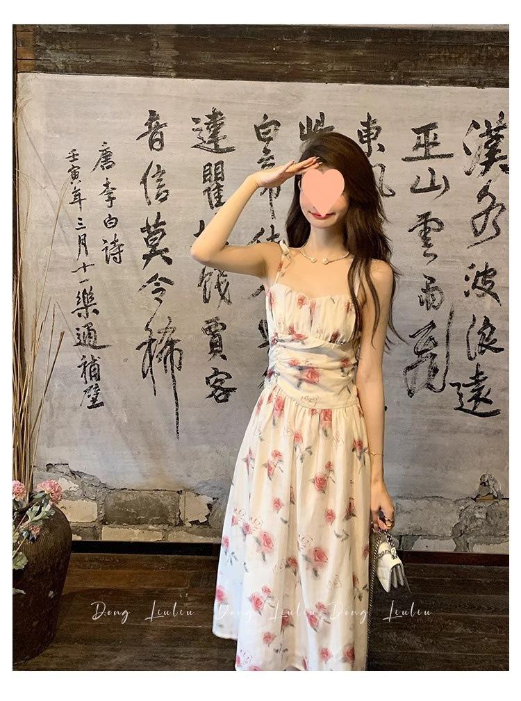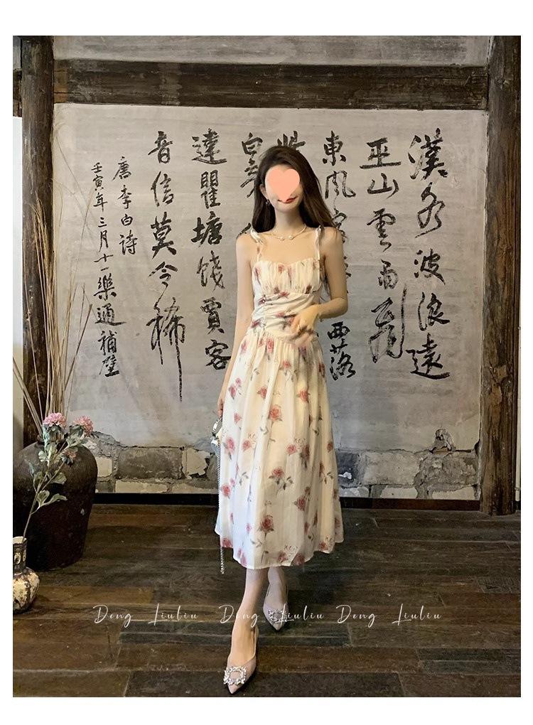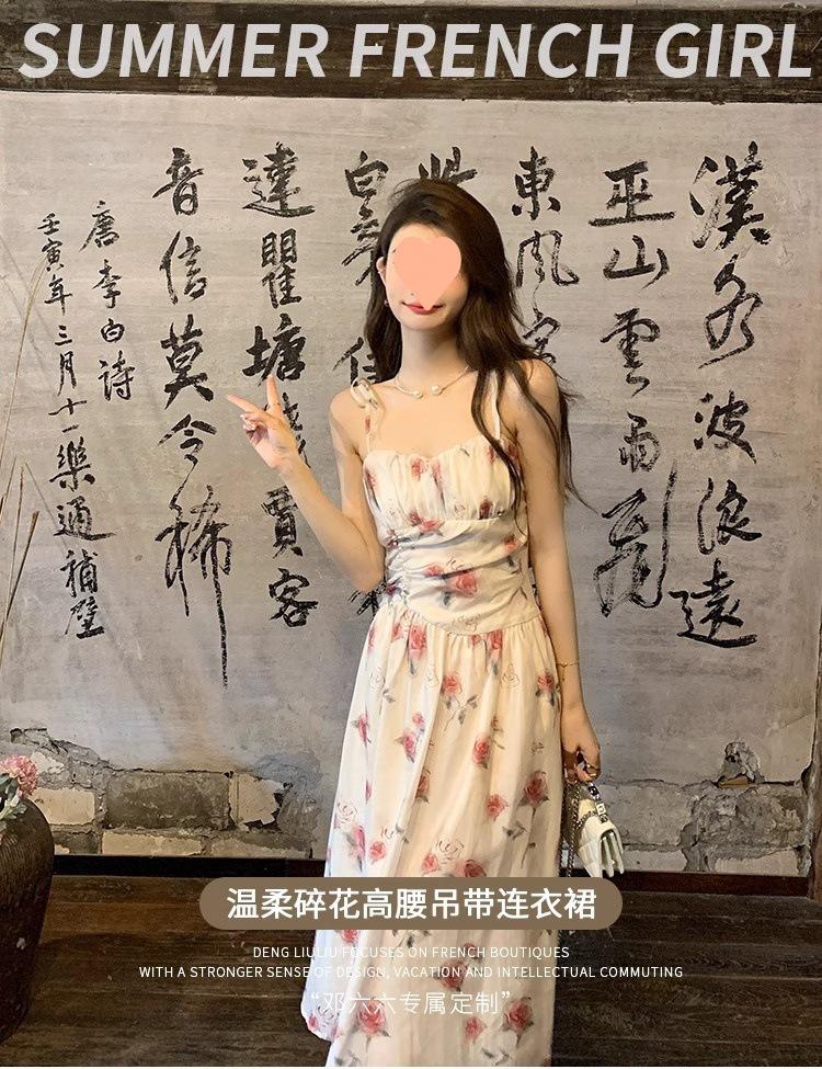Vestido romántico para el descanso del té, verano, nuevo, con tirantes, rosa, cintura francesa, floral, para vacaciones en la playa, falda de hada