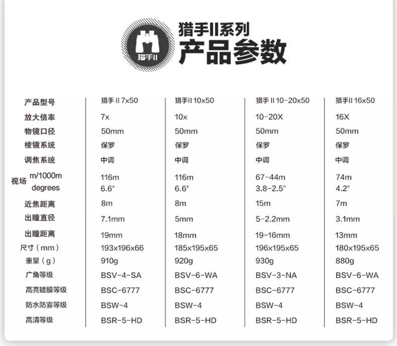 7x50, 10x50, 10-20x50 zoom, 16x50