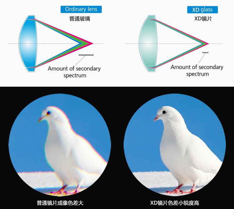 La tecnología óptica de la lente PROMINAR (lente XD) para binoculares se utiliza para condensar el monocular. Para lograr el rendimiento de los binoculares, se utilizan 4 piezas (2 piezas x 2) de lente XD (vidrio de dispersión extra baja) con dispersión parcial especial en la lente objetivo, y se utiliza una lente de dispersión parcial especial en la lente cóncava, lo que reduce la aberración cromática y realiza un campo de visión de alto contraste. La aberración cromática restante que no ha sido eliminada por la lente acromática se reduce en mayor medida, asegurando una mejor presentación de la imagen.