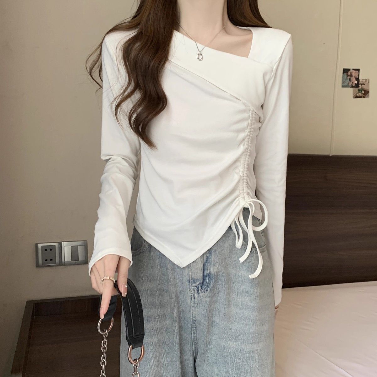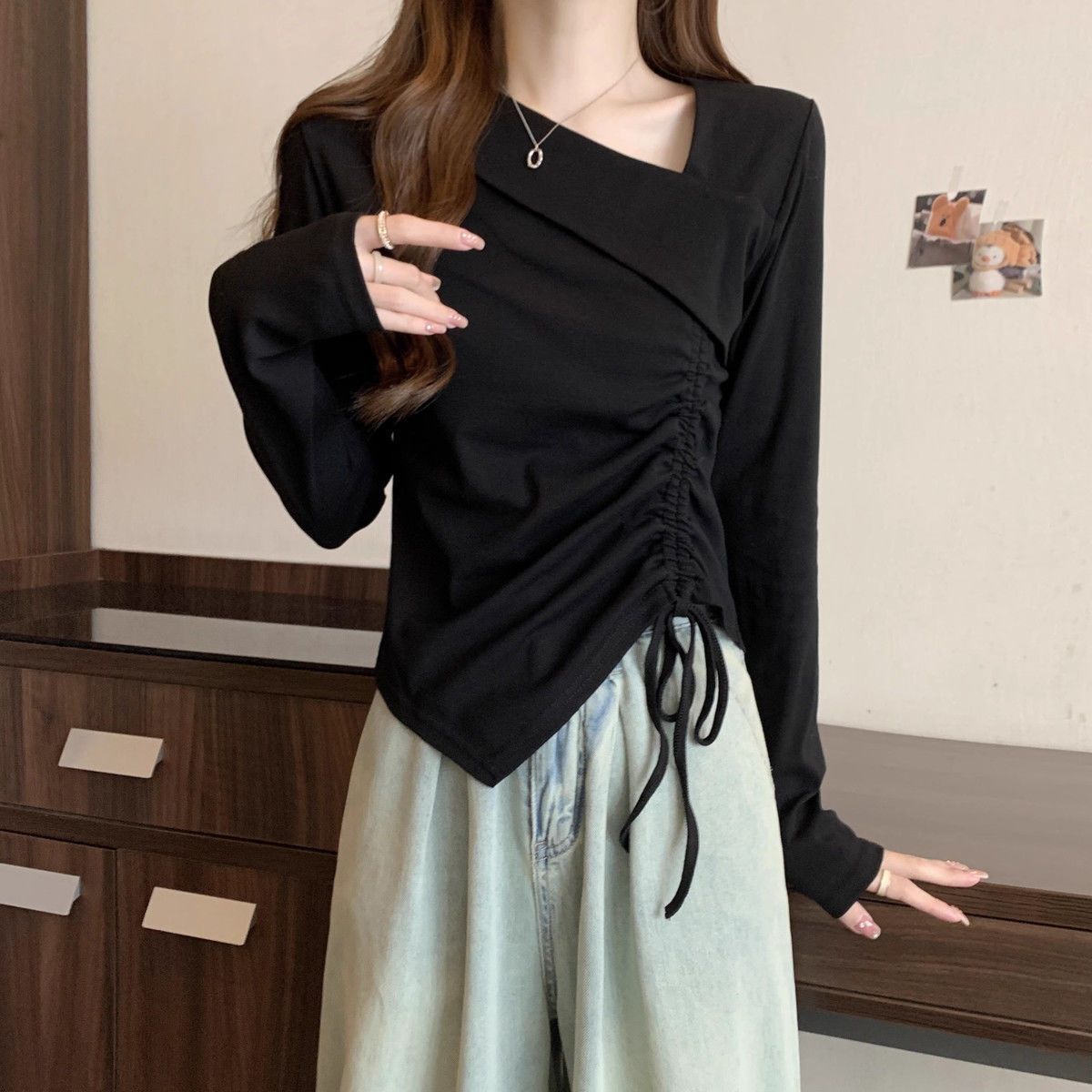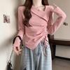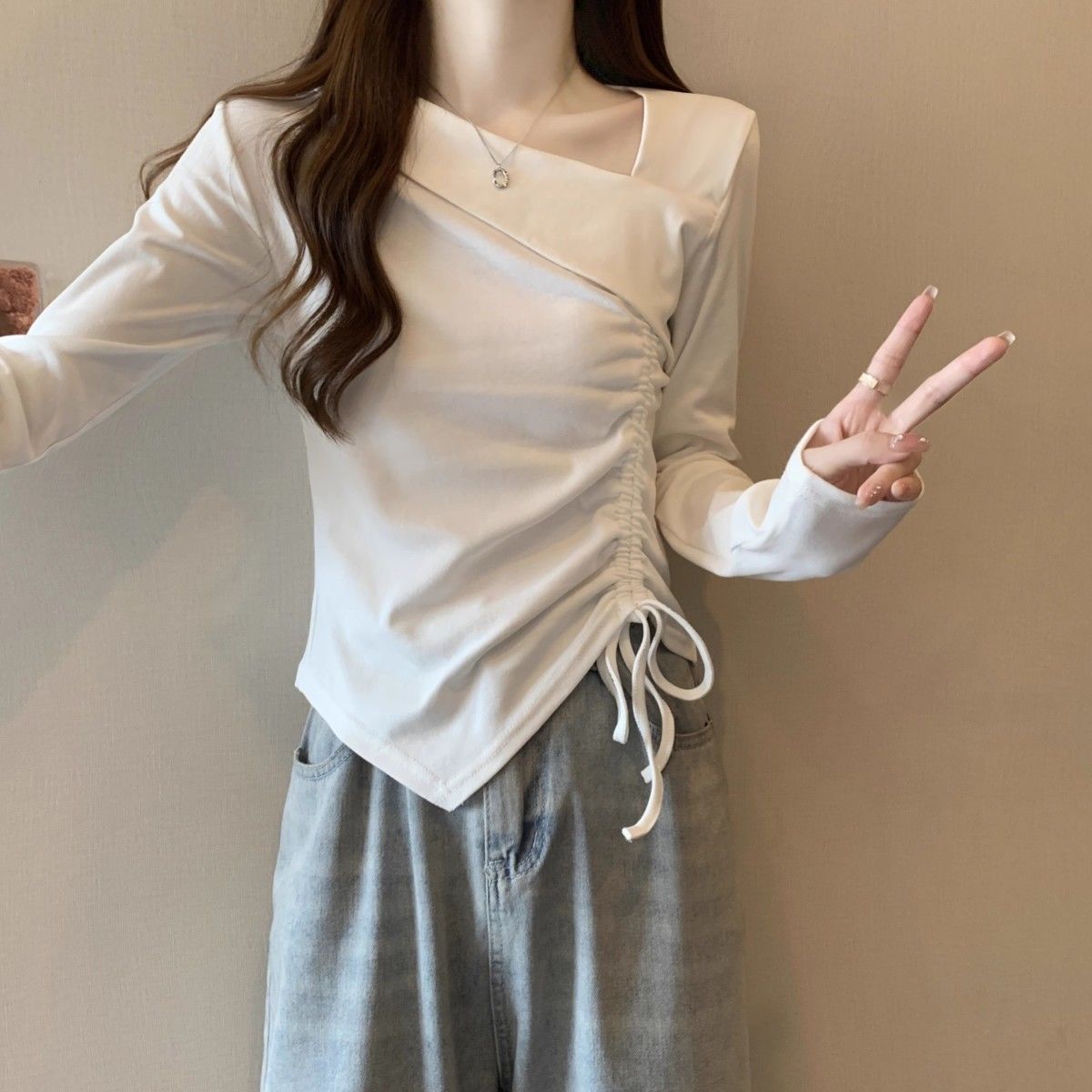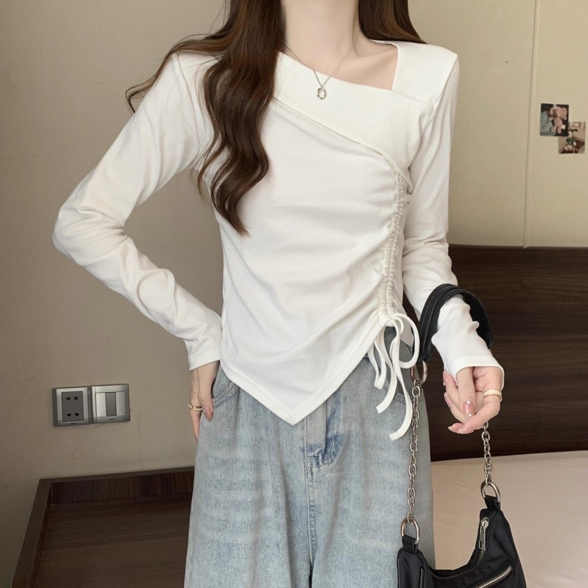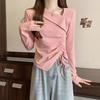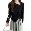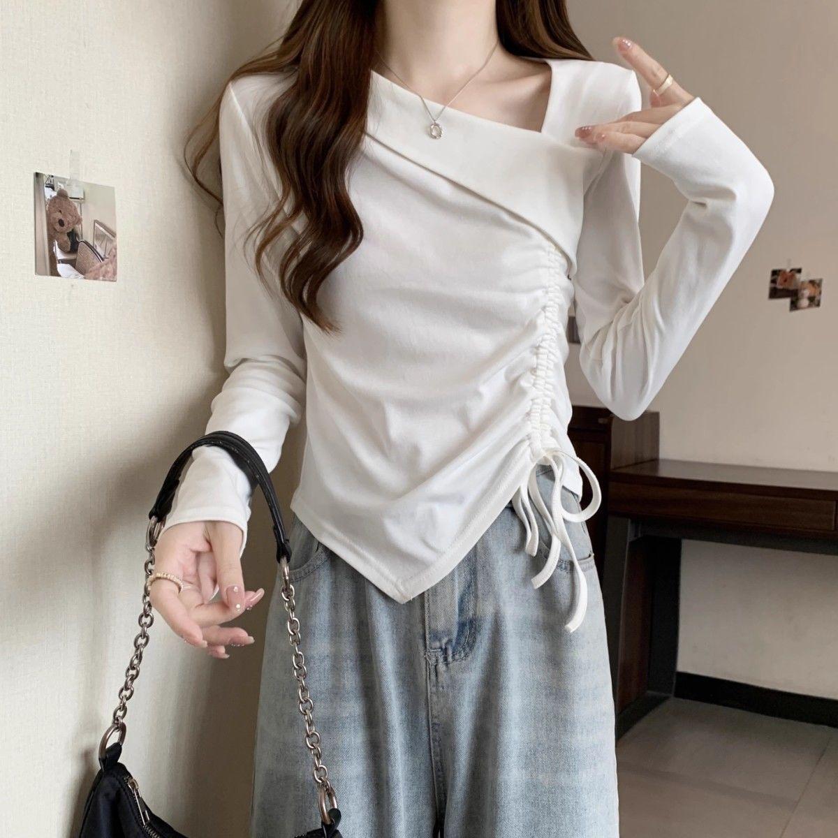 Camiseta de manga larga irregular chic de talla grande para mujer, diseño de otoño, camisa con base de cordón, top interior adelgazante para chica gordita