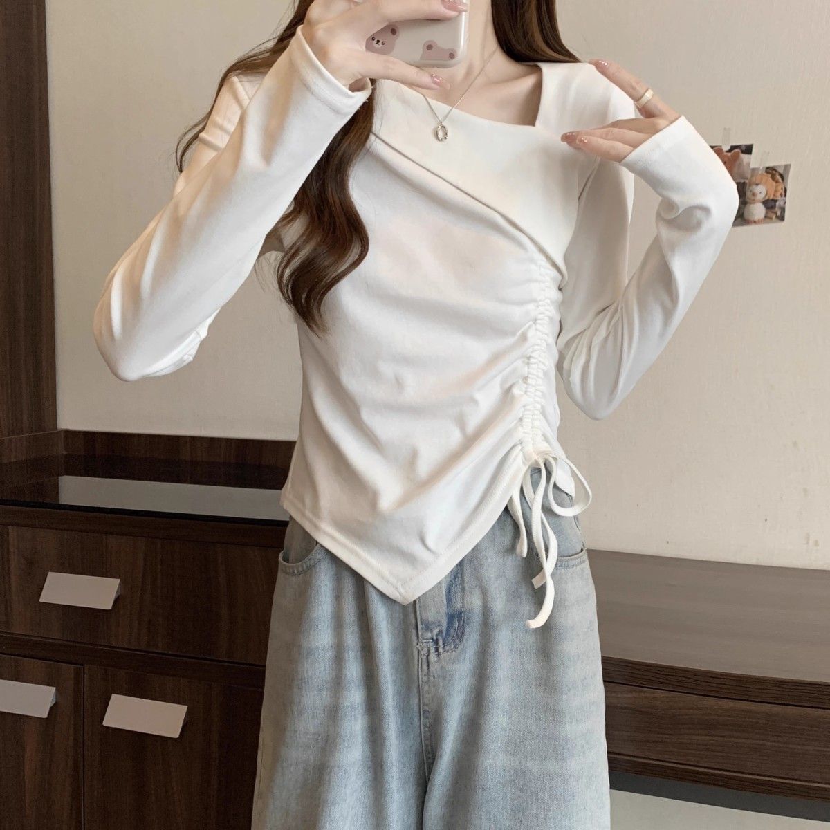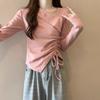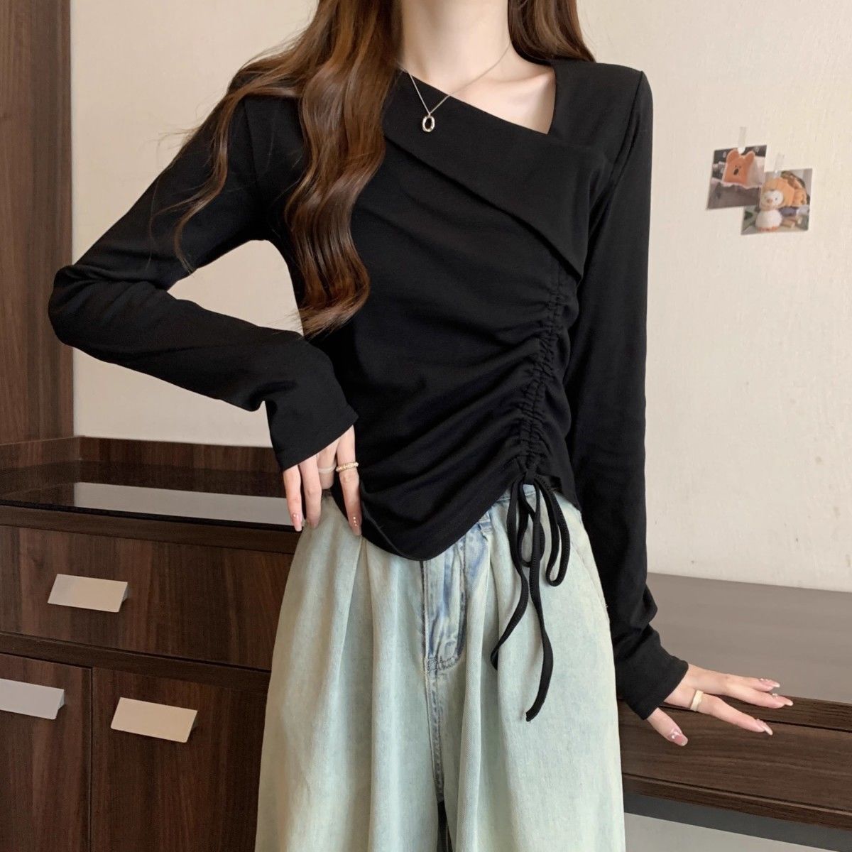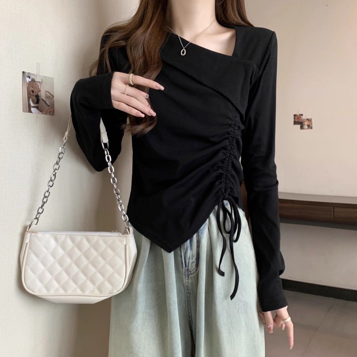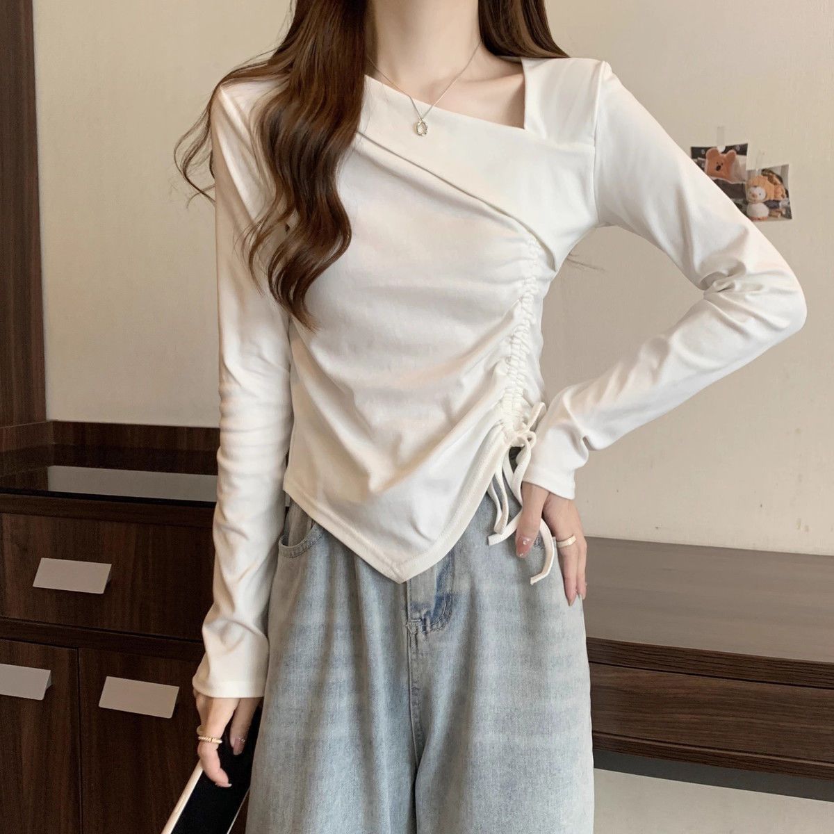 Camiseta de manga larga irregular chic de talla grande para mujer, diseño de otoño, camisa con base de cordón, top interior adelgazante para chica gordita
