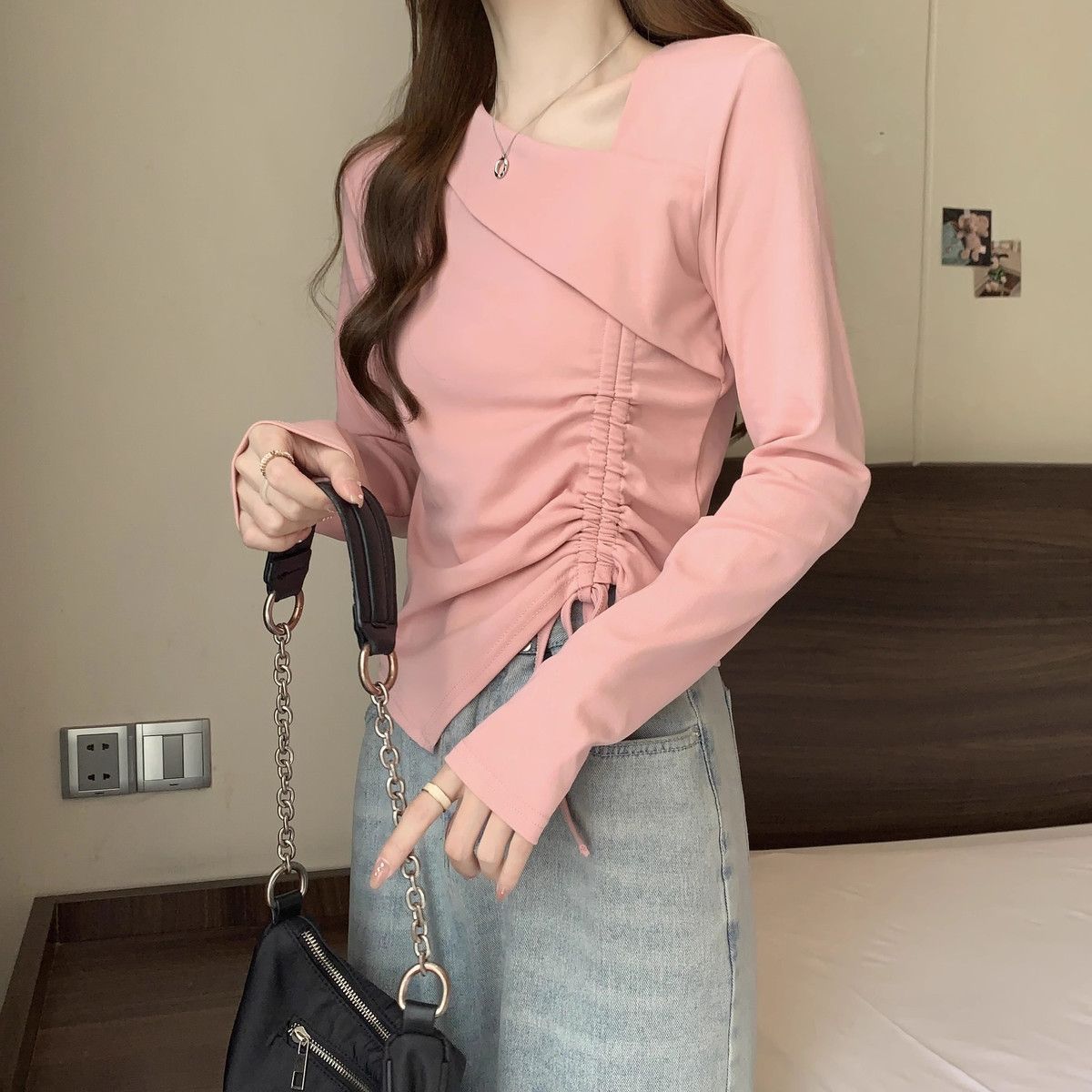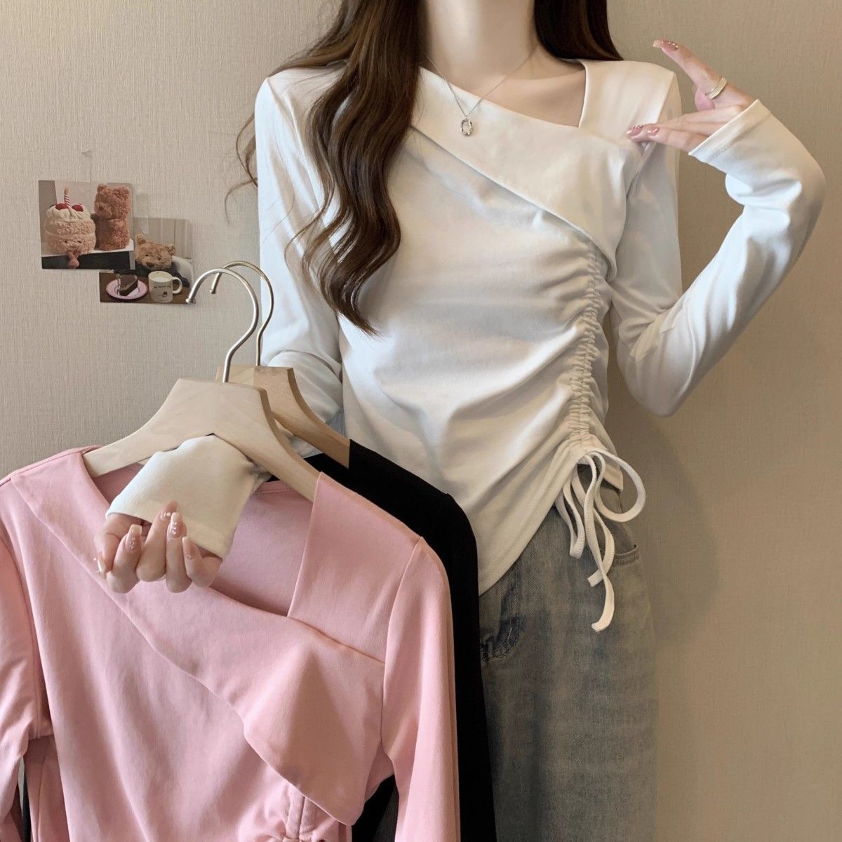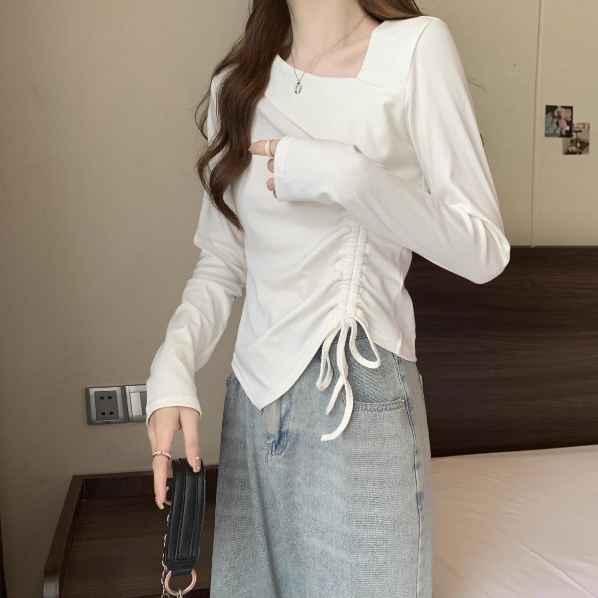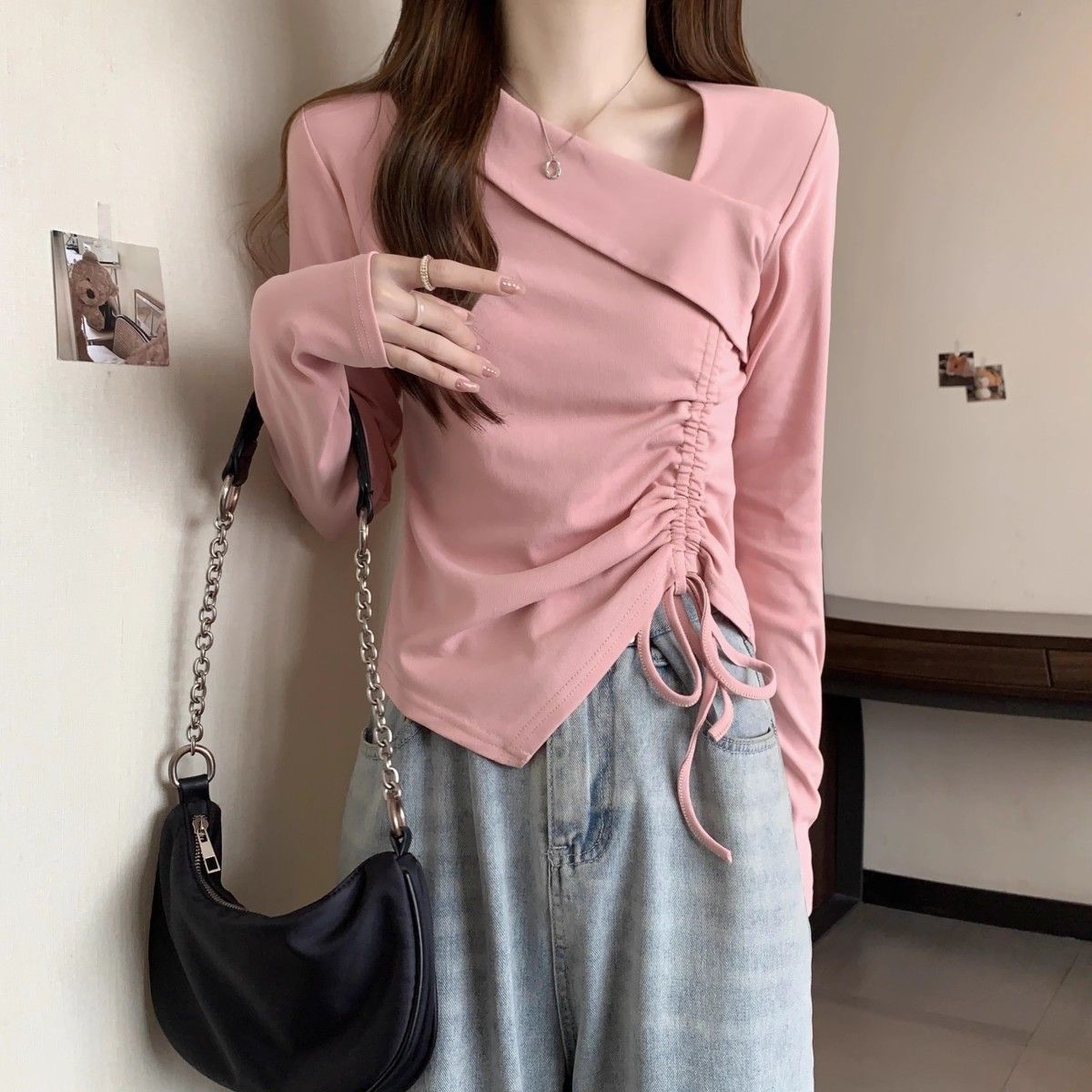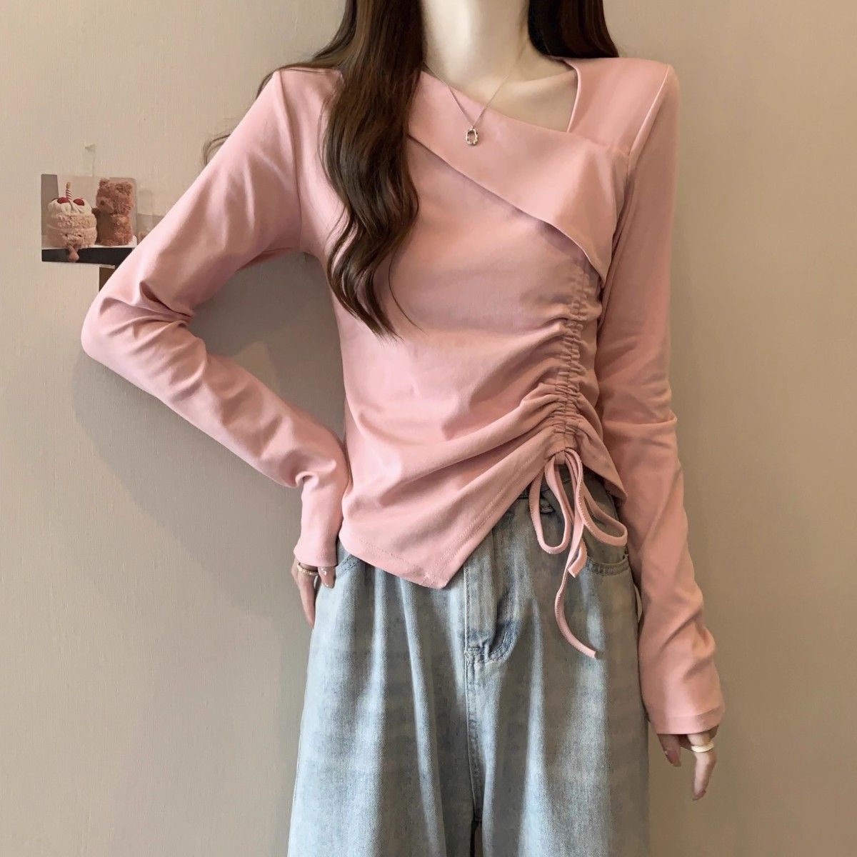 Camiseta de manga larga irregular chic de talla grande para mujer, diseño de otoño, camisa con base de cordón, top interior adelgazante para chica gordita