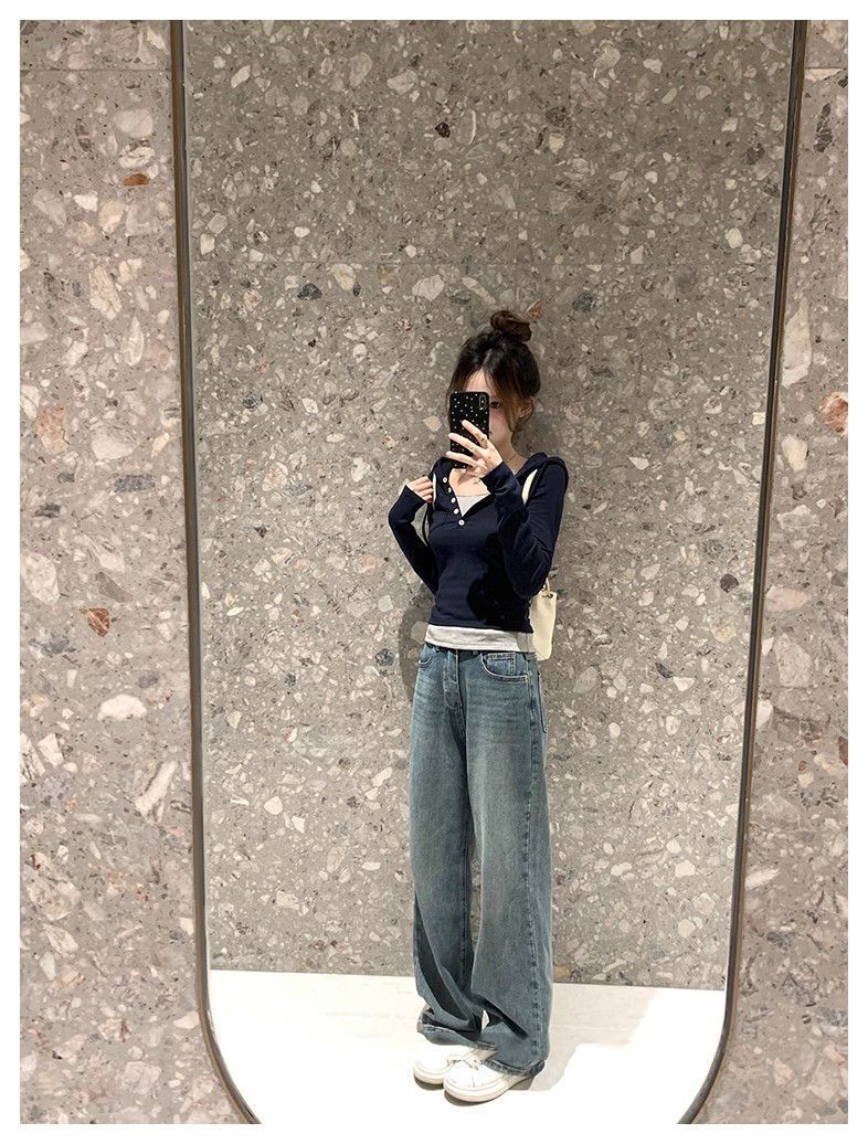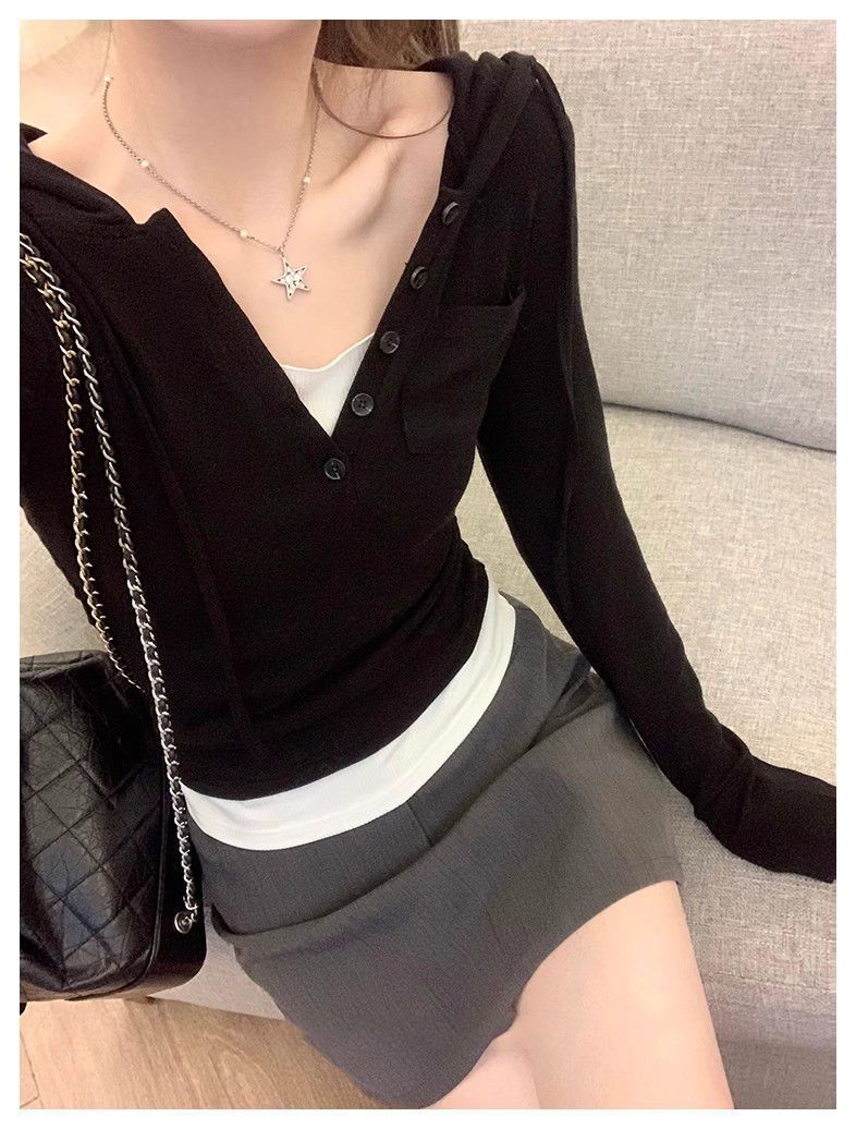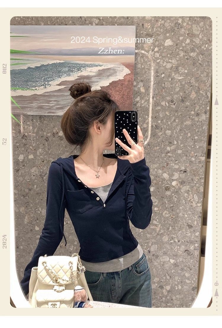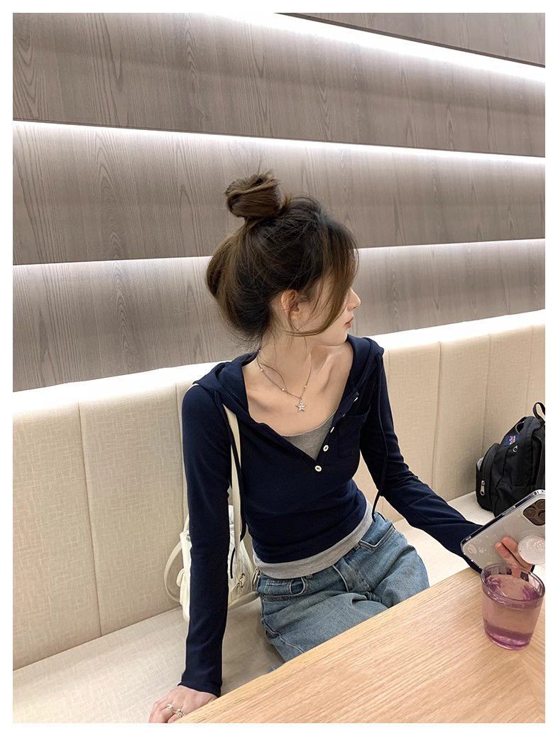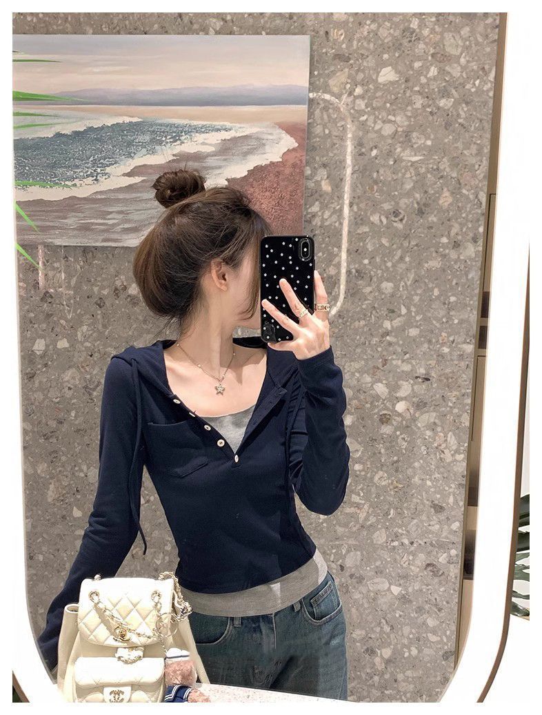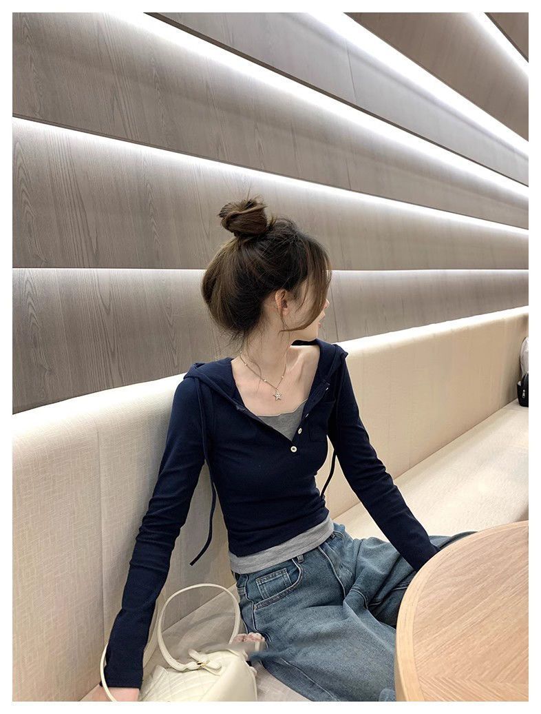 Camiseta de manga larga con capucha de dos piezas, informal, ajustada y adelgazante, de primavera y otoño, con diseño de nicho y temperamento femenino.