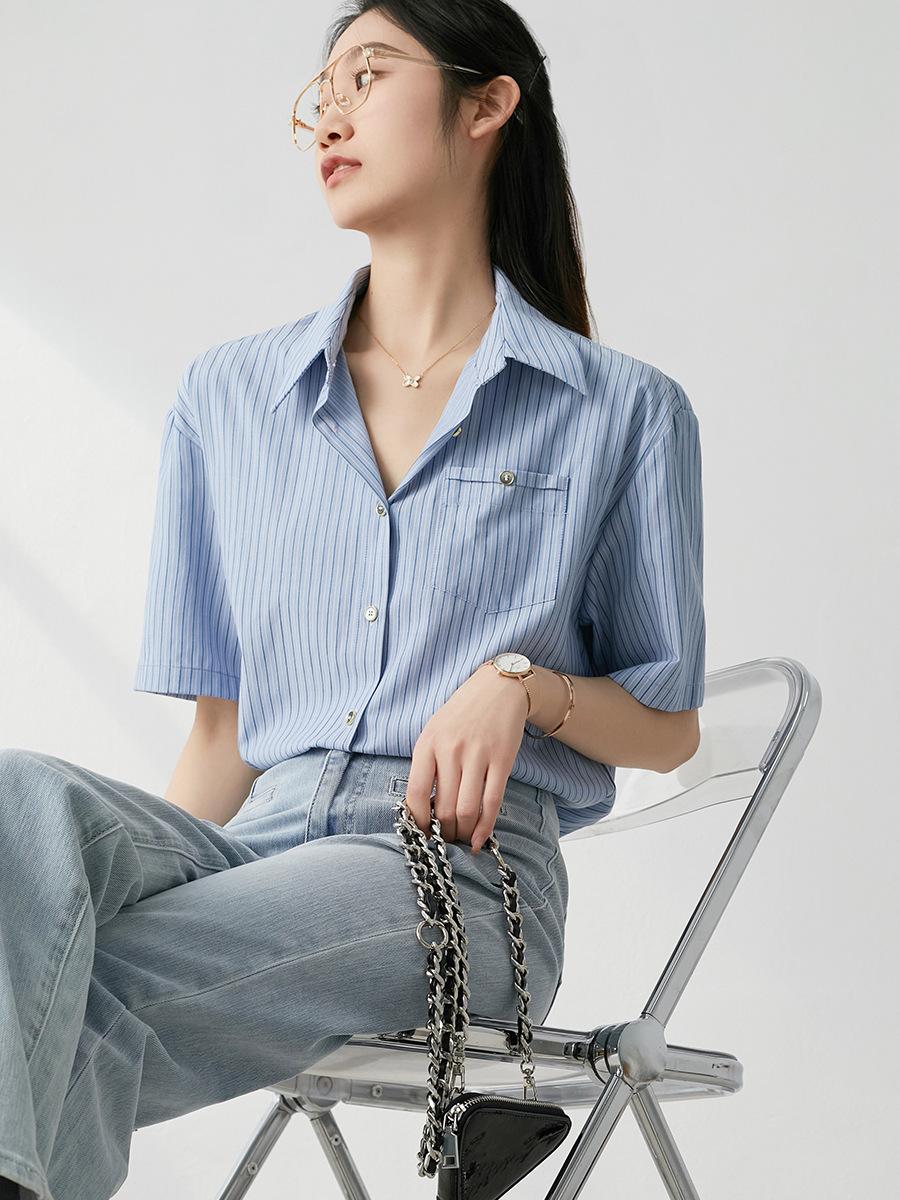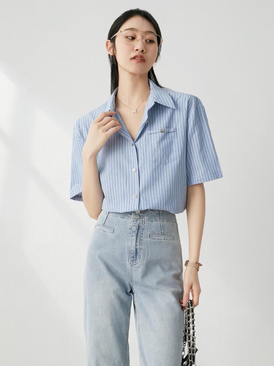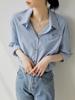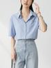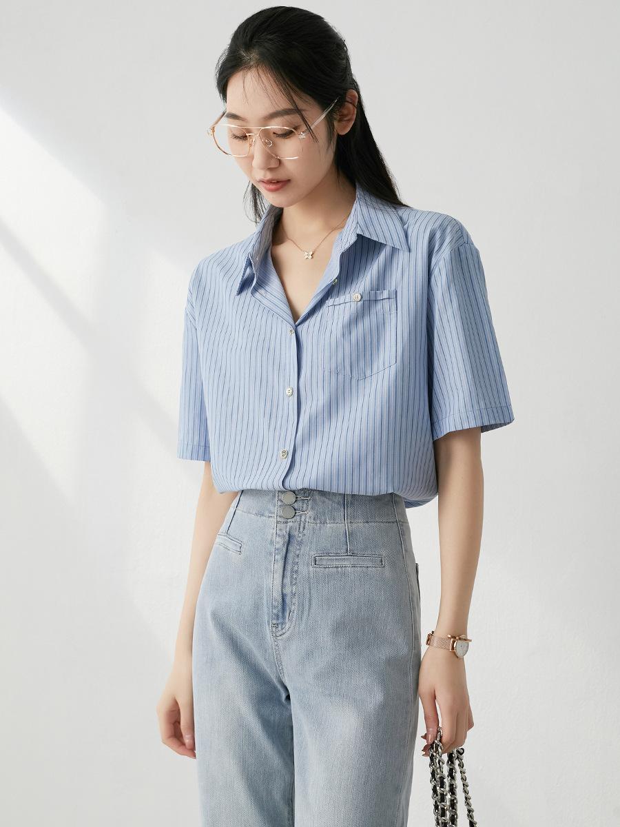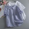 Camisa de manga corta a rayas azules estilo Hong Kong para mujer, nueva camisa de verano retro holgada que combina con todo, con un diseño de estilo urbano.