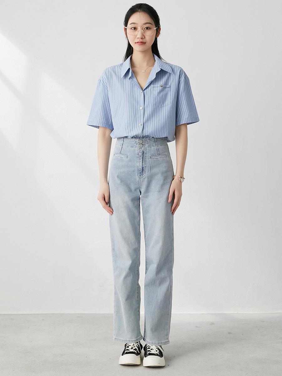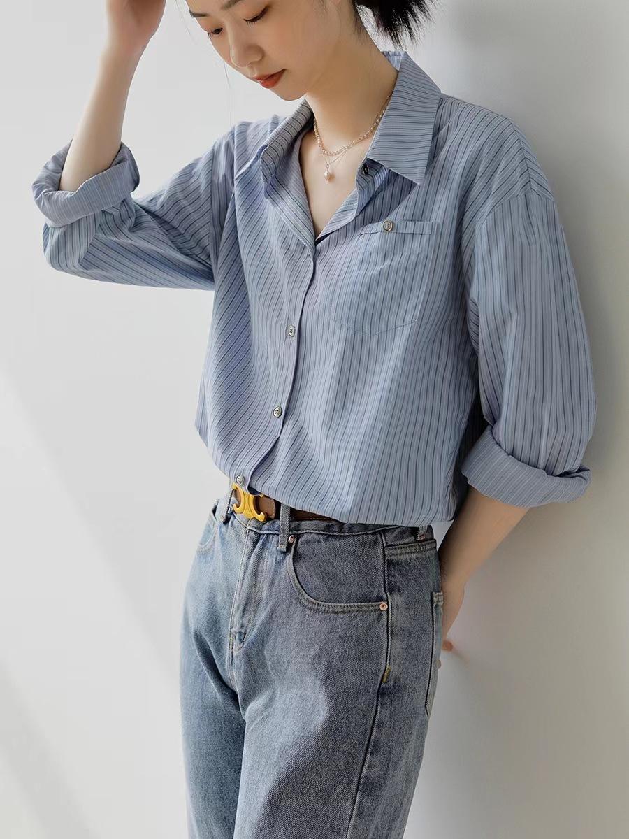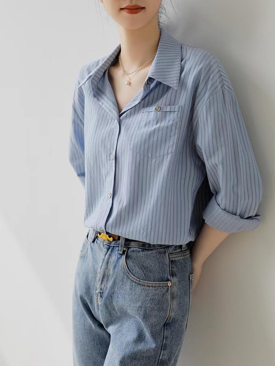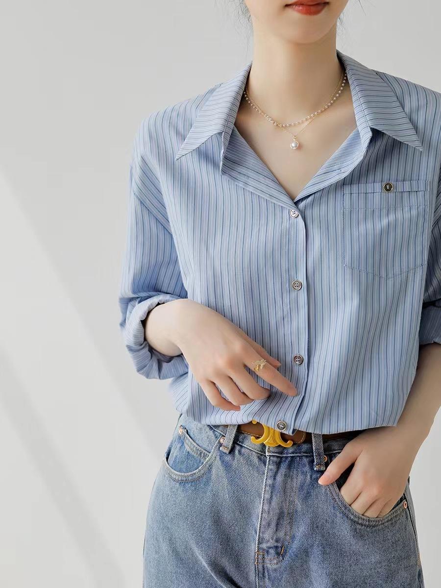Camisa de manga corta a rayas azules estilo Hong Kong para mujer, nueva camisa de verano retro holgada que combina con todo, con un diseño de estilo urbano.