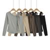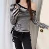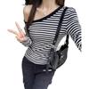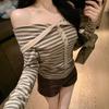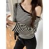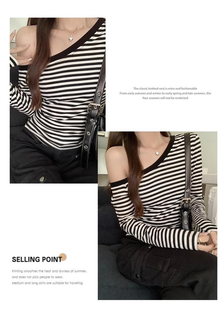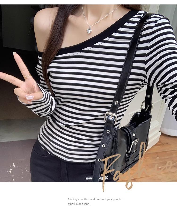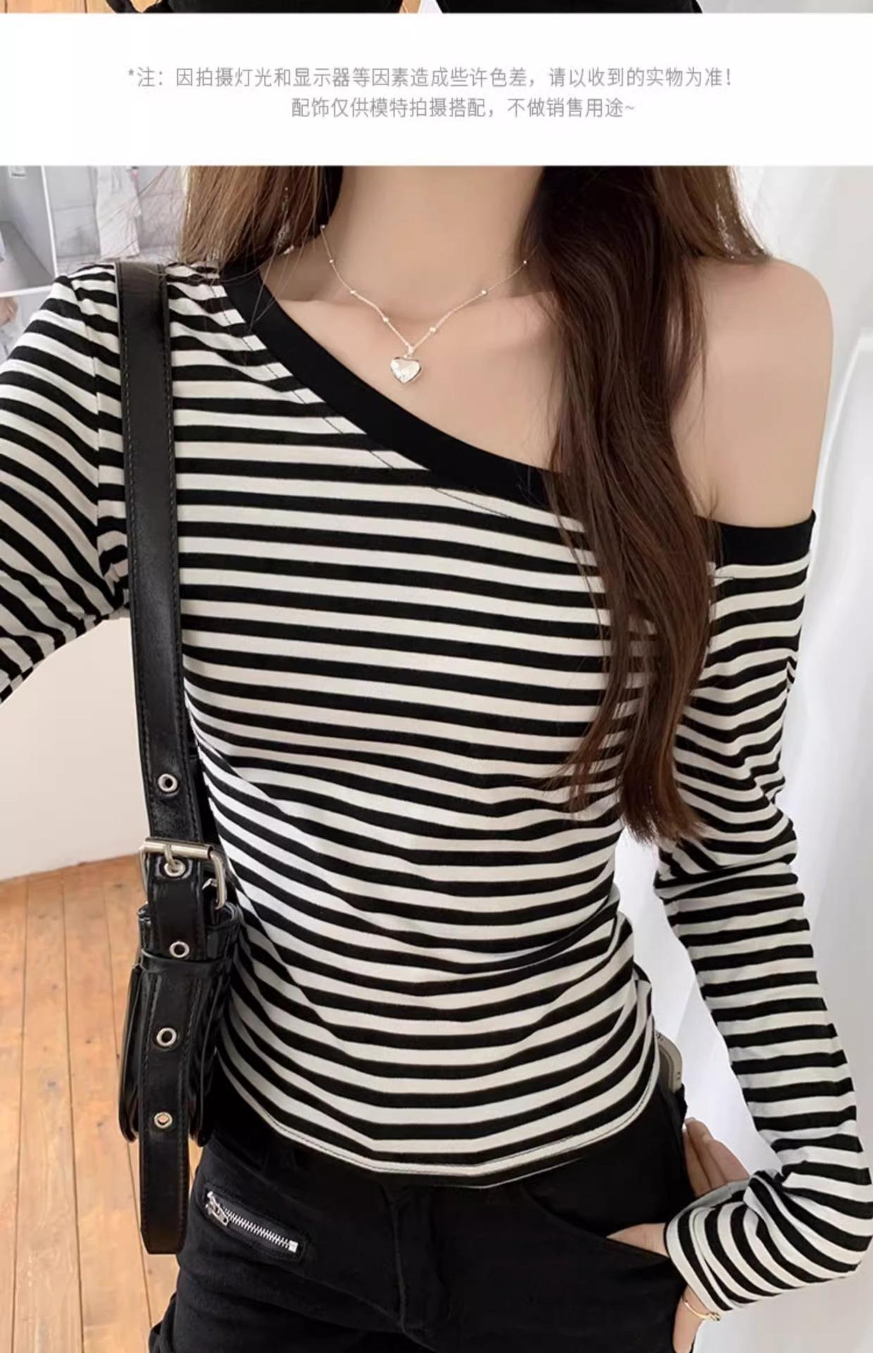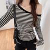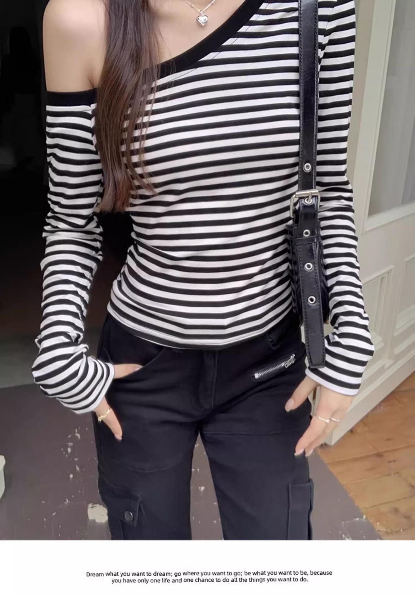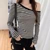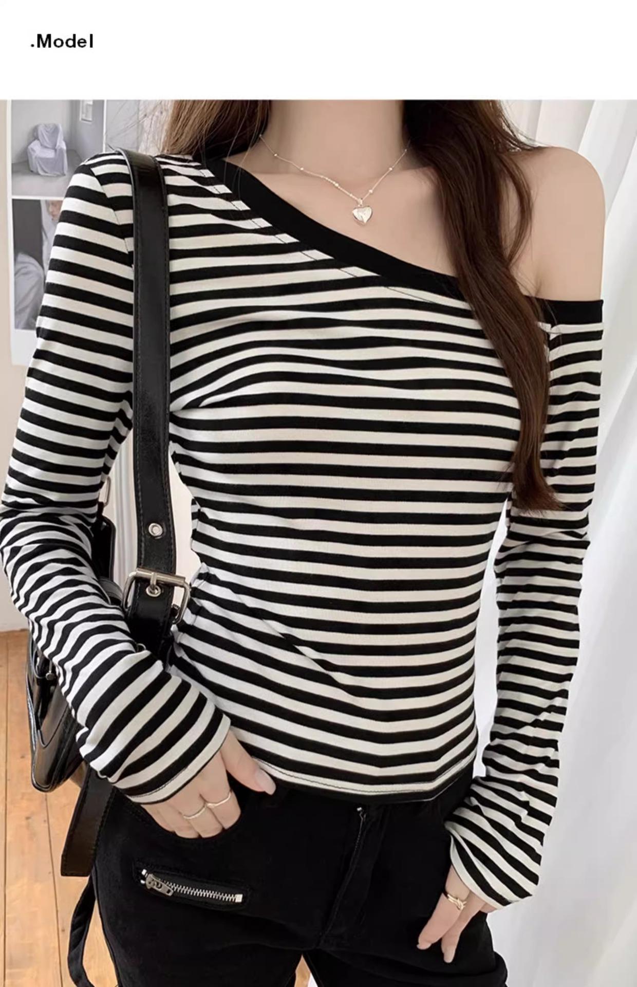 Pure Desire Camiseta de Manga Larga con Hombro Caído a Rayas Blancas y Negras para Mujer, Otoño Temprano, Chica Caliente, Sexy, Slim, Corta, Dulce, Picante, Top con Hombro Descubierto