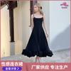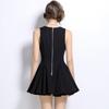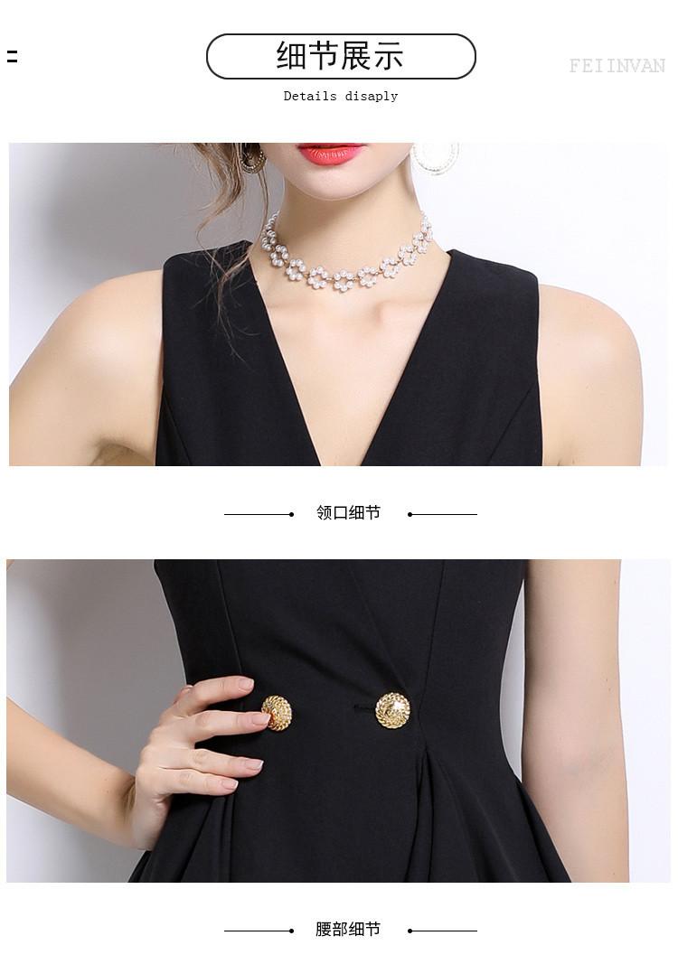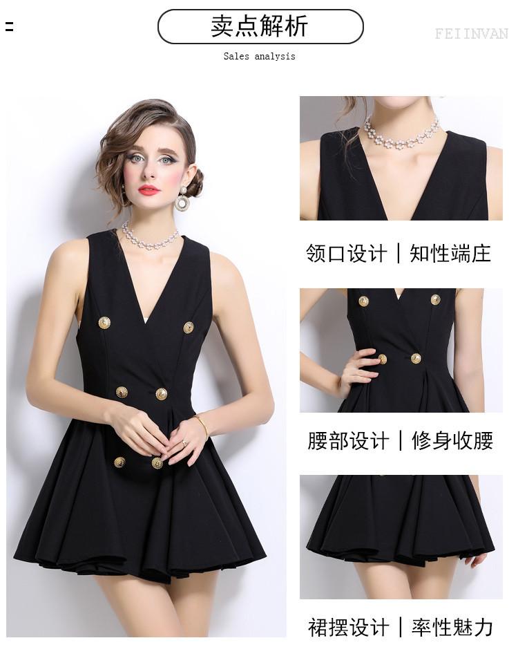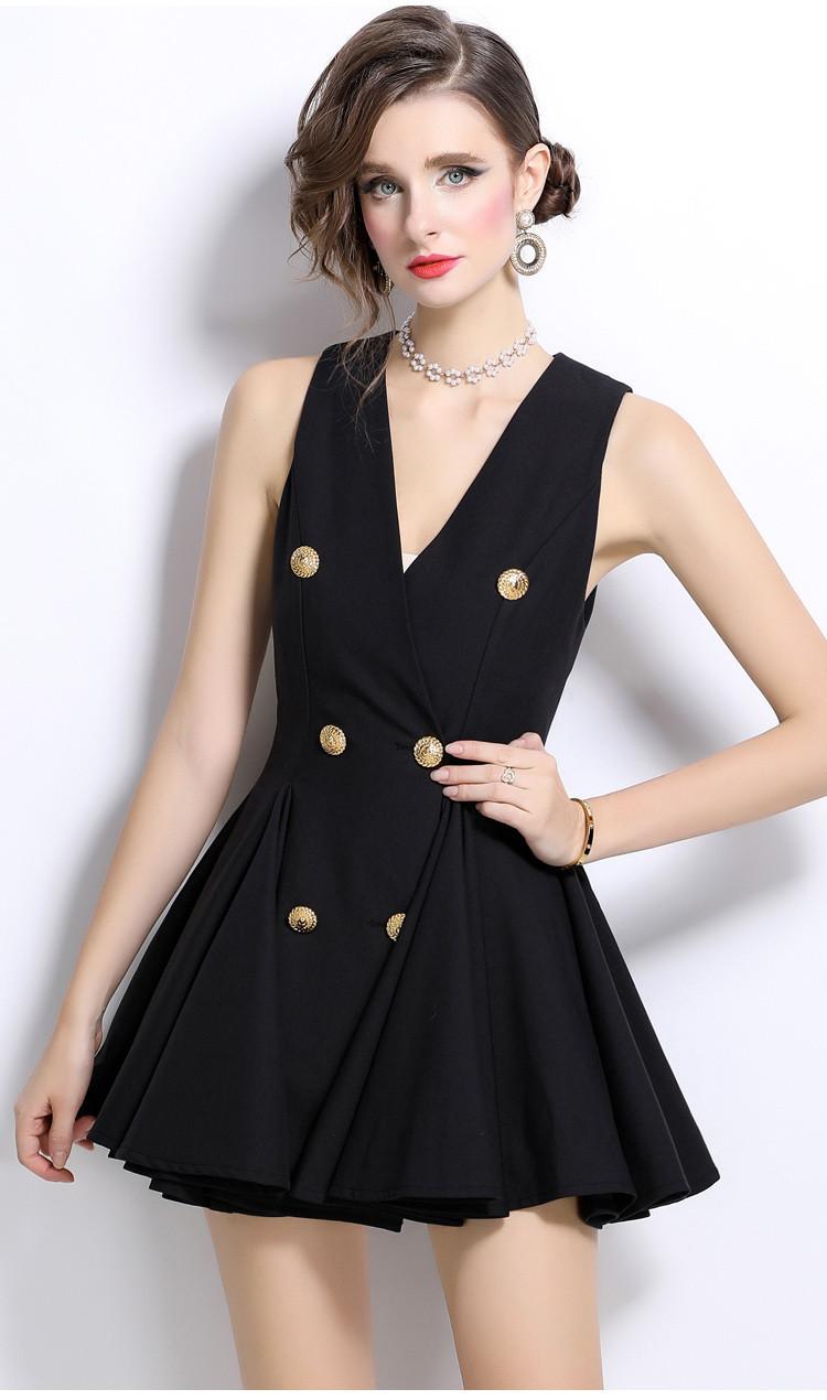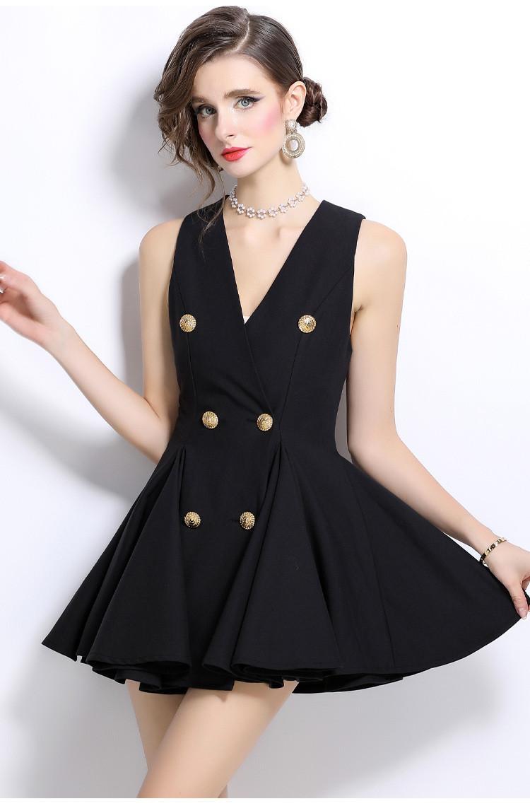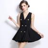 2024 Nuevo Vestido Negro Cruzado de Cuello en V sin Mangas Doble Botonadura Cintura Plisada Falda Corta Desgreñada