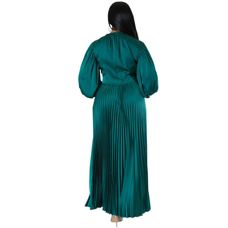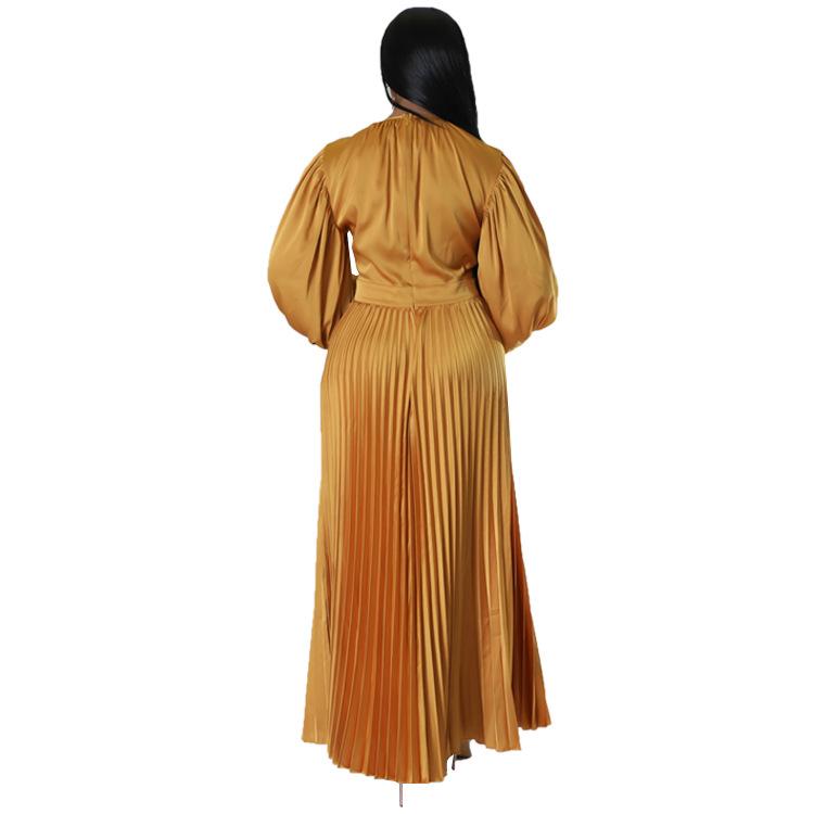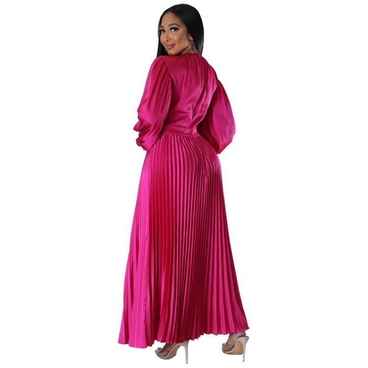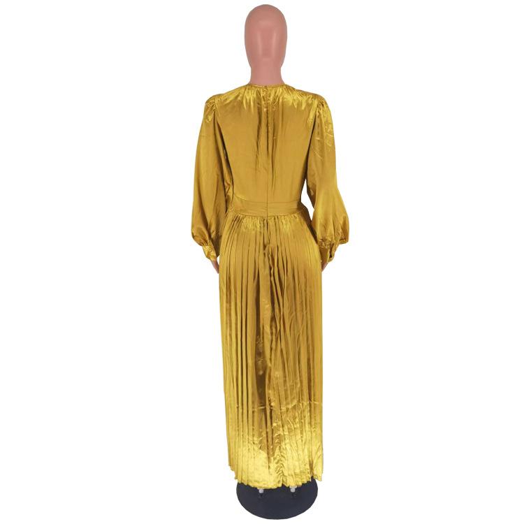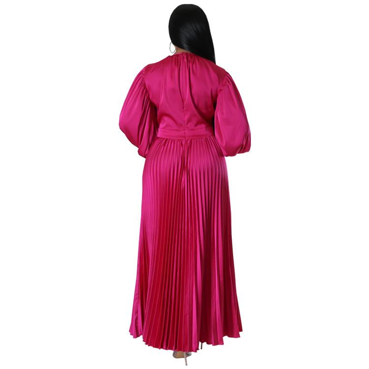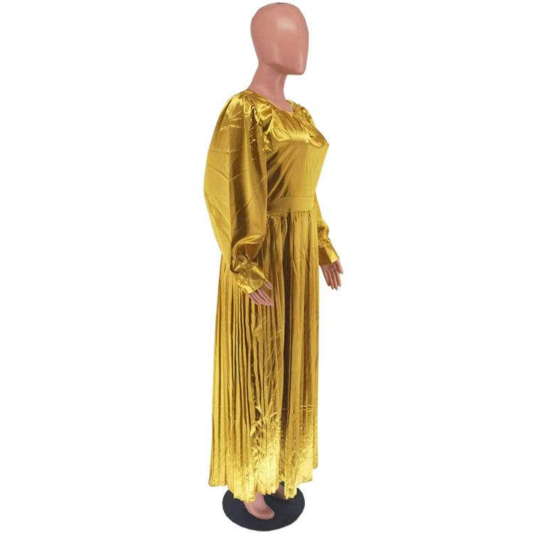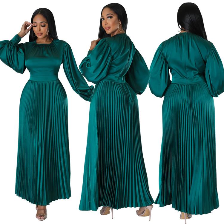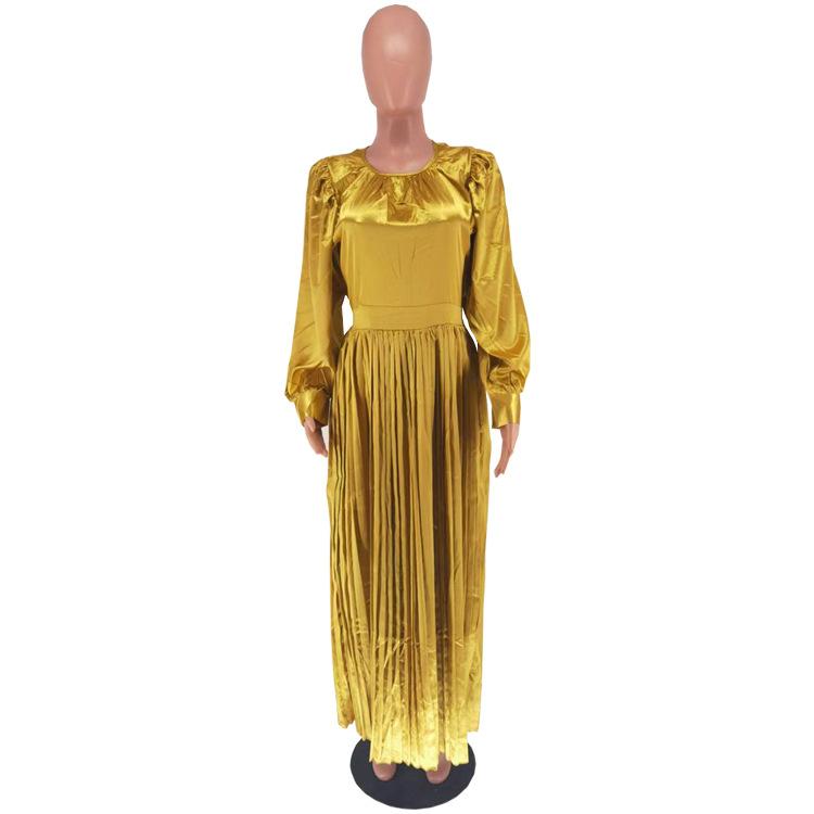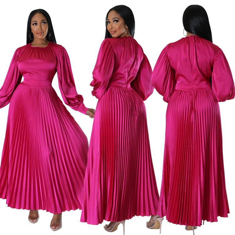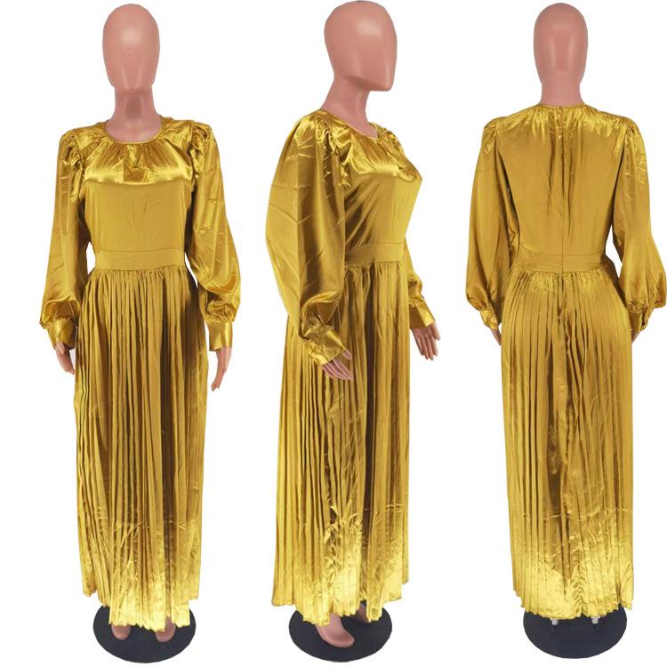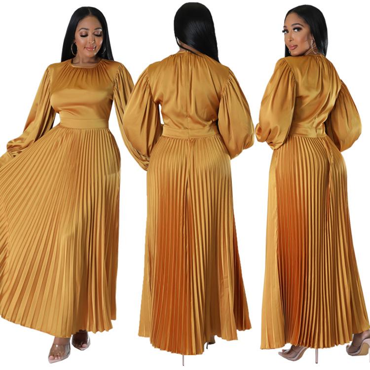 Ropa Europea y Americana Transfronteriza Amazon Otoño e Invierno Wish Venta Caliente Nuevo Vestido Largo Plisado de Cuello Redondo para Mujer
