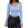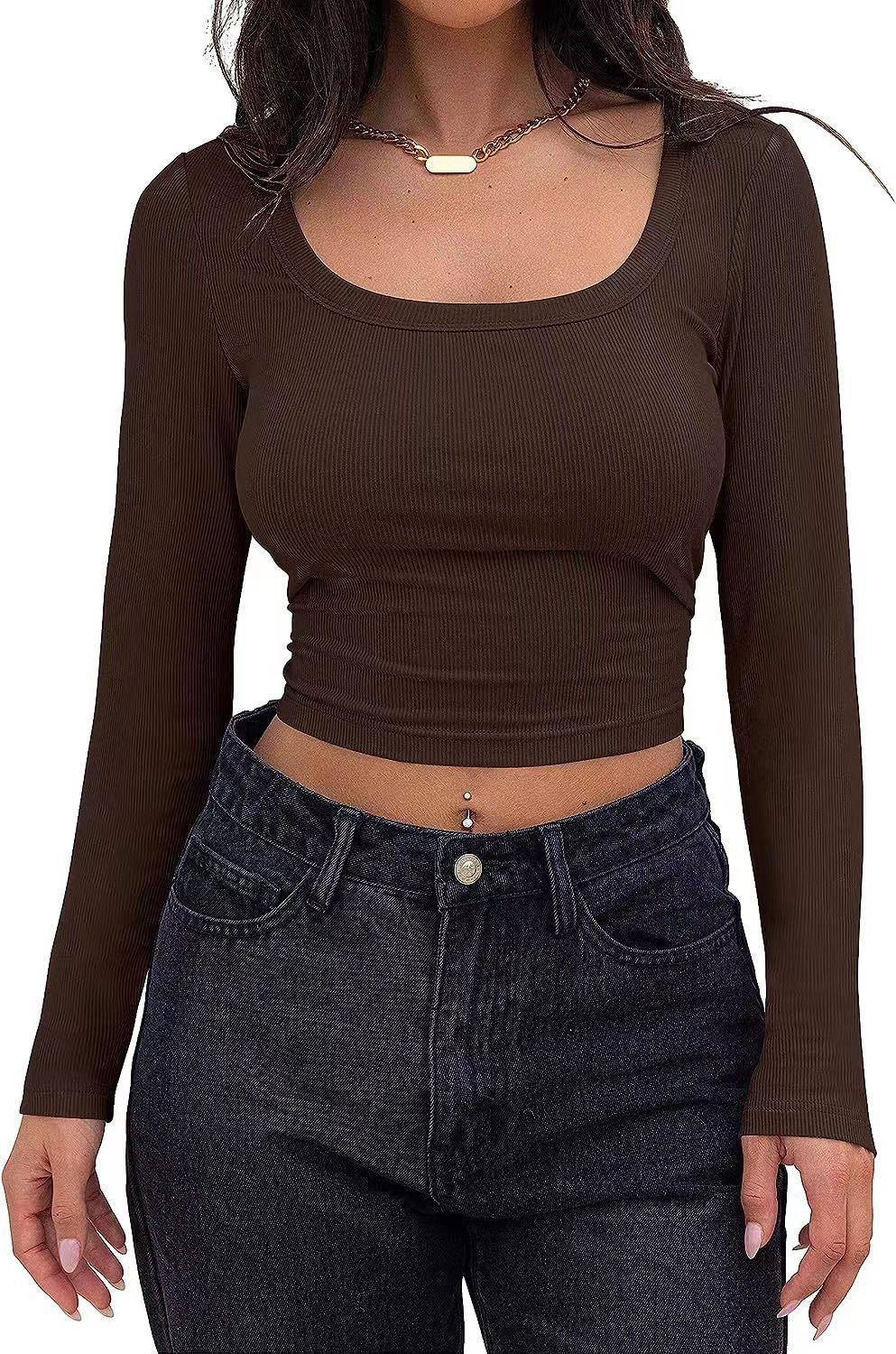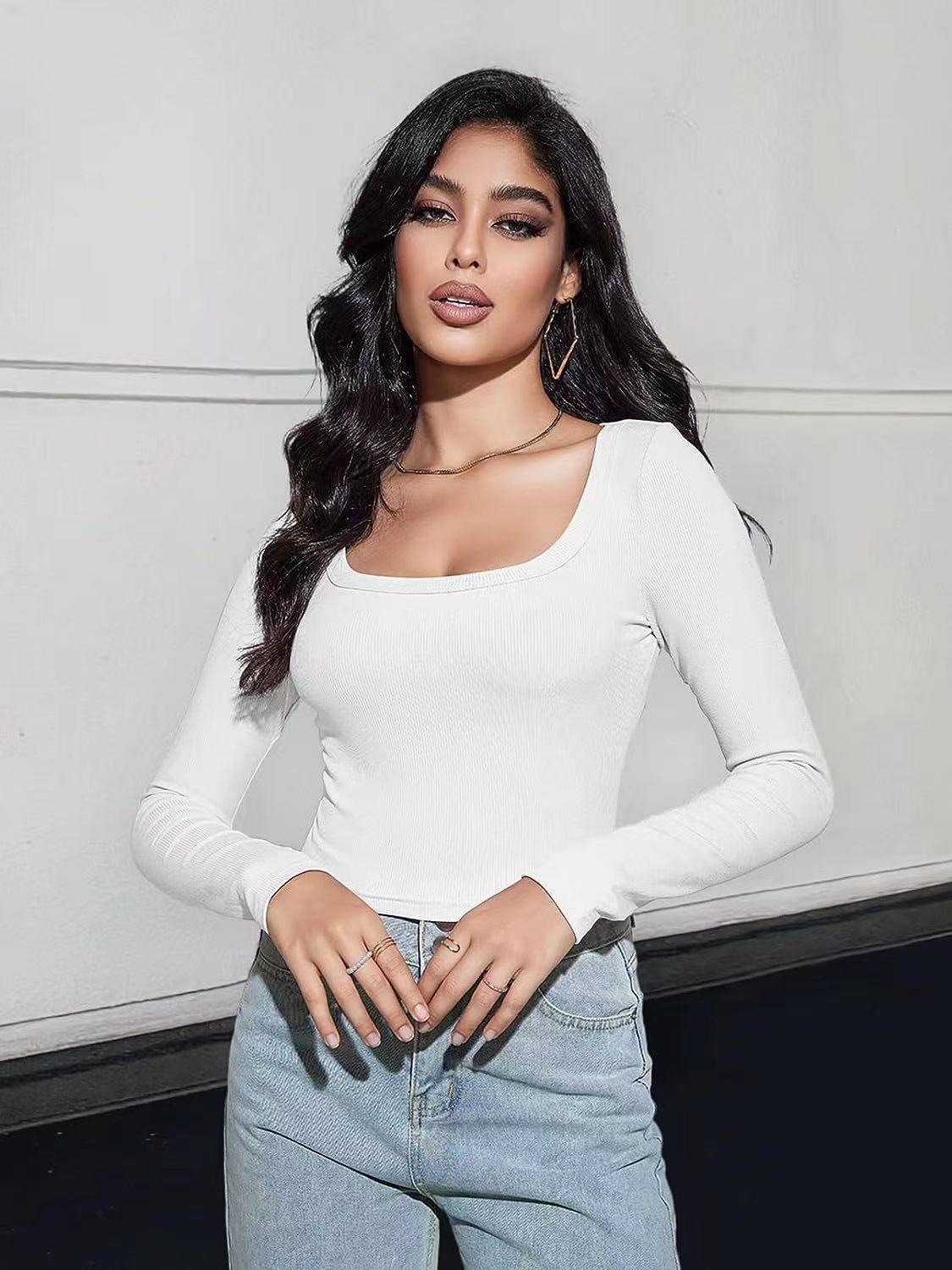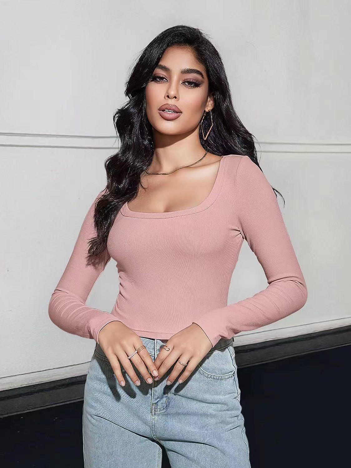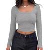 Aliexpress Amazon Ropa de Mujer Europea y Americana Canalé Hilos Slim Corta Manga Larga Cuello Cuadrado Camiseta Exportación Transfronteriza t