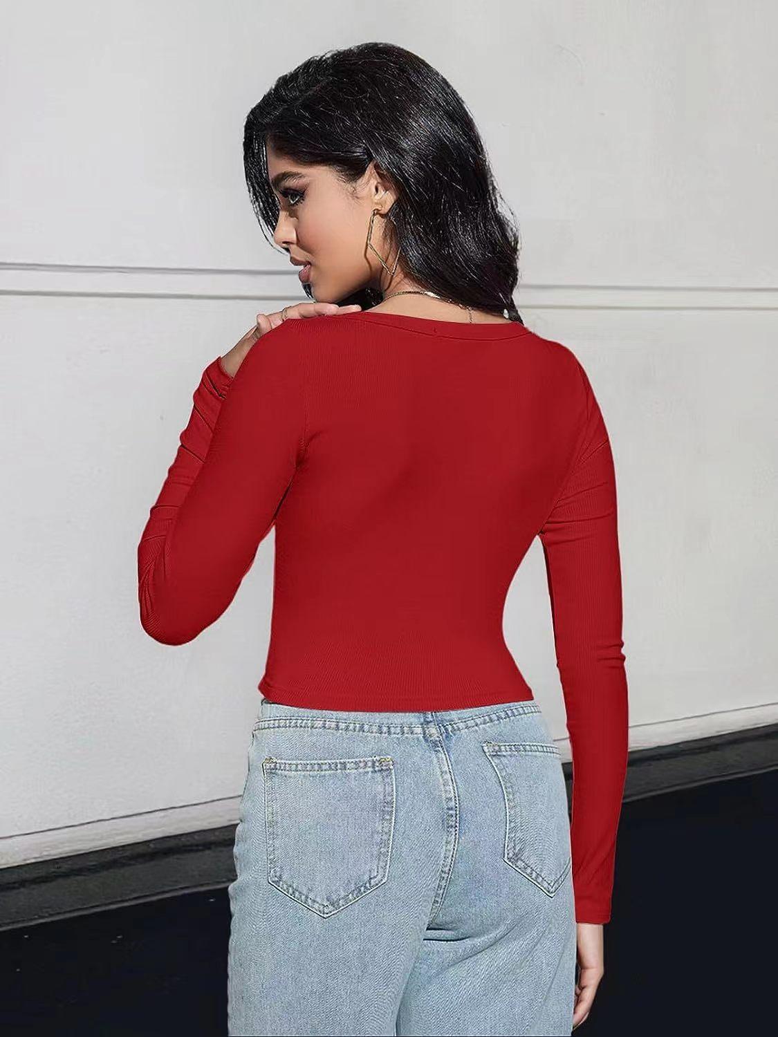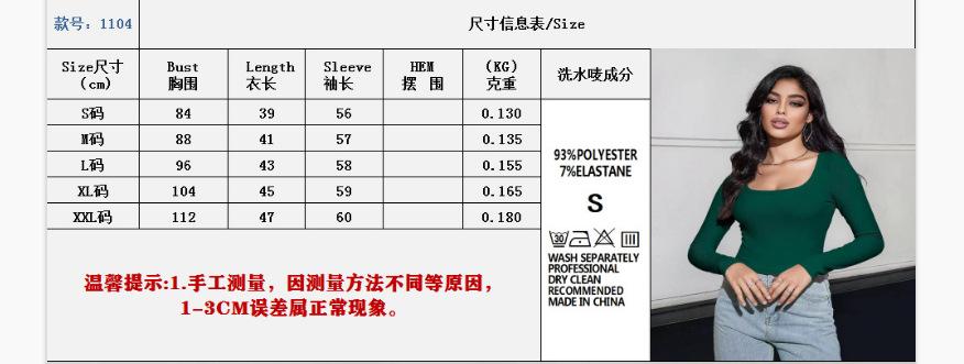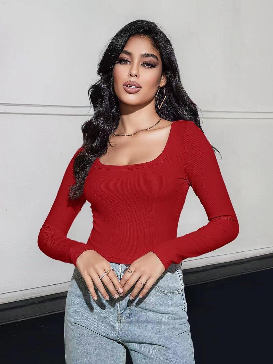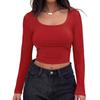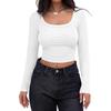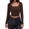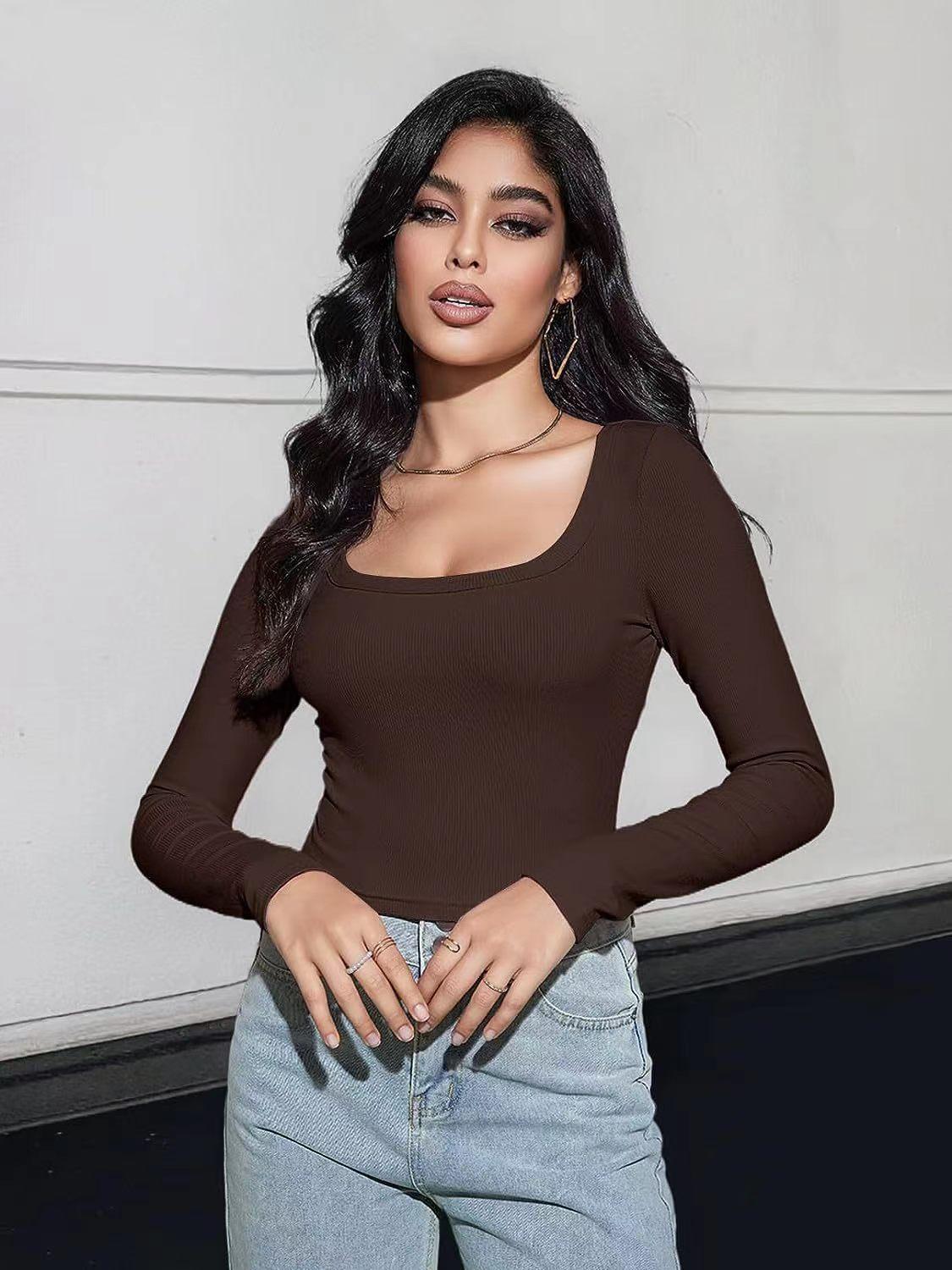 Aliexpress Amazon Ropa de Mujer Europea y Americana Canalé Hilos Slim Corta Manga Larga Cuello Cuadrado Camiseta Exportación Transfronteriza t