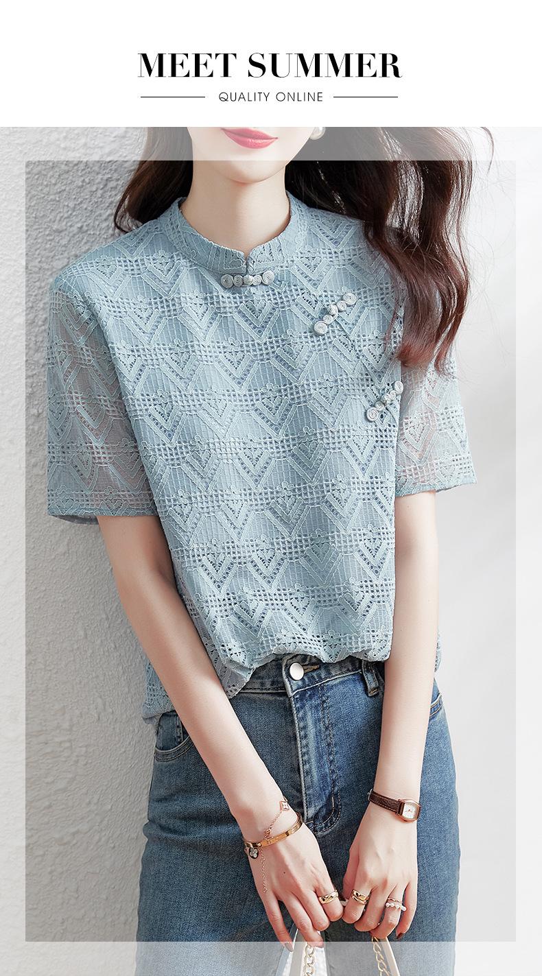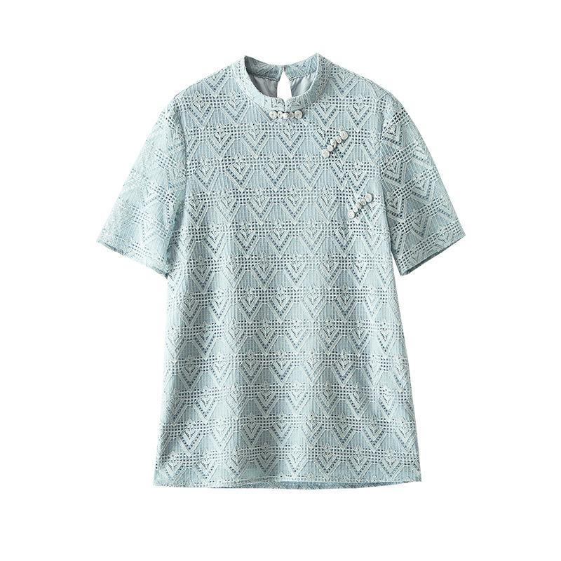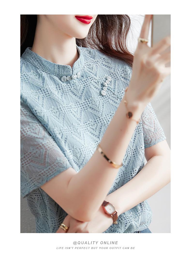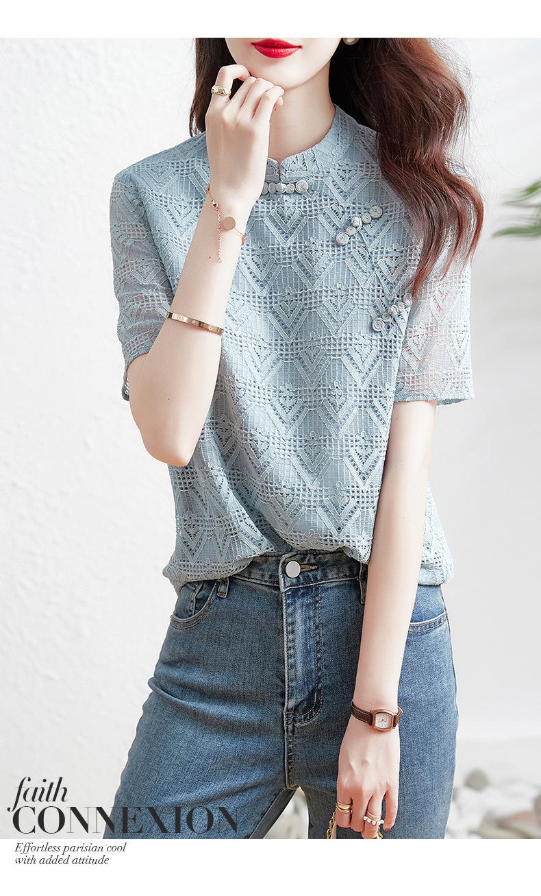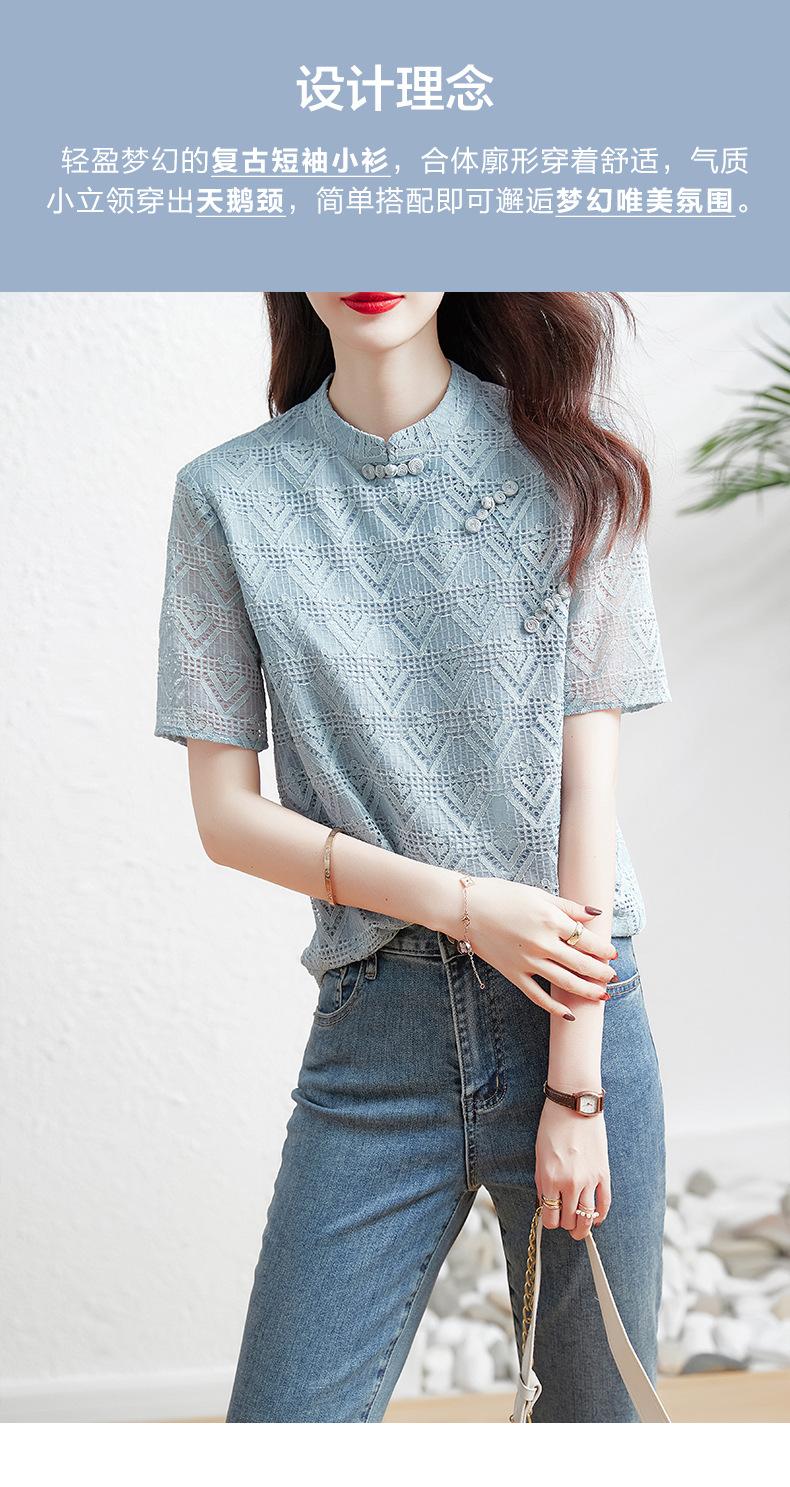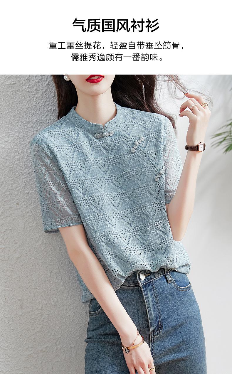 Camisa corta vintage elegante de manga corta para mujer, top de verano, nueva camisa ajustada de gasa con cuello vertical y encaje jacquard para mujer