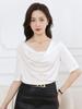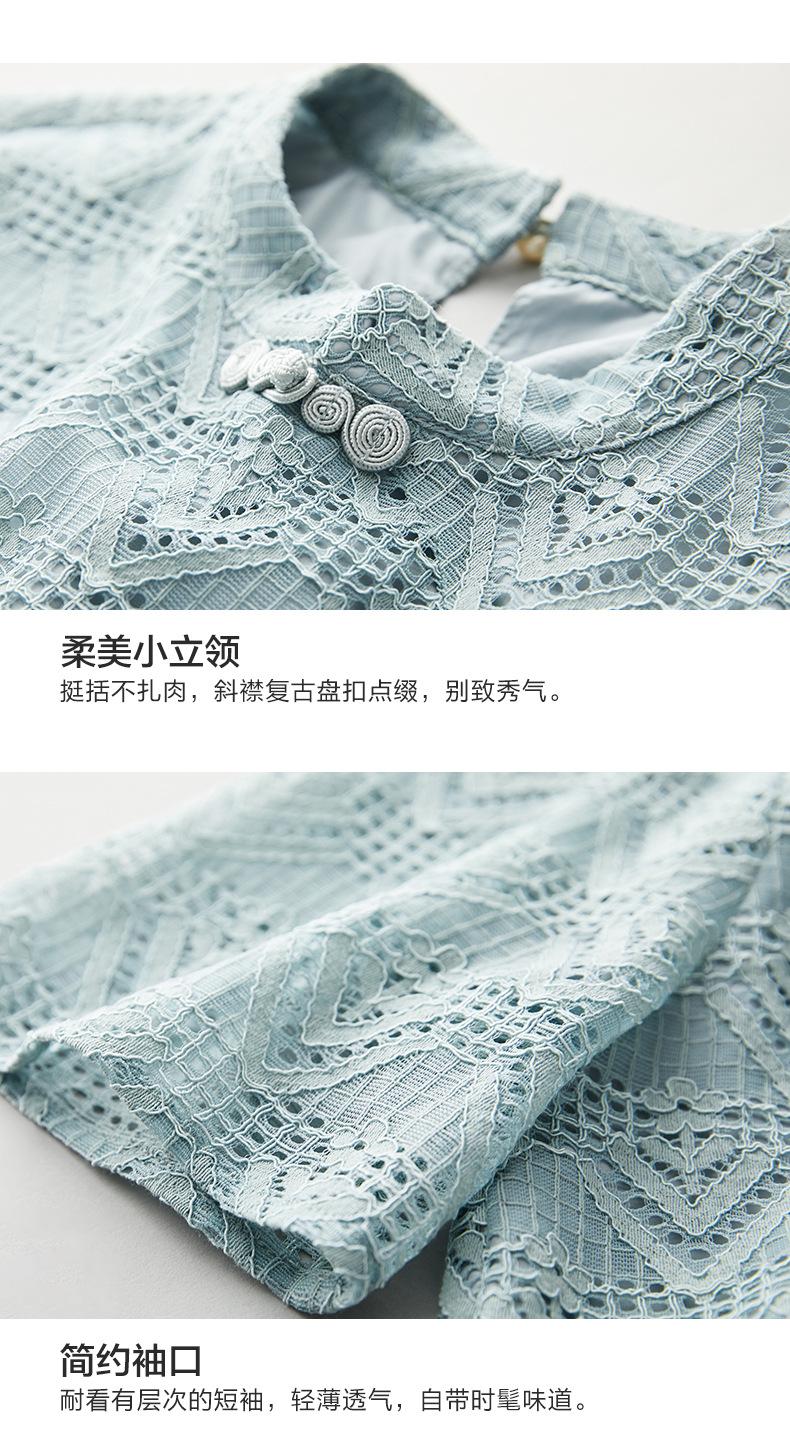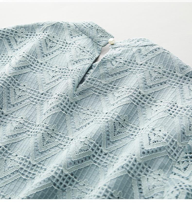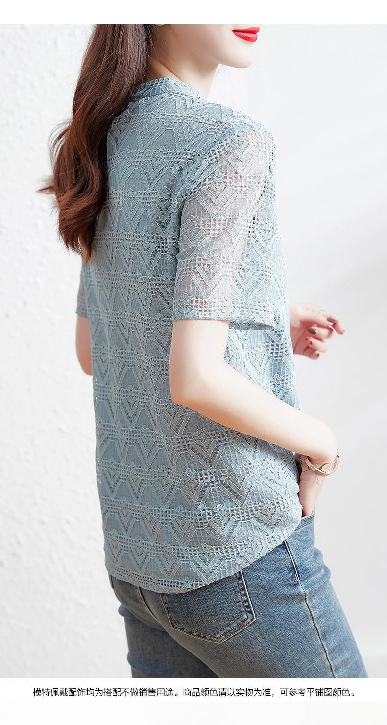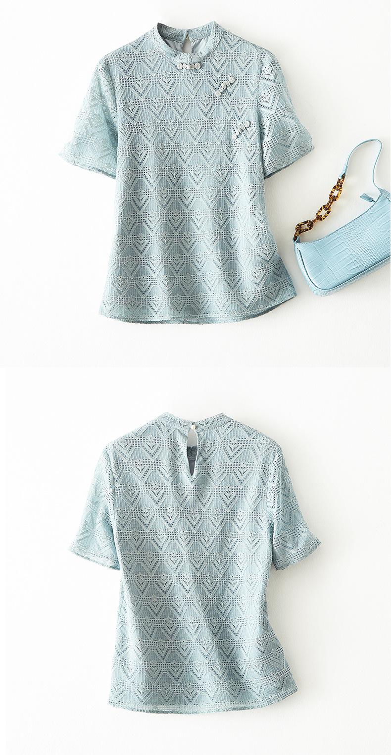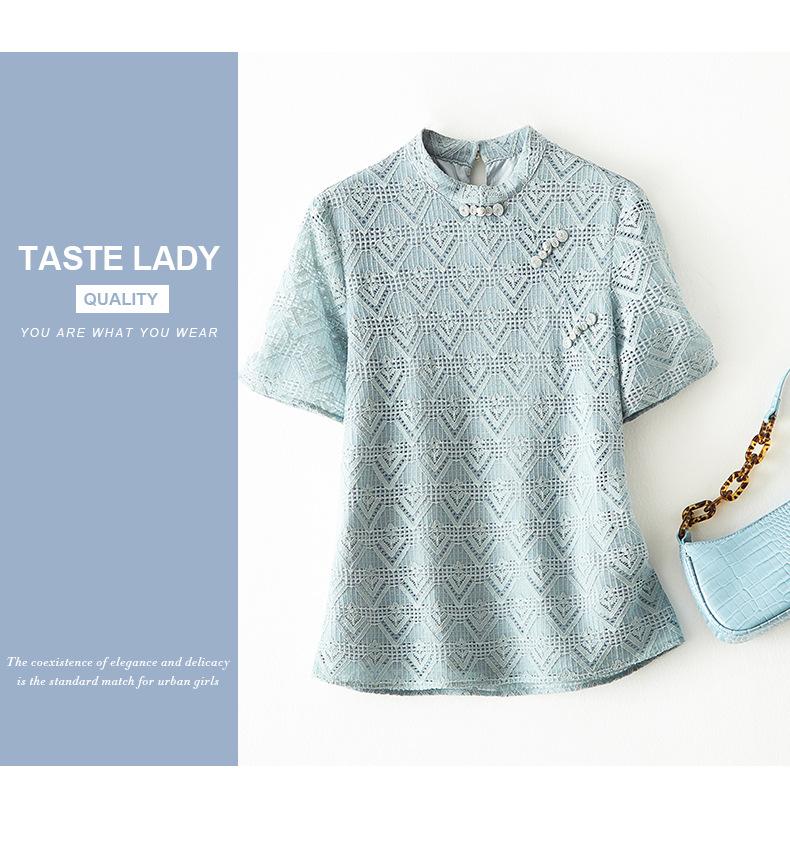 Camisa corta vintage elegante de manga corta para mujer, top de verano, nueva camisa ajustada de gasa con cuello vertical y encaje jacquard para mujer