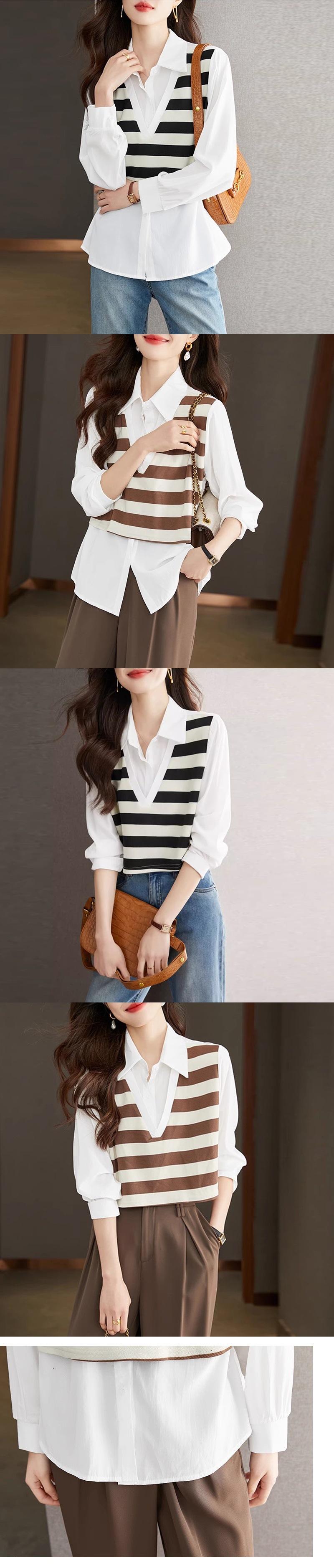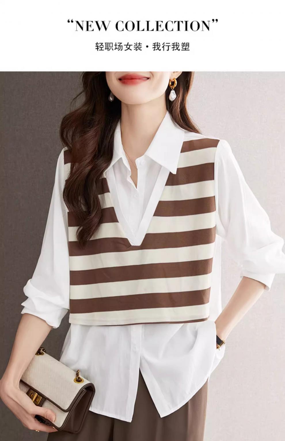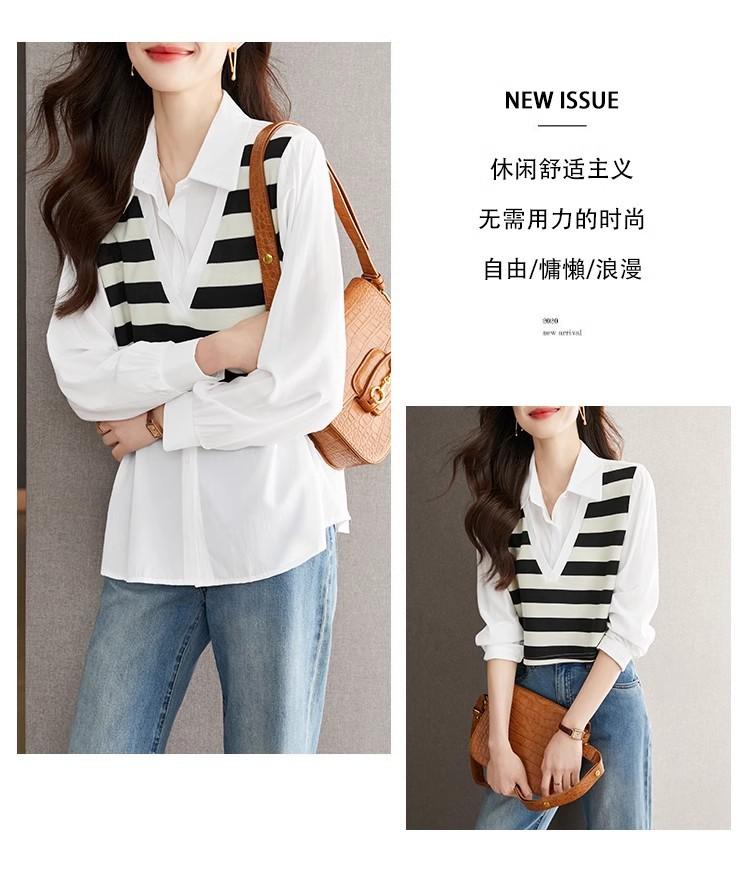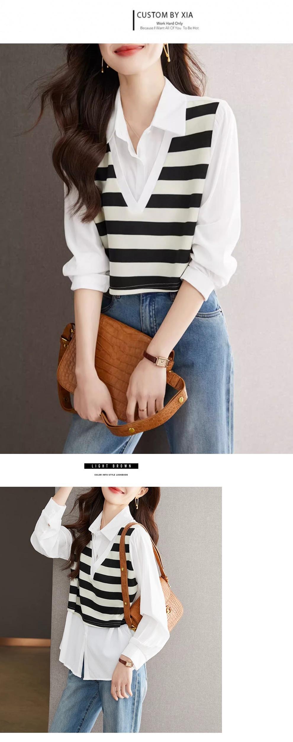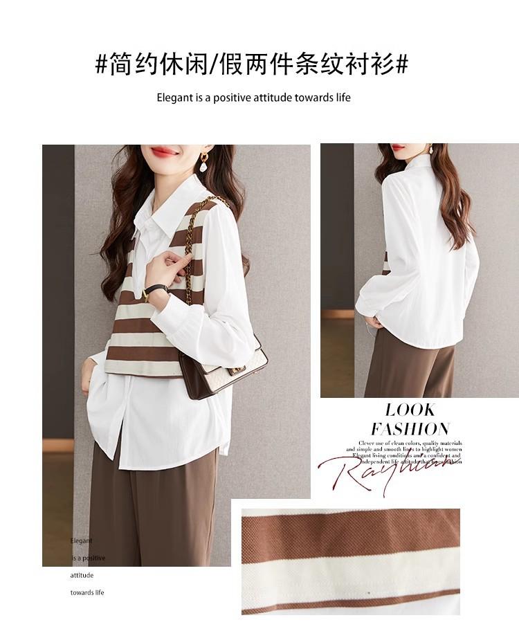 Camisa de manga larga a rayas con costuras falsas de dos piezas para mujer, otoño 2024, nuevo estilo occidental, top holgado y ajustado que combina con todo.