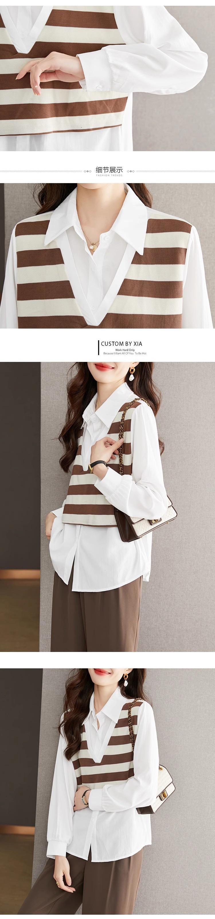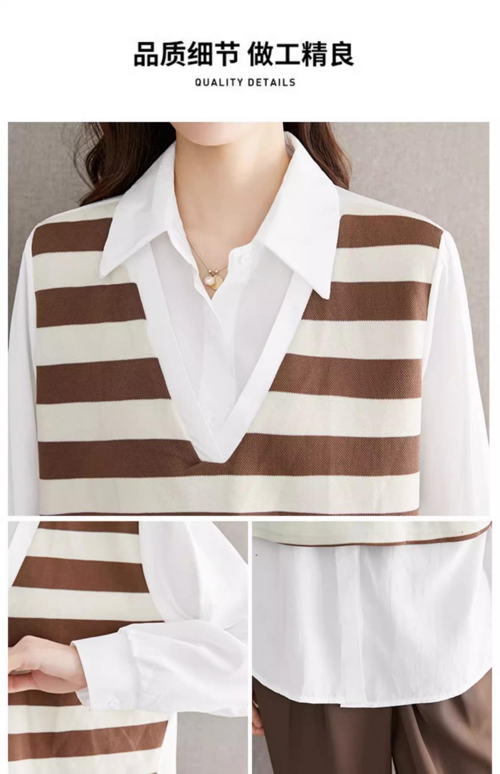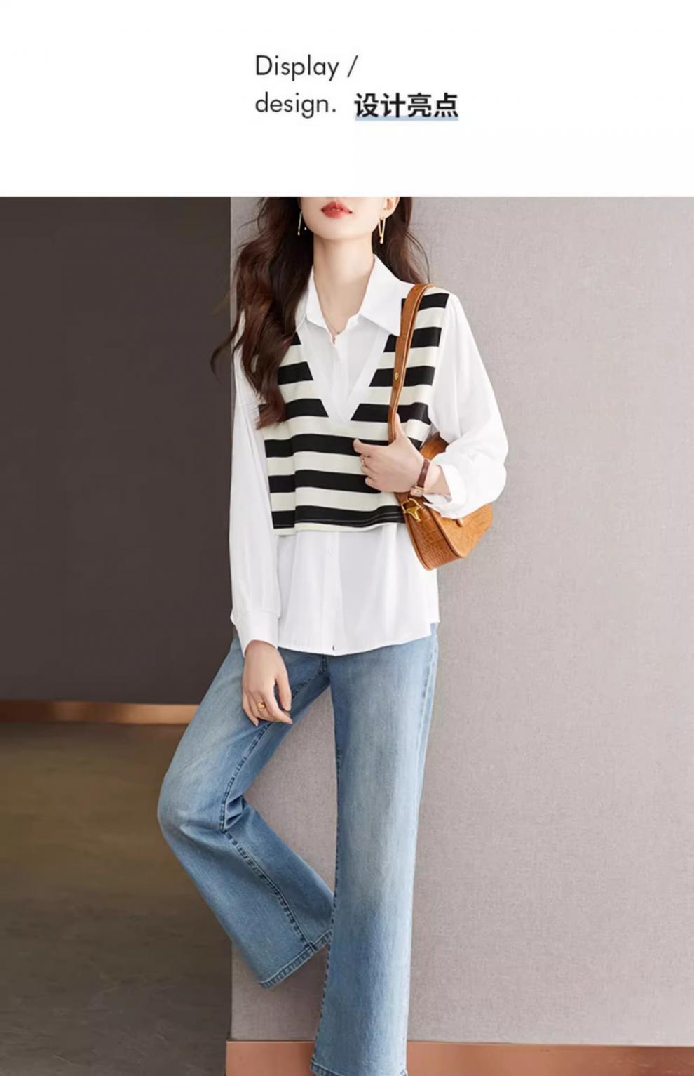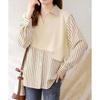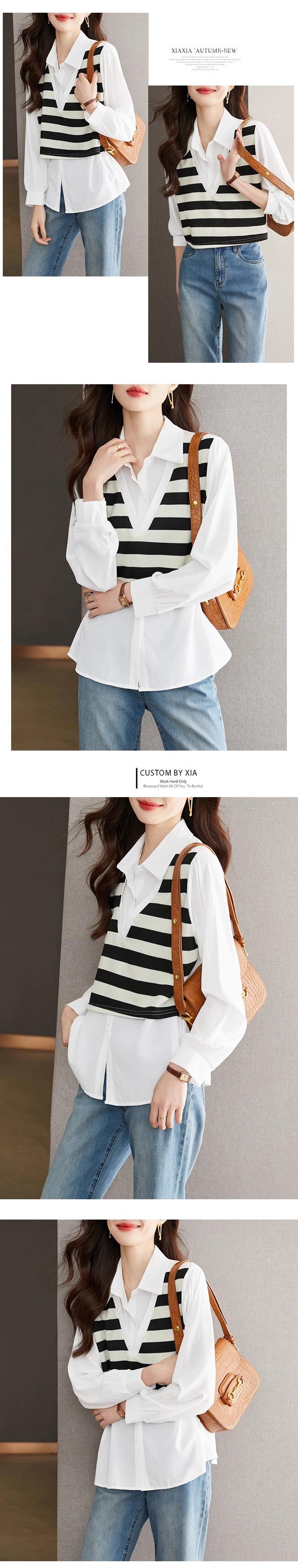 Camisa de manga larga a rayas con costuras falsas de dos piezas para mujer, otoño 2024, nuevo estilo occidental, top holgado y ajustado que combina con todo.