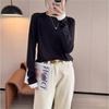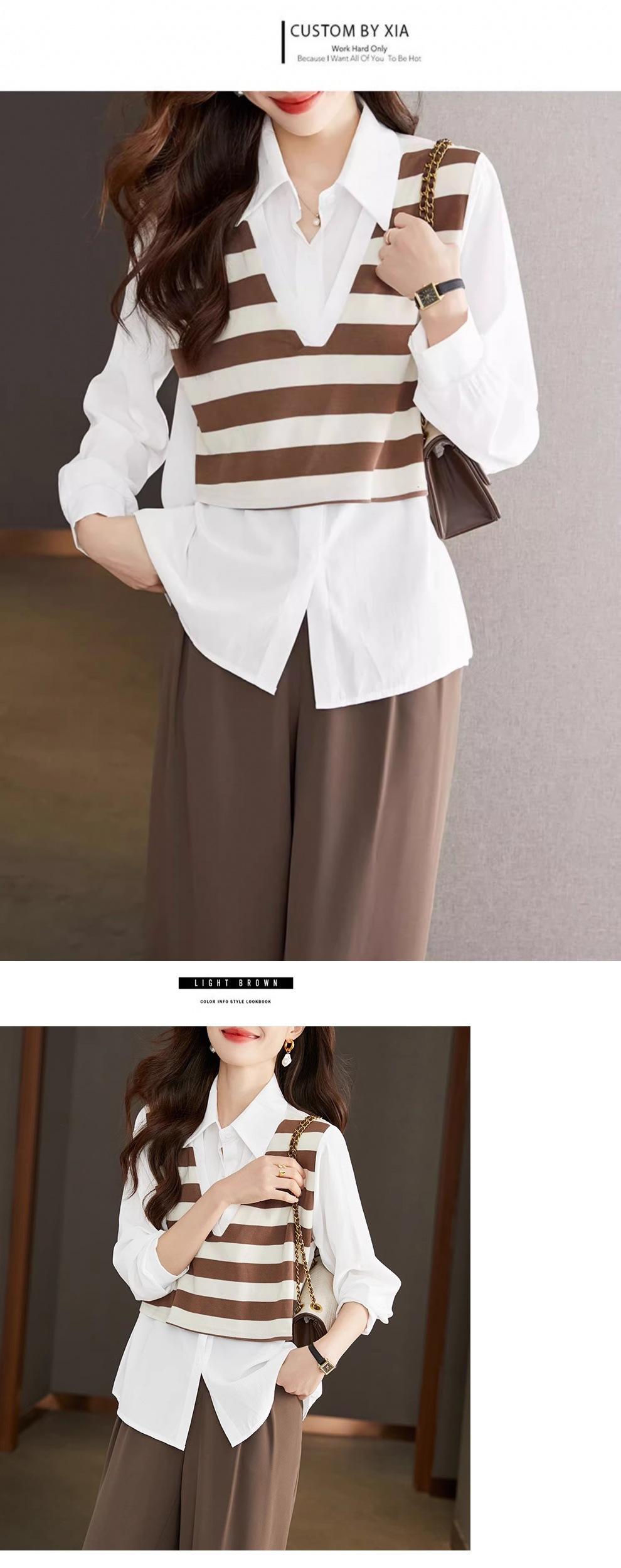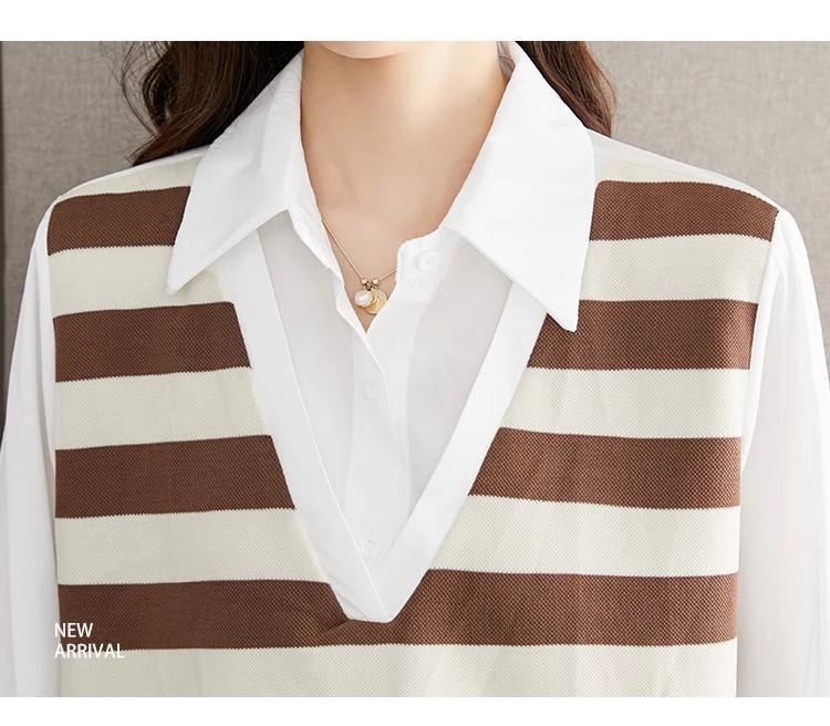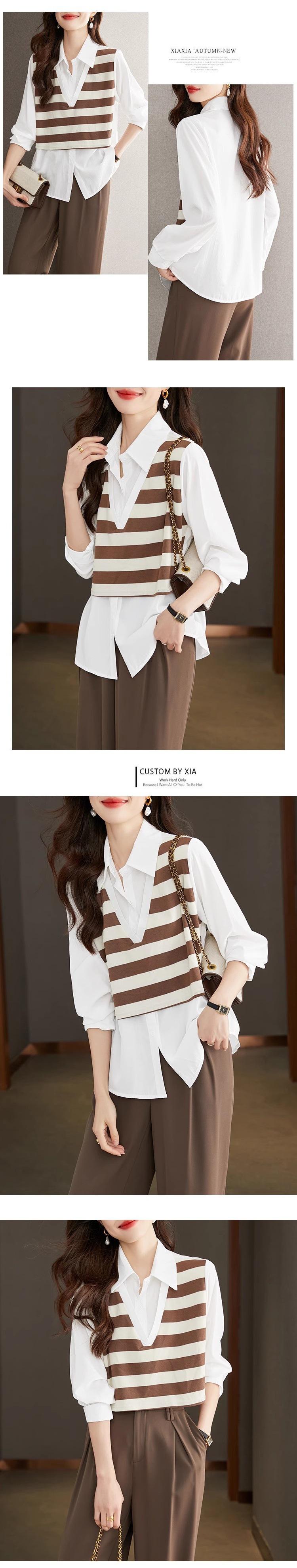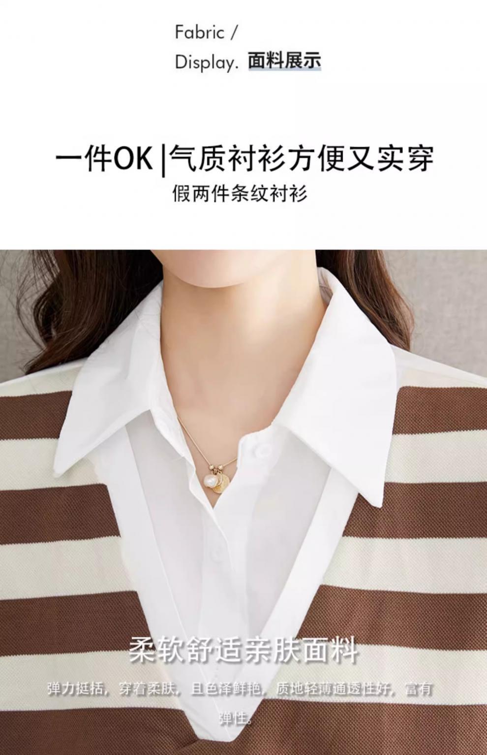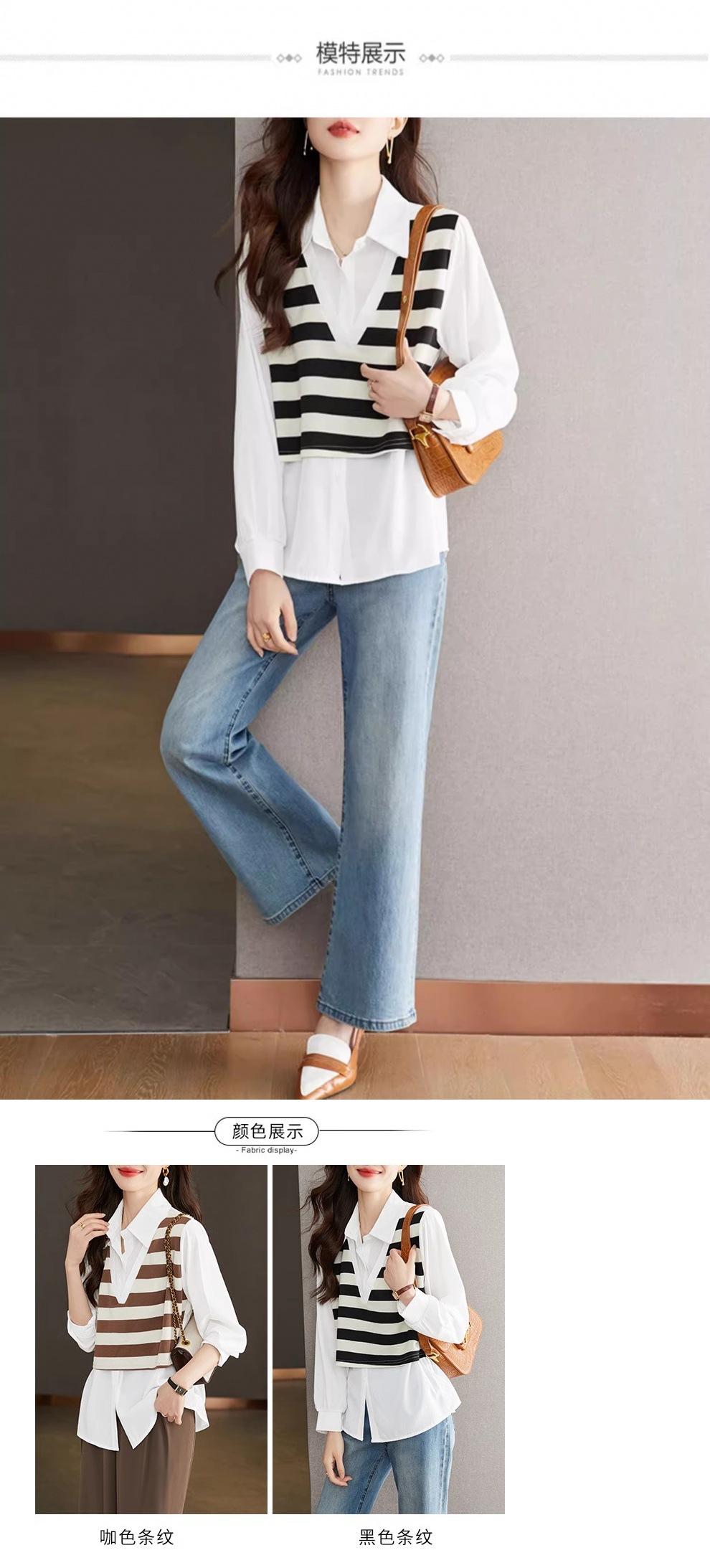 Camisa de manga larga a rayas con costuras falsas de dos piezas para mujer, otoño 2024, nuevo estilo occidental, top holgado y ajustado que combina con todo.