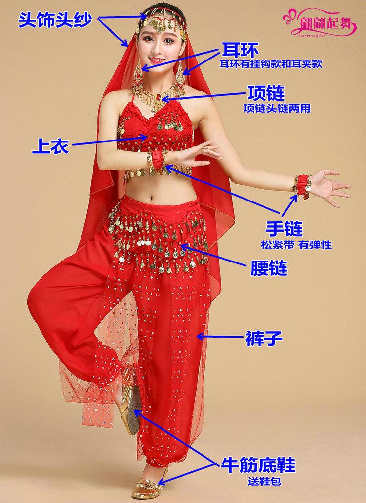 conjunto de nueve piezas= Top + Pantalones + Cadena de cintura + Velo para la cabeza + Collar + Aretes + 2 Pulseras + Cadena para la nariz