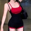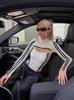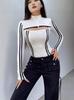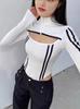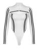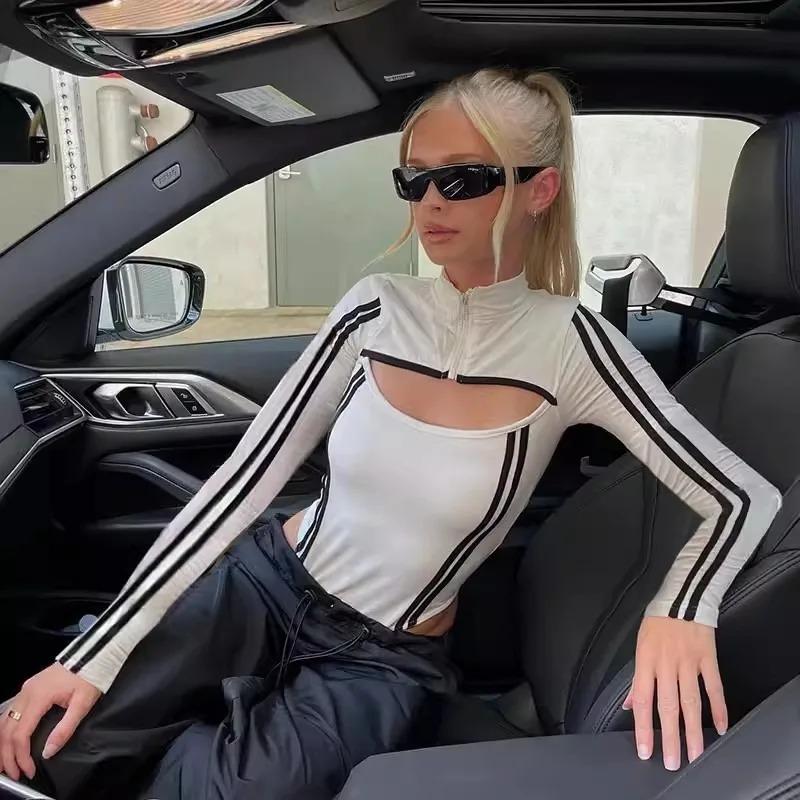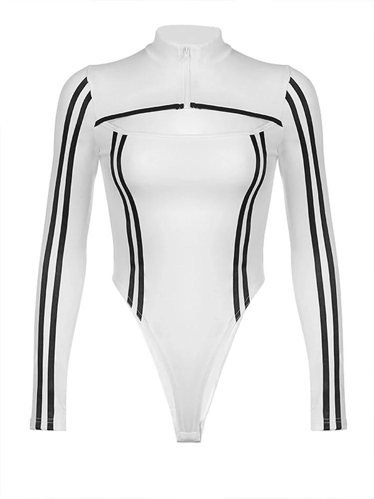 Mono sexy de estilo europeo y americano para chica caliente, con agujeros, cuello alto distintivo de calle, cremallera, mono blanco a rayas de color en contraste