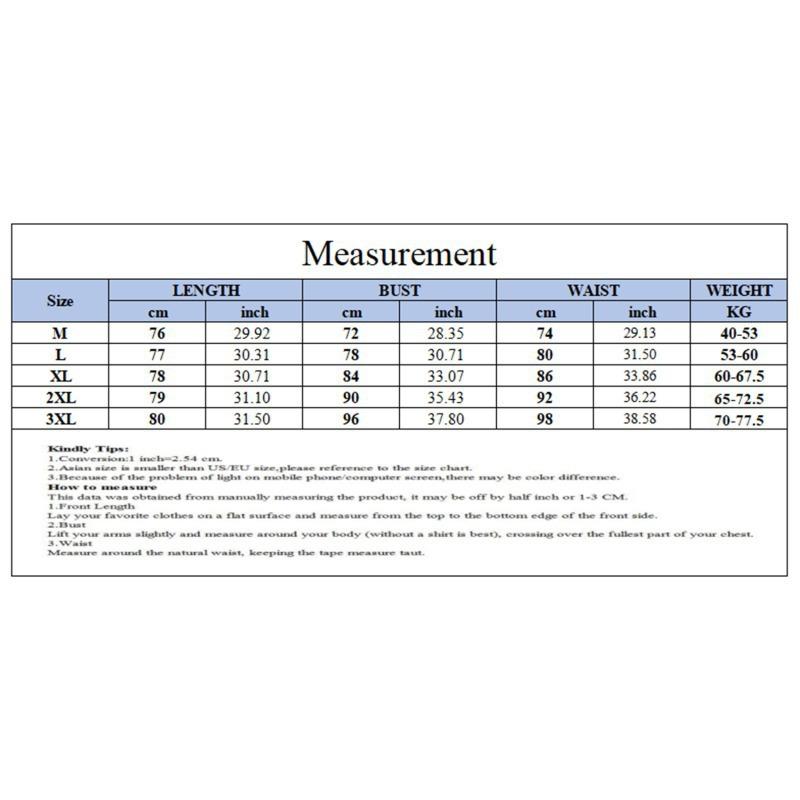 Especificaciones: Largo aproximado 80cm, busto aproximado 96cm, cintura aproximada 98cm, peso recomendado 70-77.5kg, error aproximado 3cm