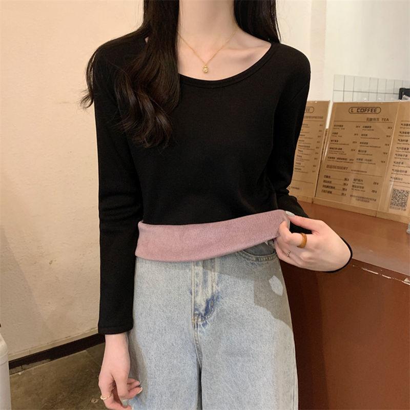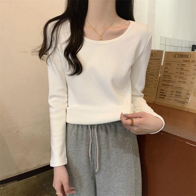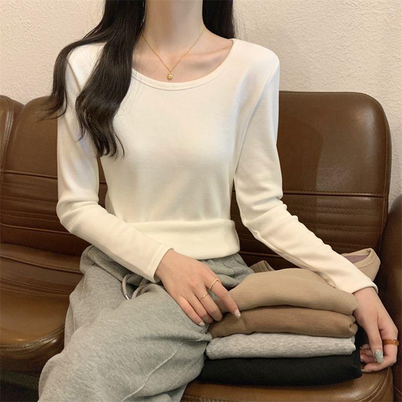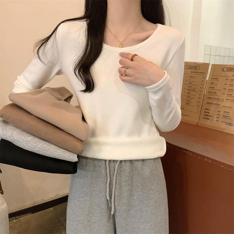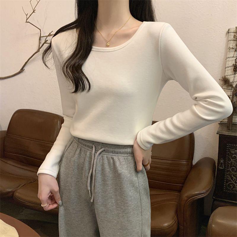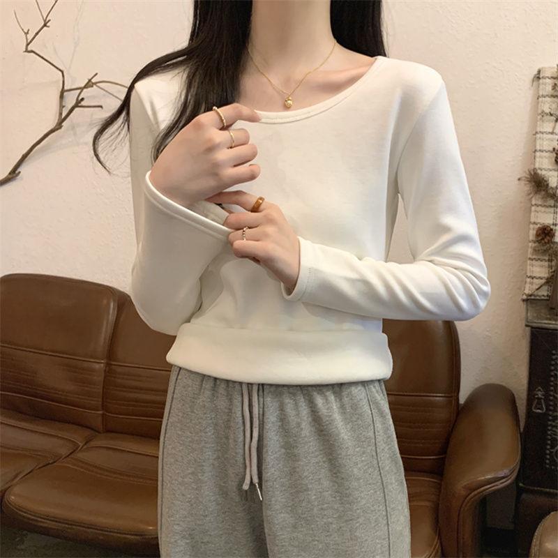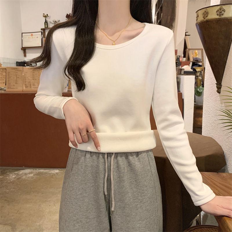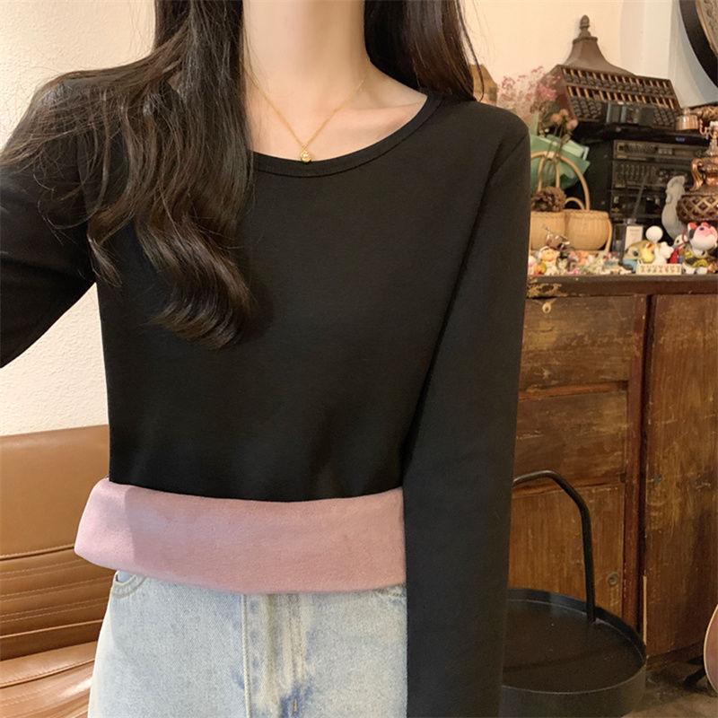 Otoño e Invierno básico camiseta de manga larga gruesa con forro polar para mujer color sólido simple top camiseta interior 2024 Nuevo