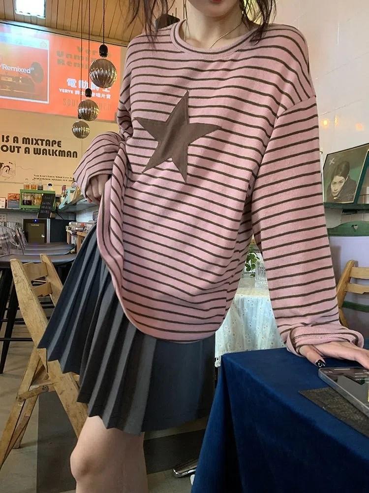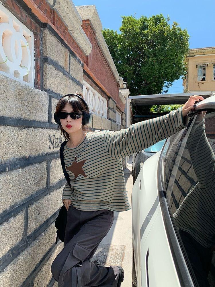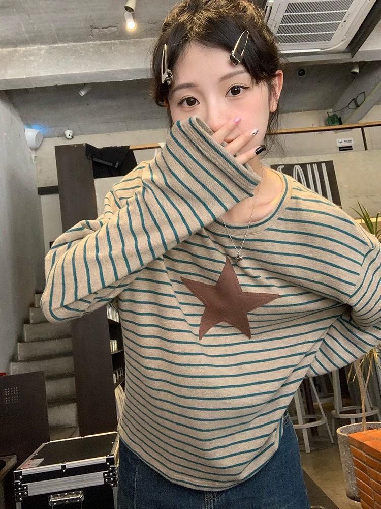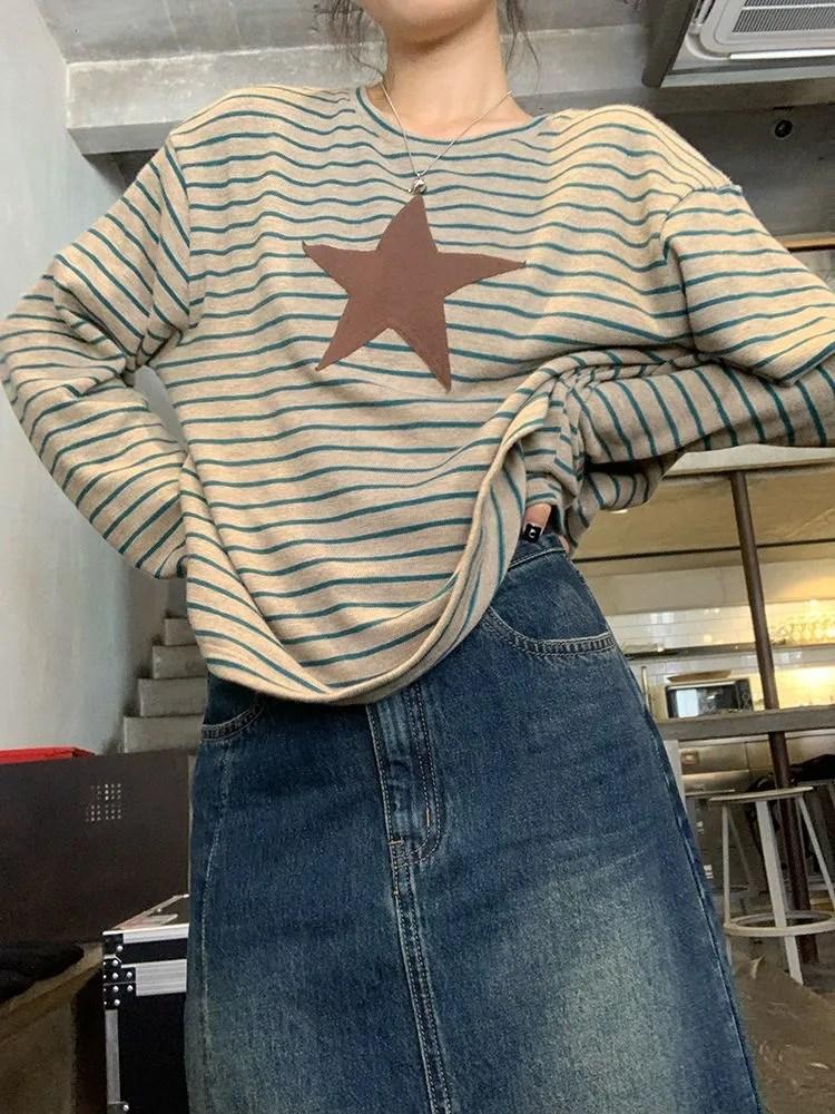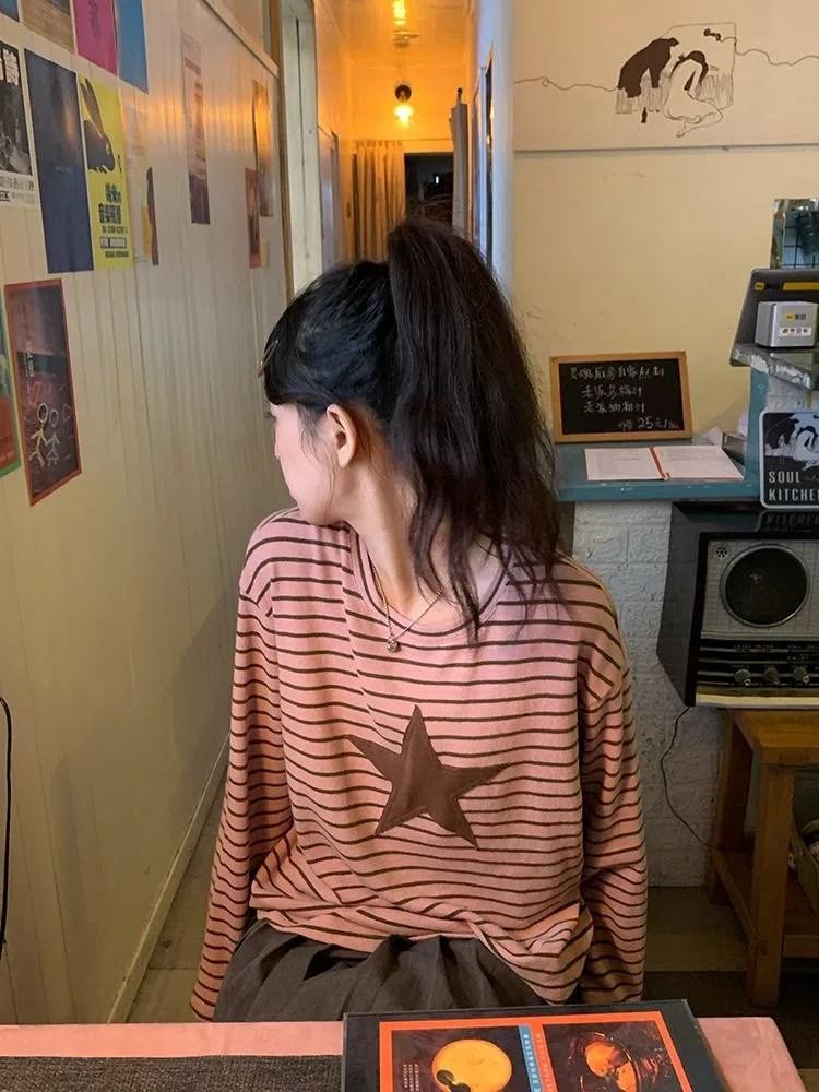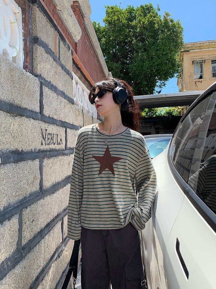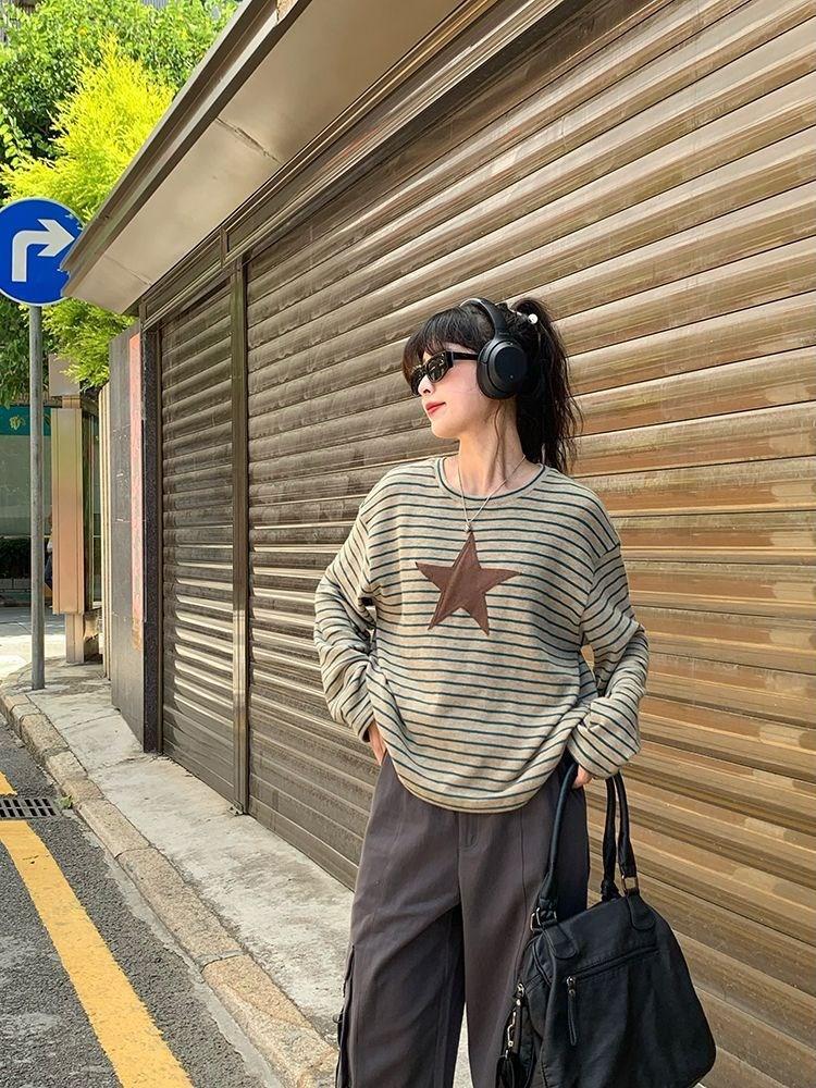 Camiseta holgada informal de manga larga con parche de estrella a rayas para mujer, estilo europeo y americano, otoño 2023