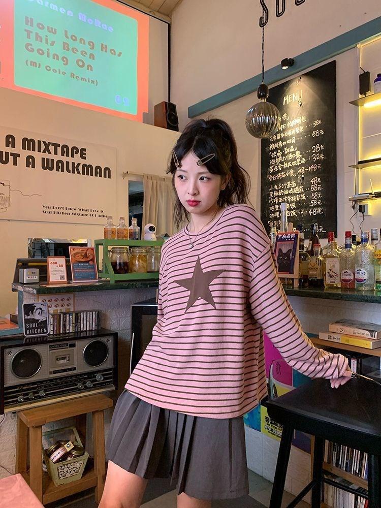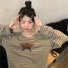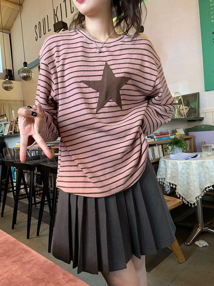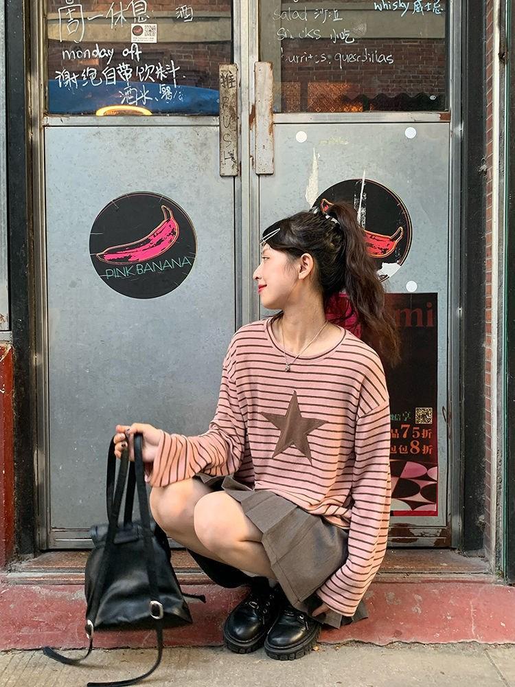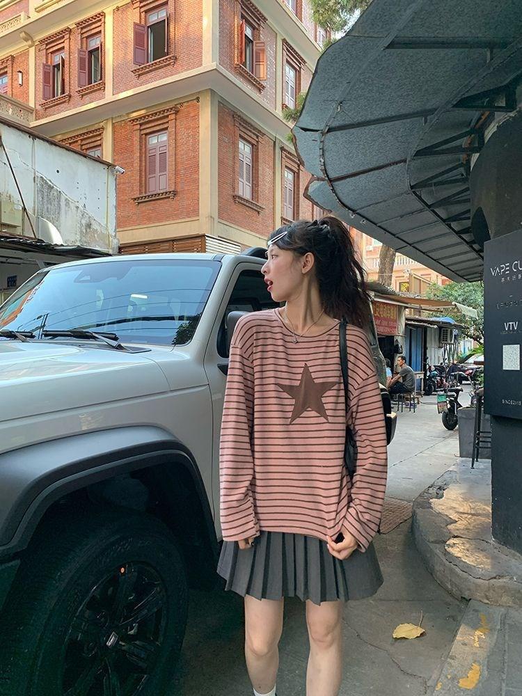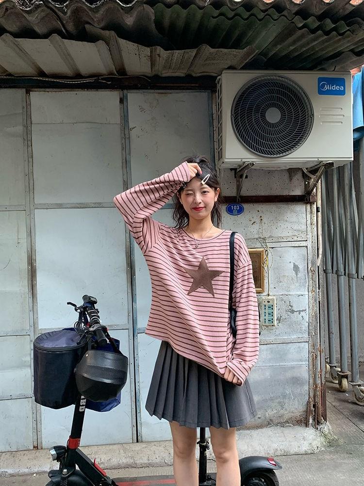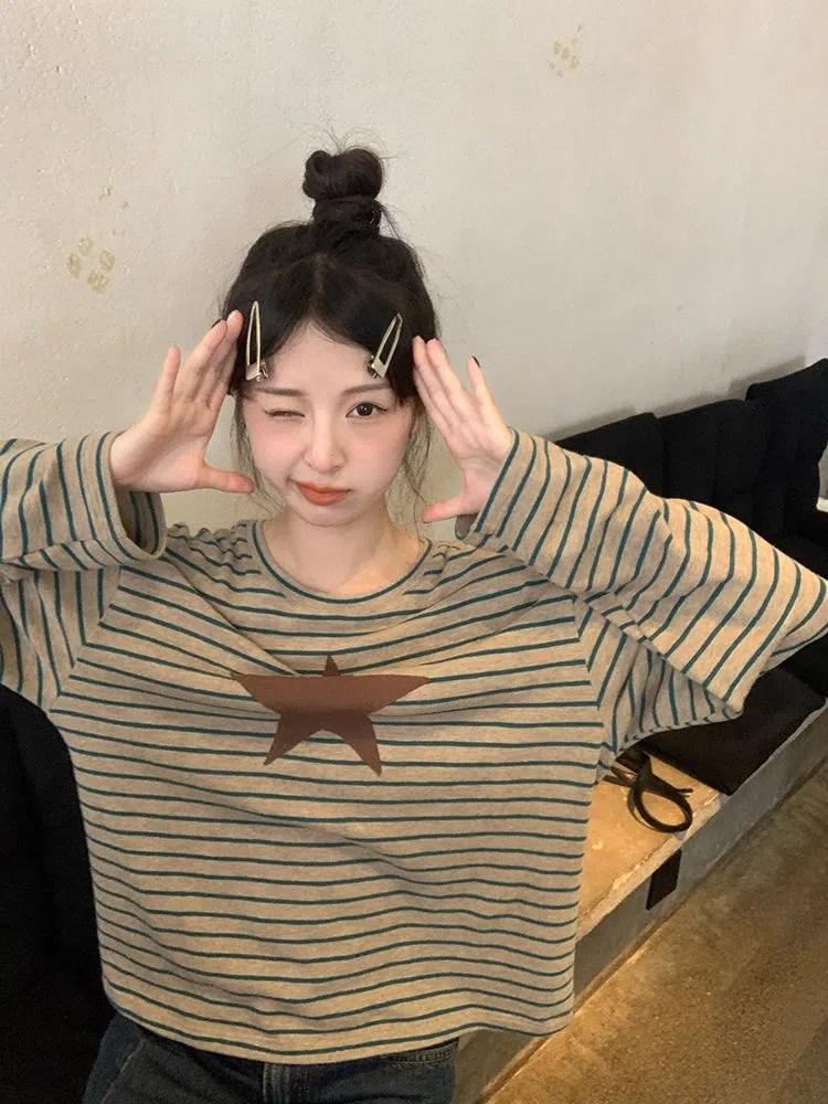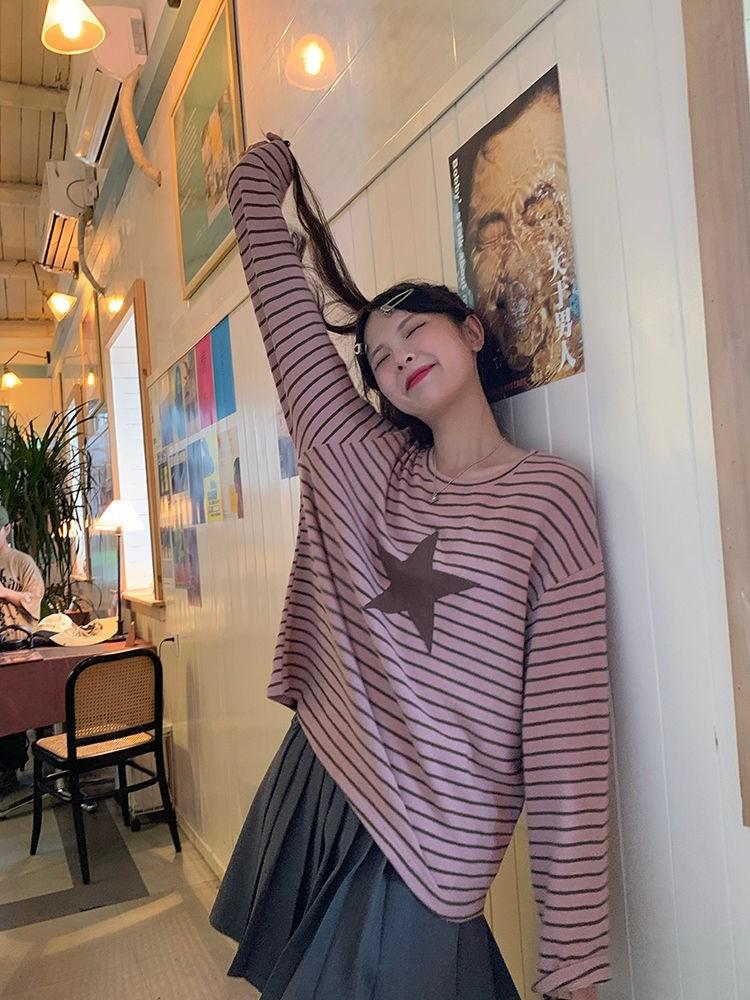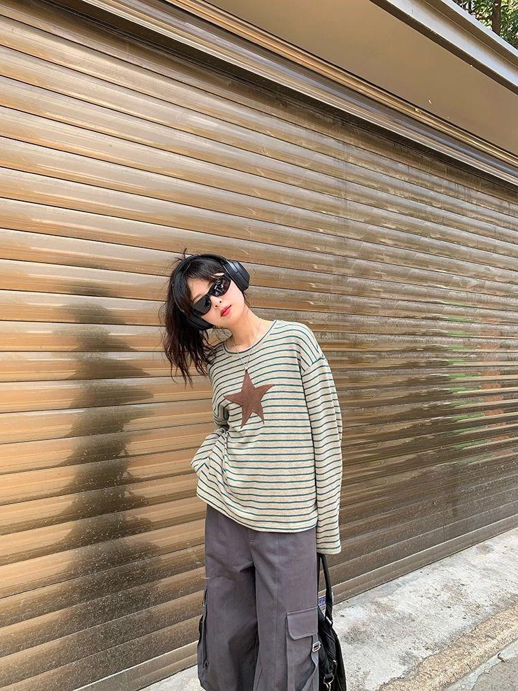 Camiseta holgada informal de manga larga con parche de estrella a rayas para mujer, estilo europeo y americano, otoño 2023