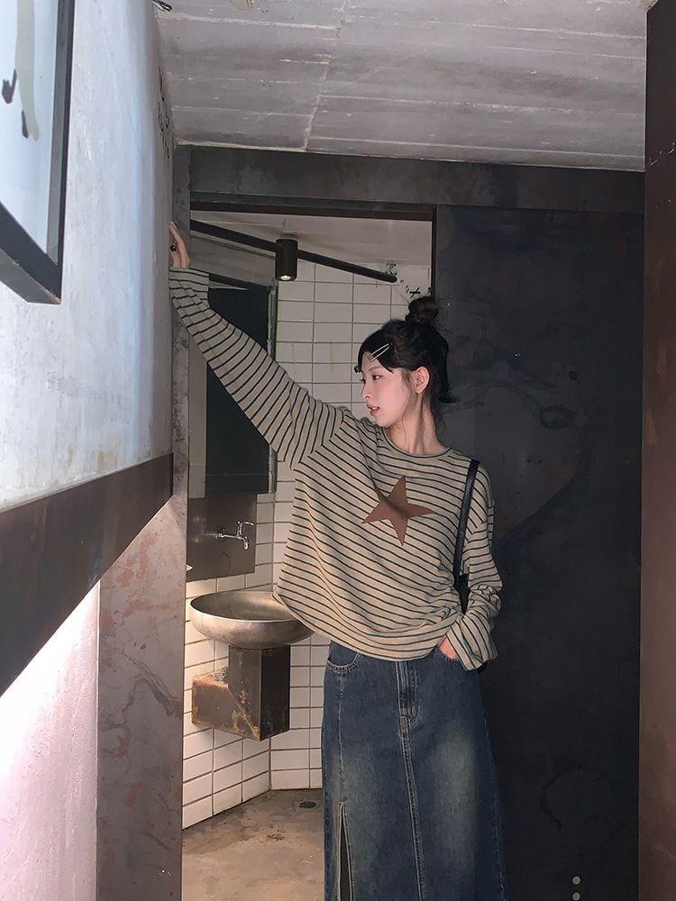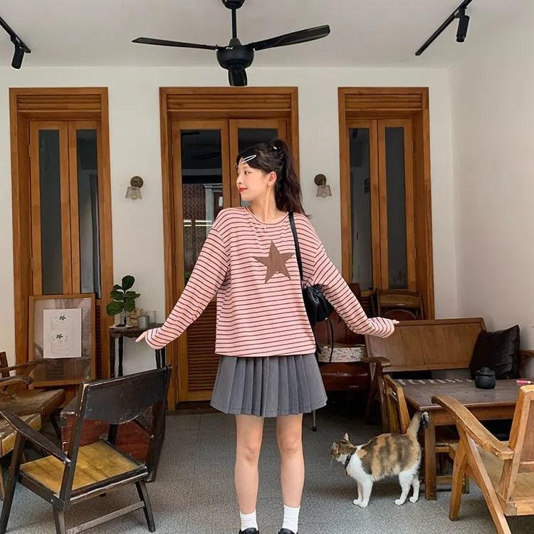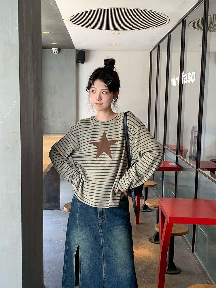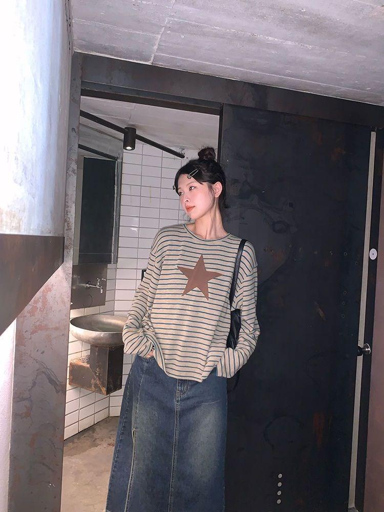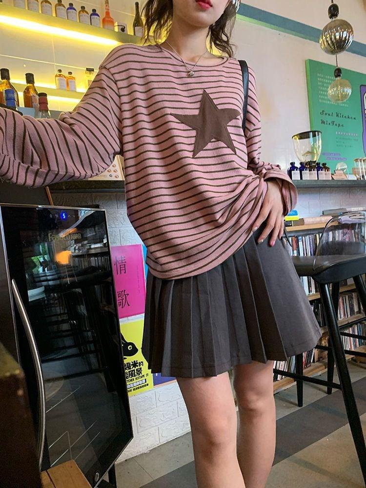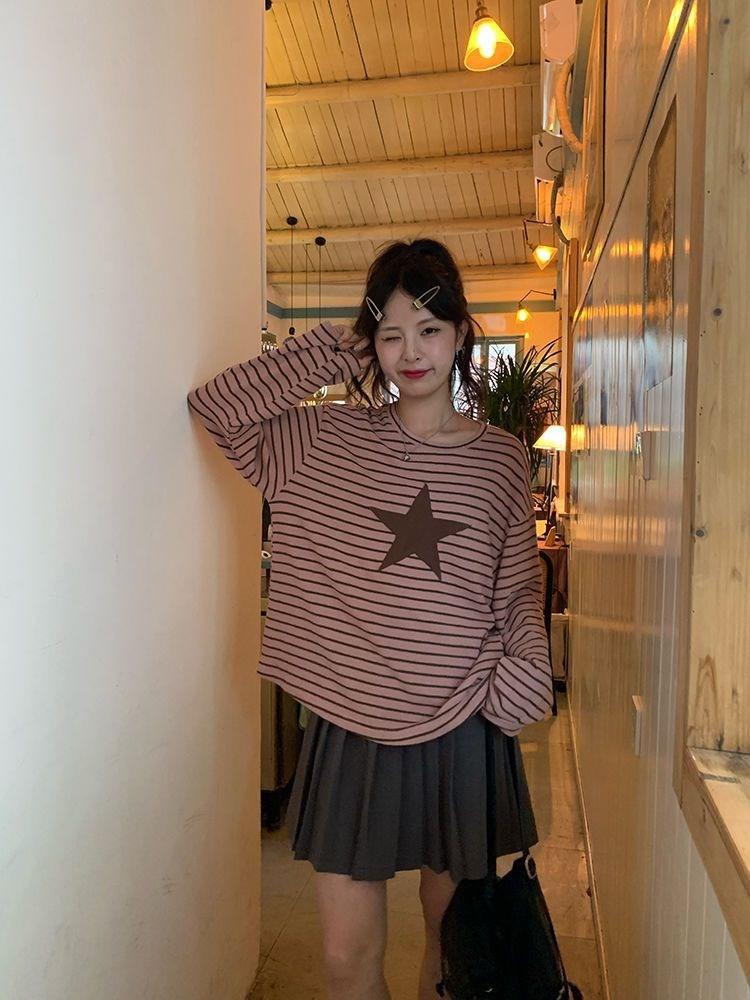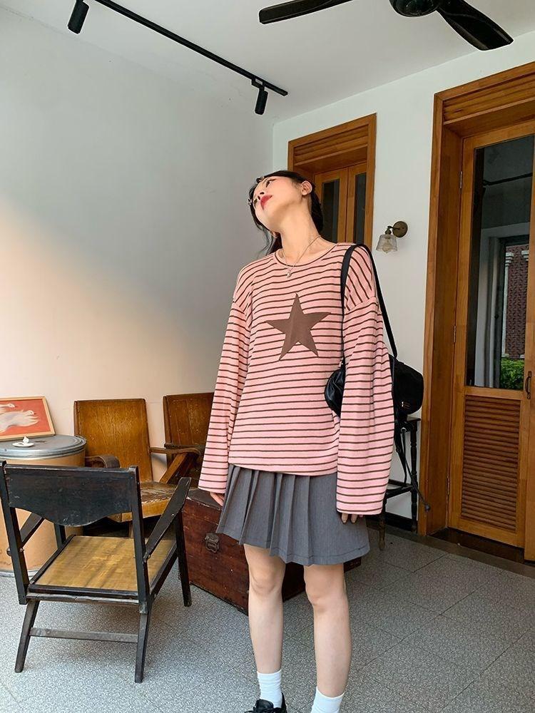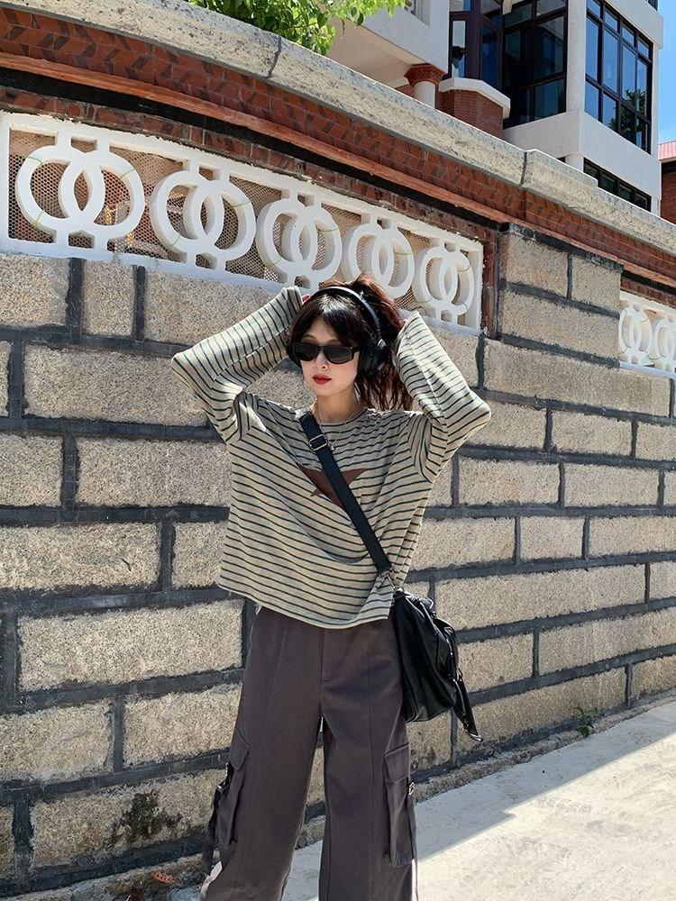 Camiseta holgada informal de manga larga con parche de estrella a rayas para mujer, estilo europeo y americano, otoño 2023