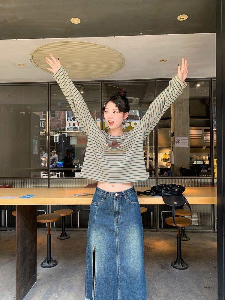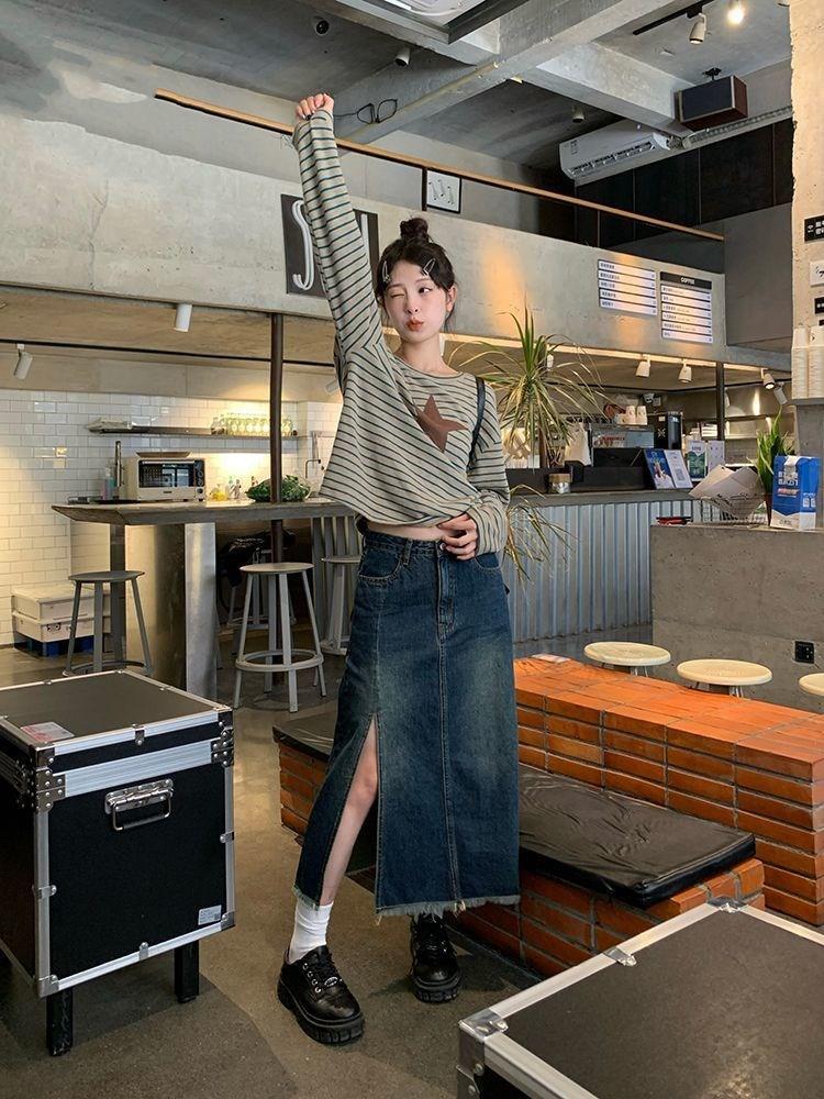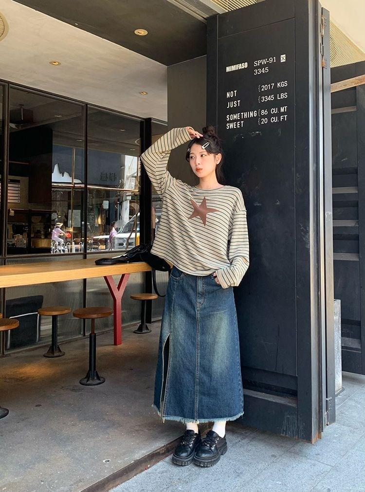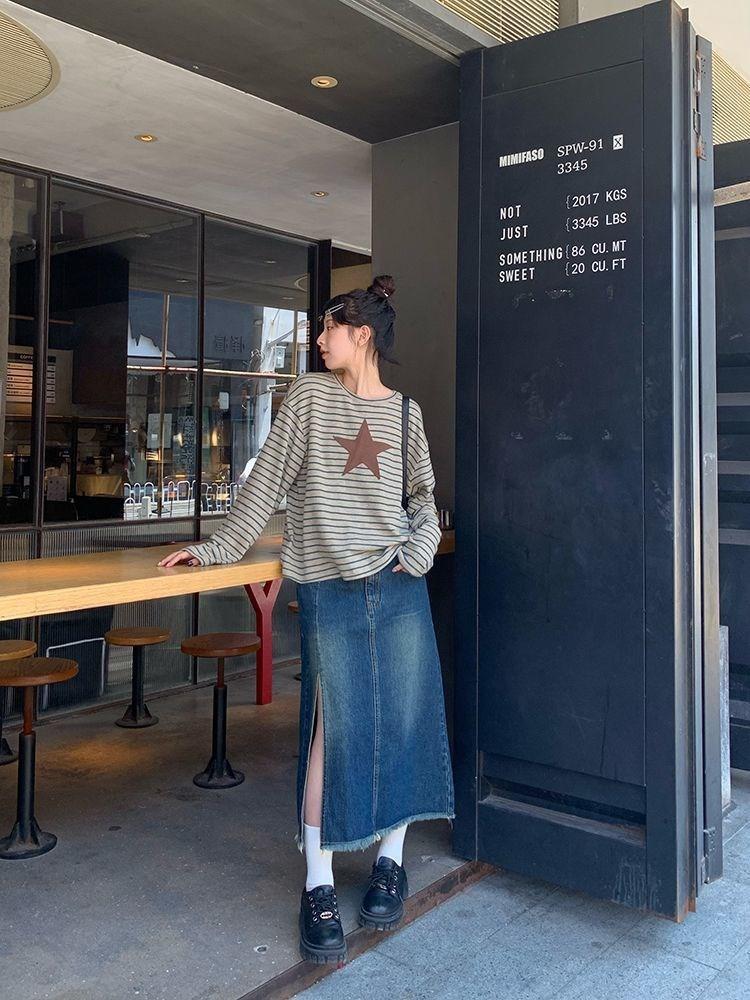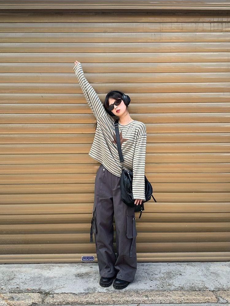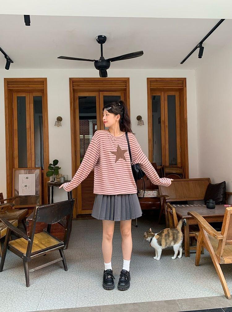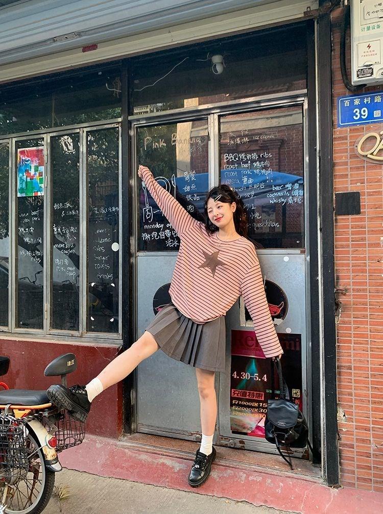 Camiseta holgada informal de manga larga con parche de estrella a rayas para mujer, estilo europeo y americano, otoño 2023