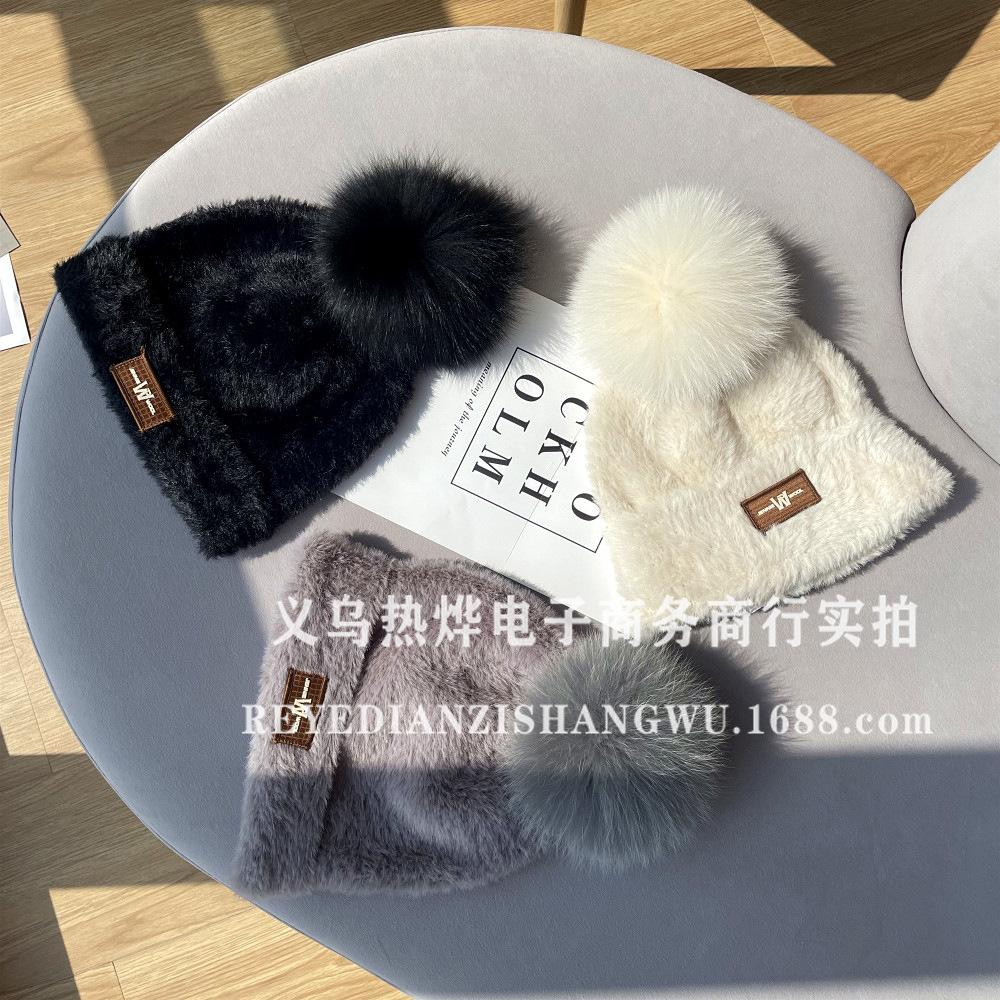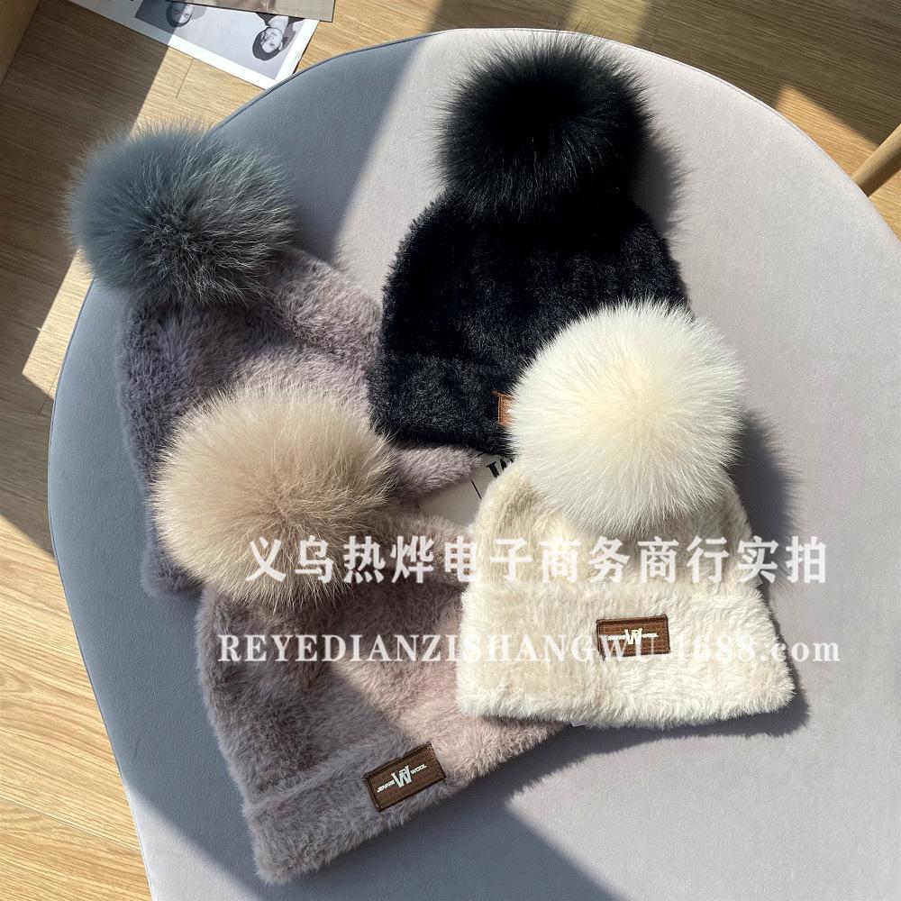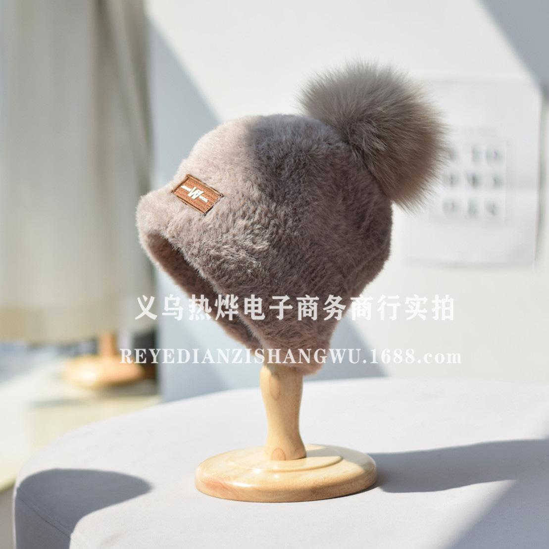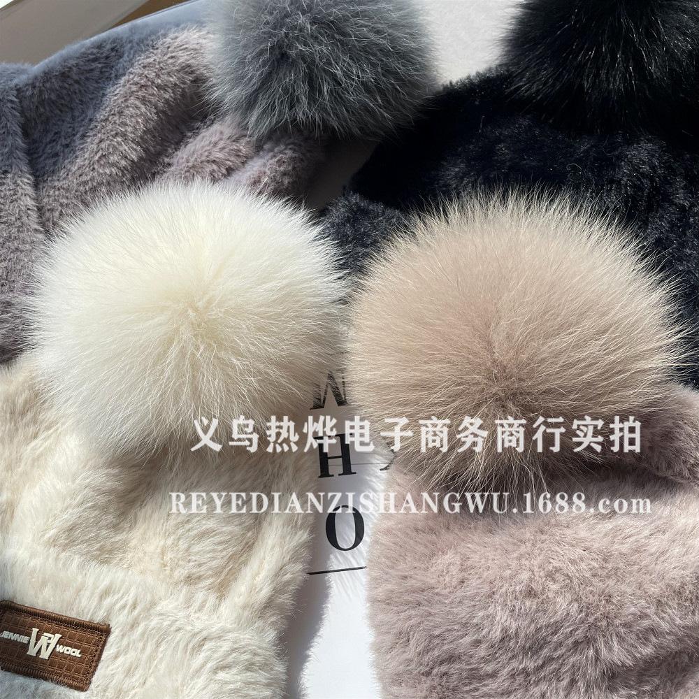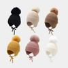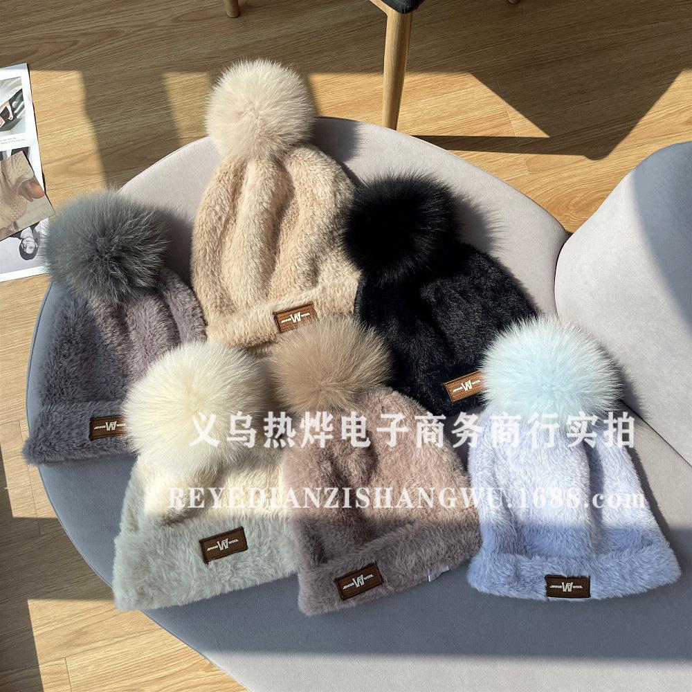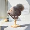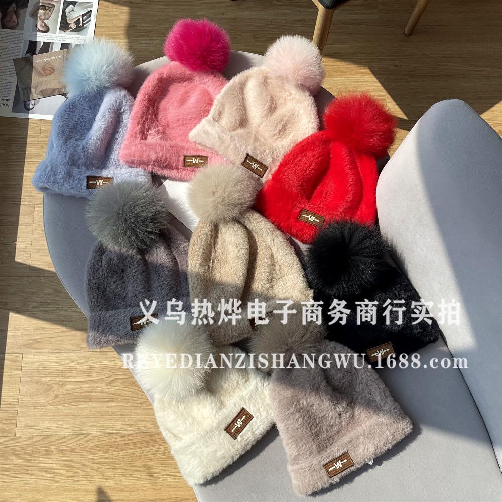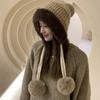 Gorro de punto rizado japonés para otoño e invierno, gorro de bola de pelo de zorro para niños, gorro de lana a juego, gorro de cabeza grande para el frío.