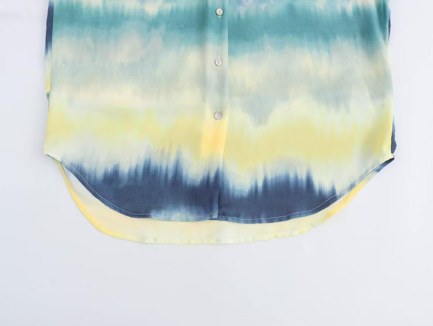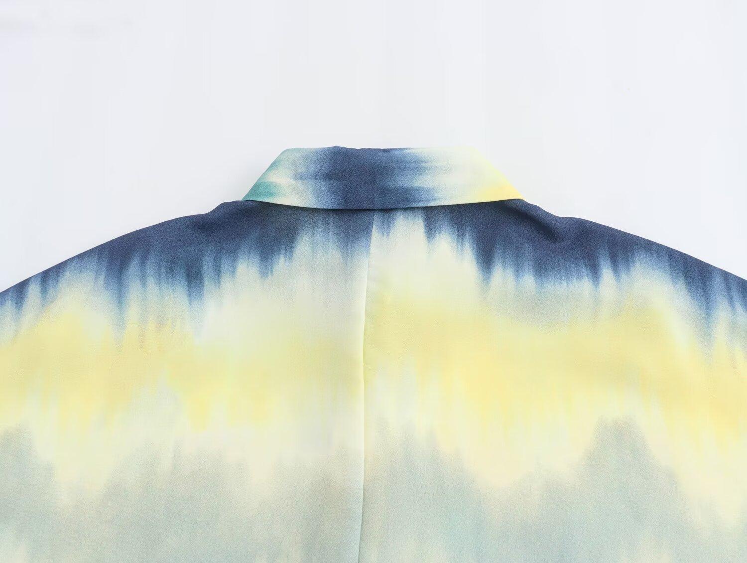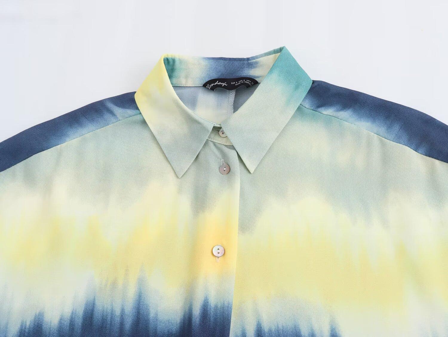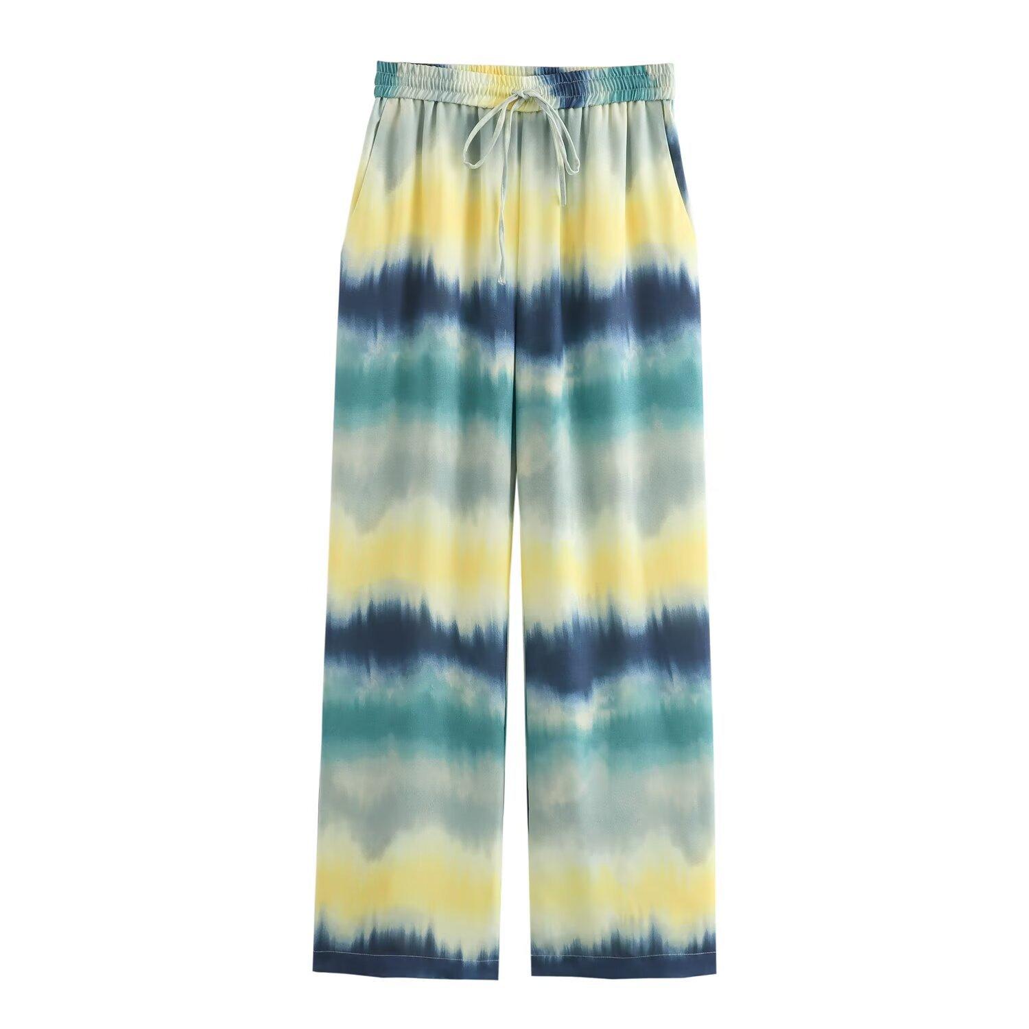 2024 Verano Nuevos Productos Europeo y Americano Transfronterizo para Mujer Camisa Drapeada Estampada Tie-Dye de Satén + Pantalones Drapeados