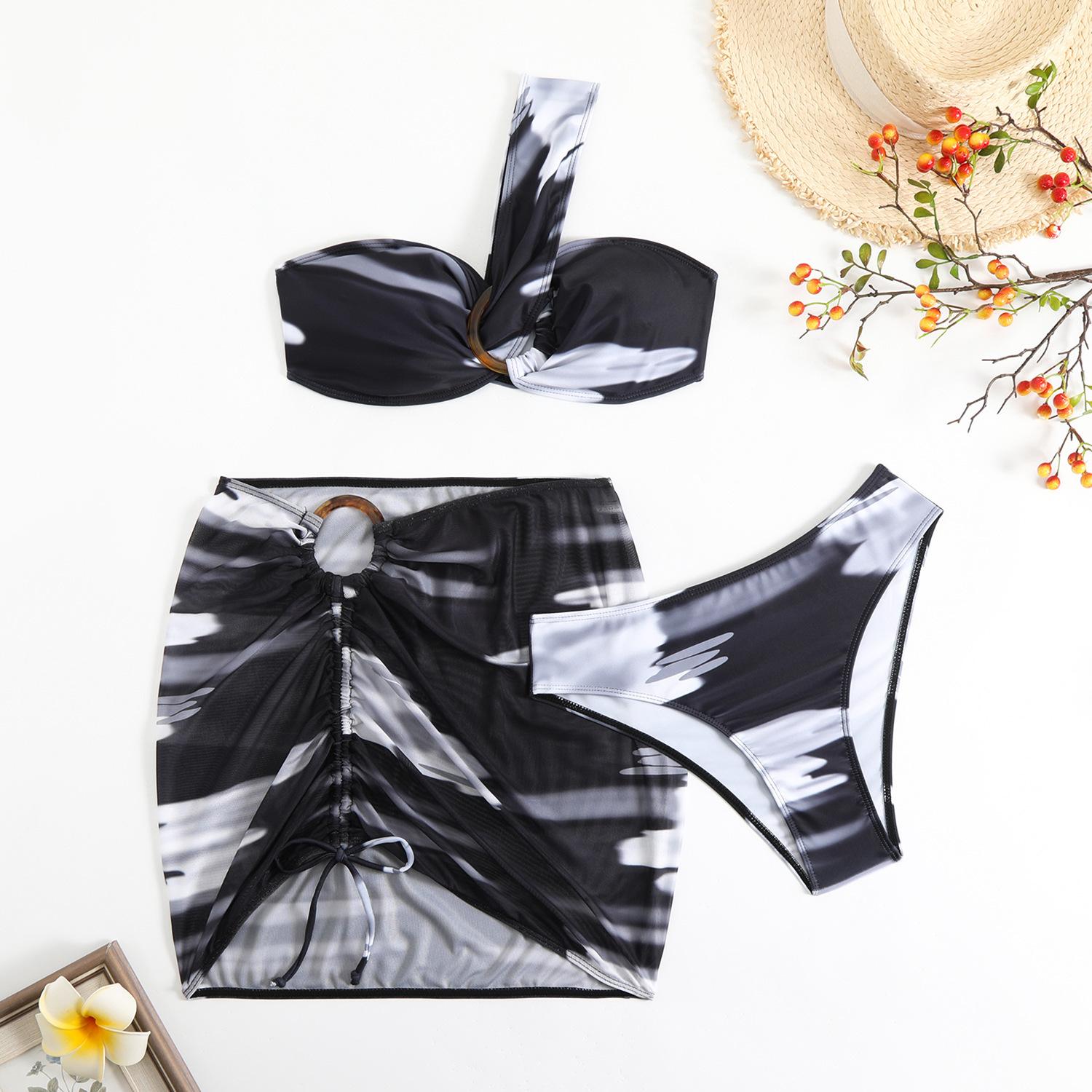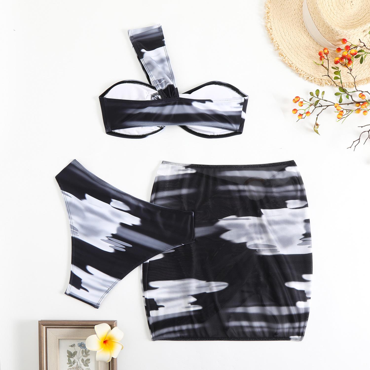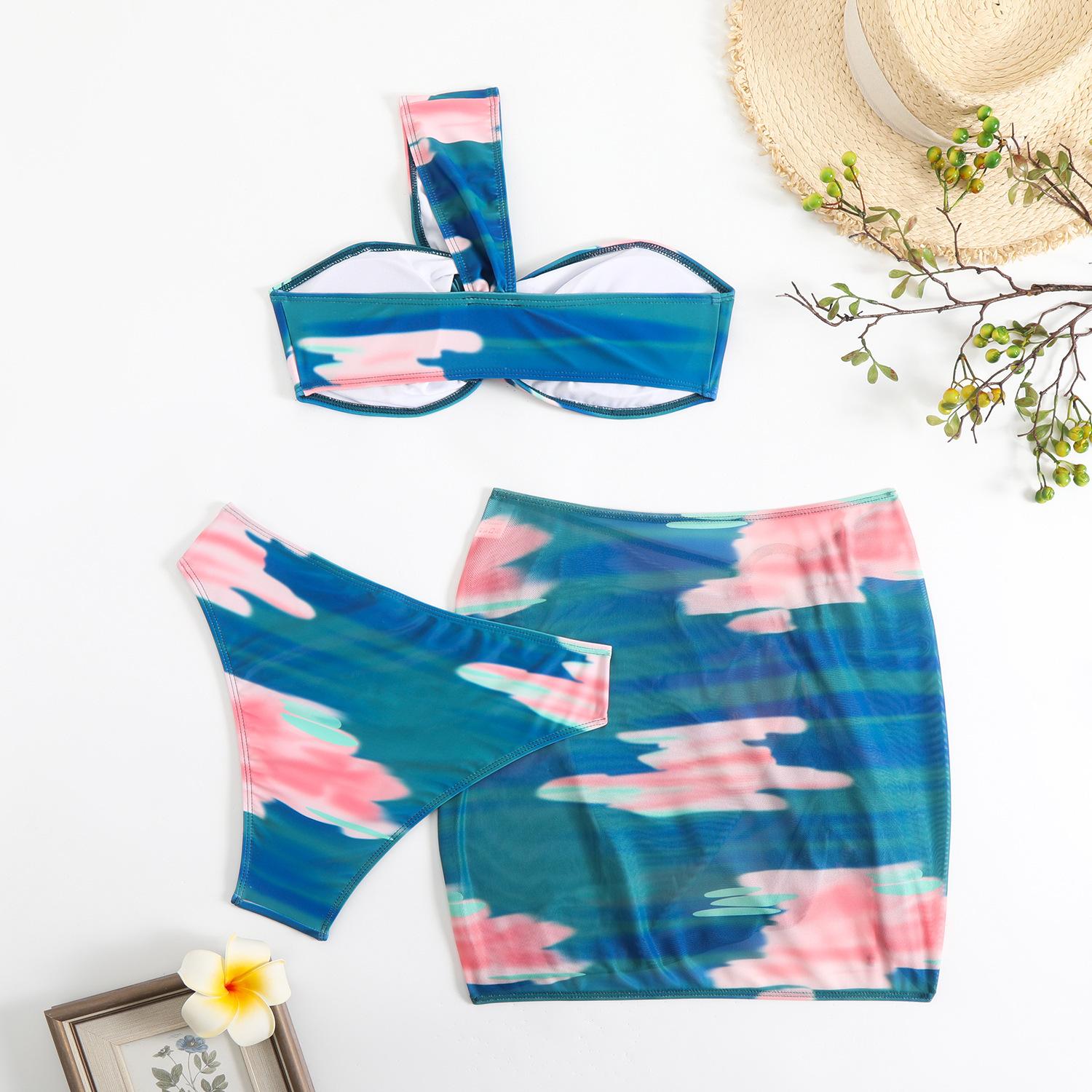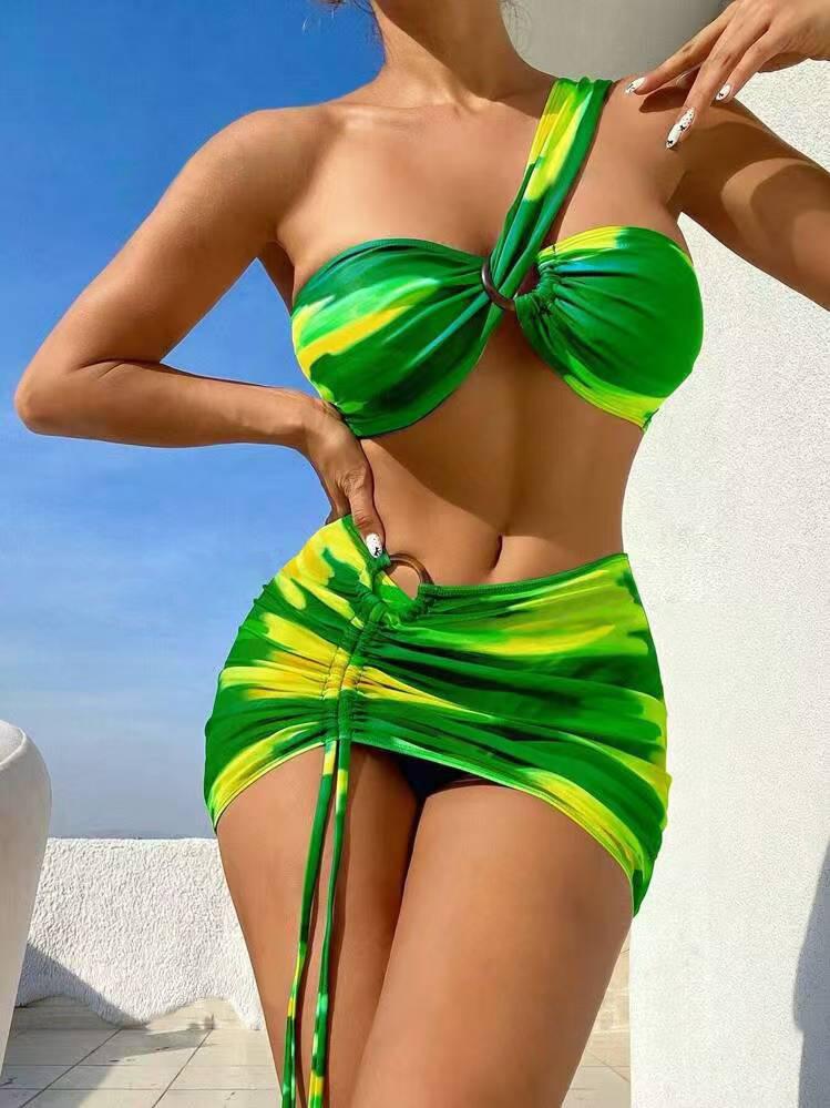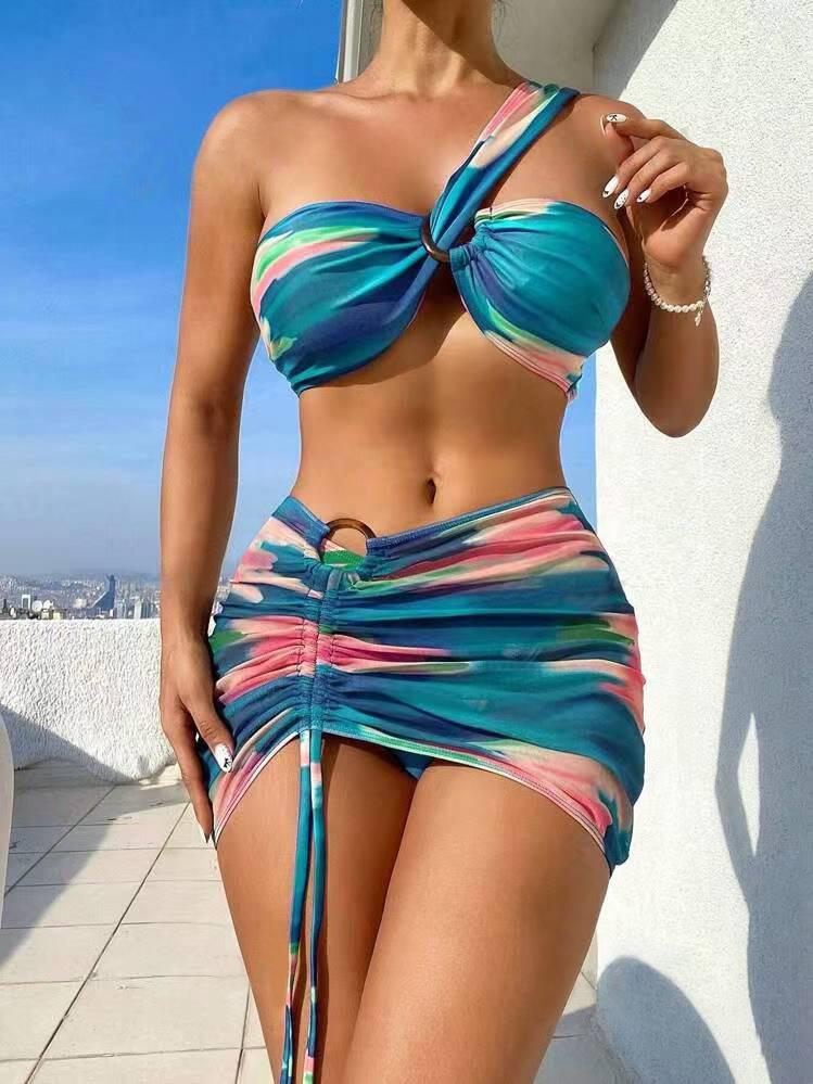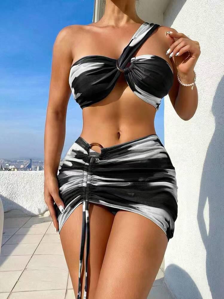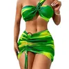 Traje de baño de tres piezas sexy con falda de un solo hombro y espalda descubierta con estampado teñido anudado para mujer, comercio exterior europeo y americano, 2025