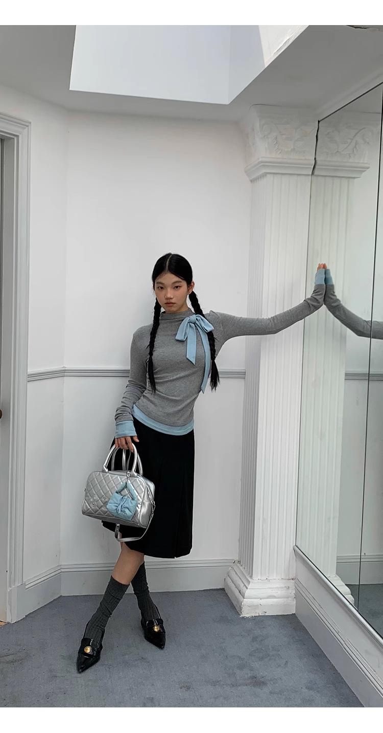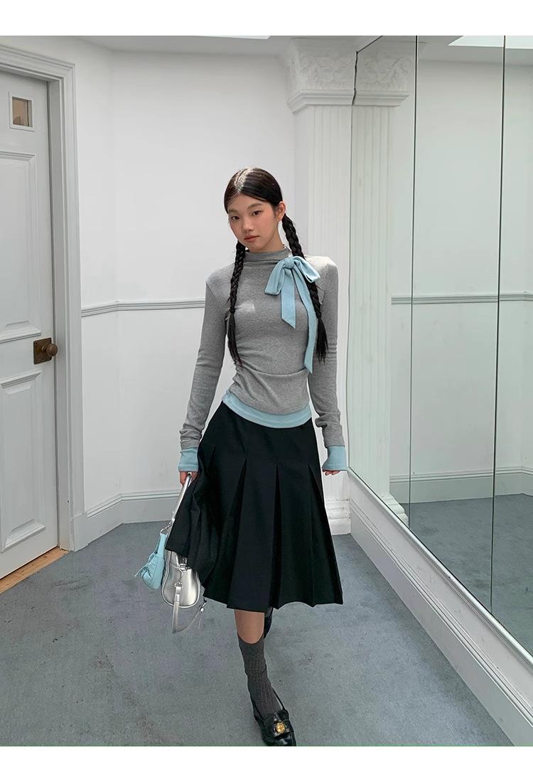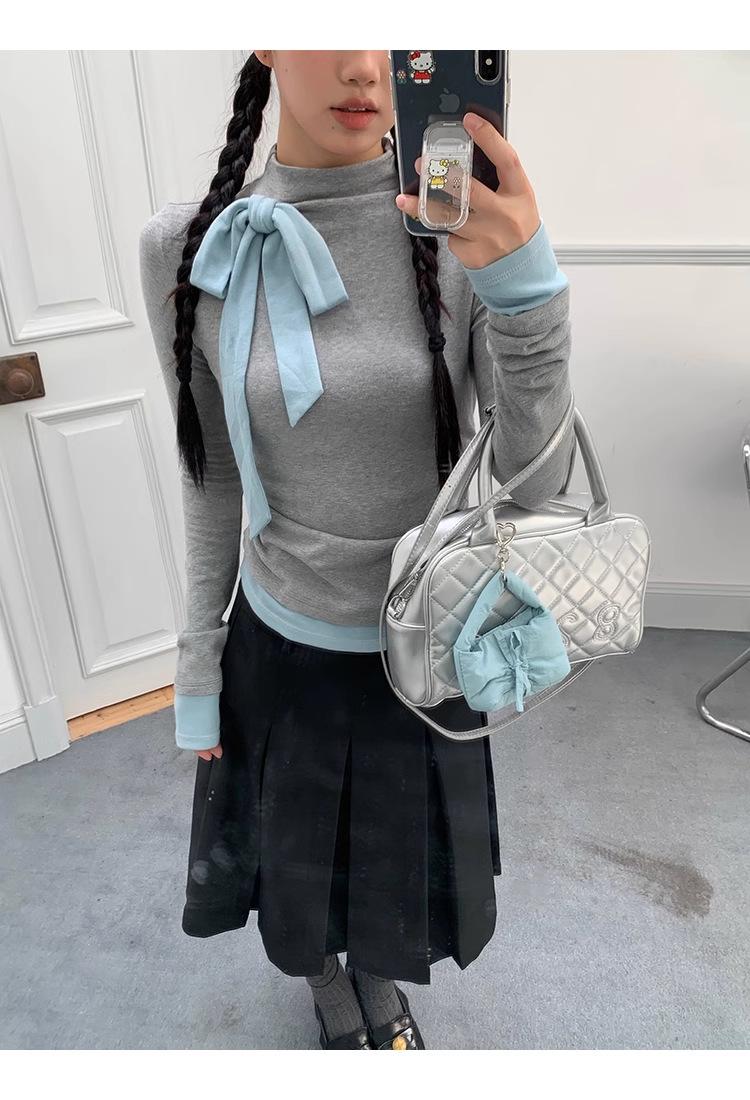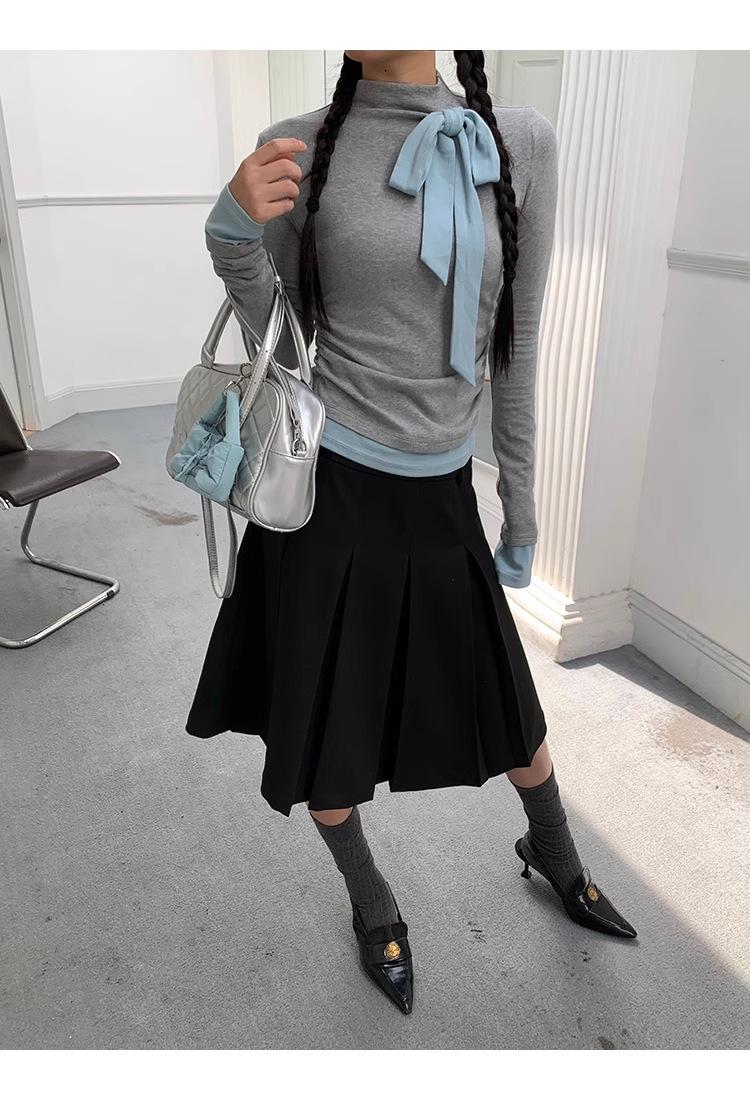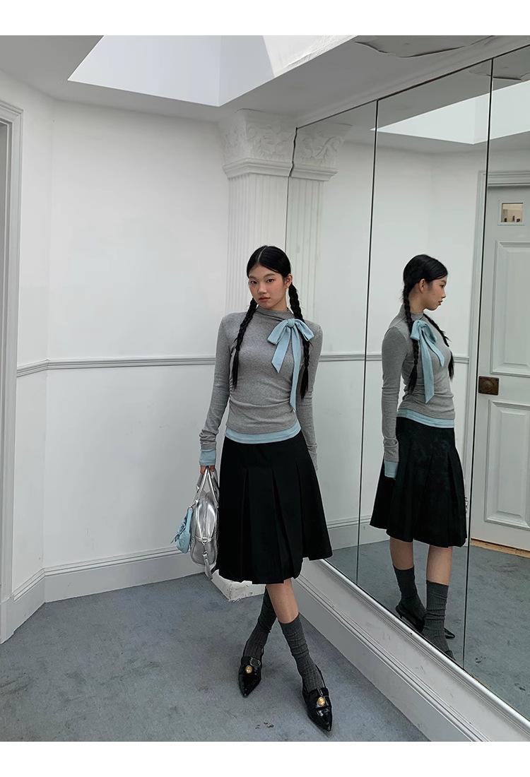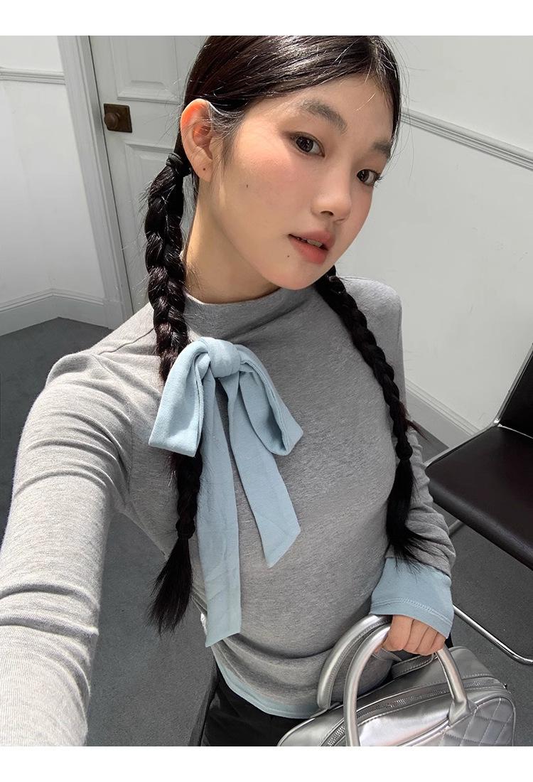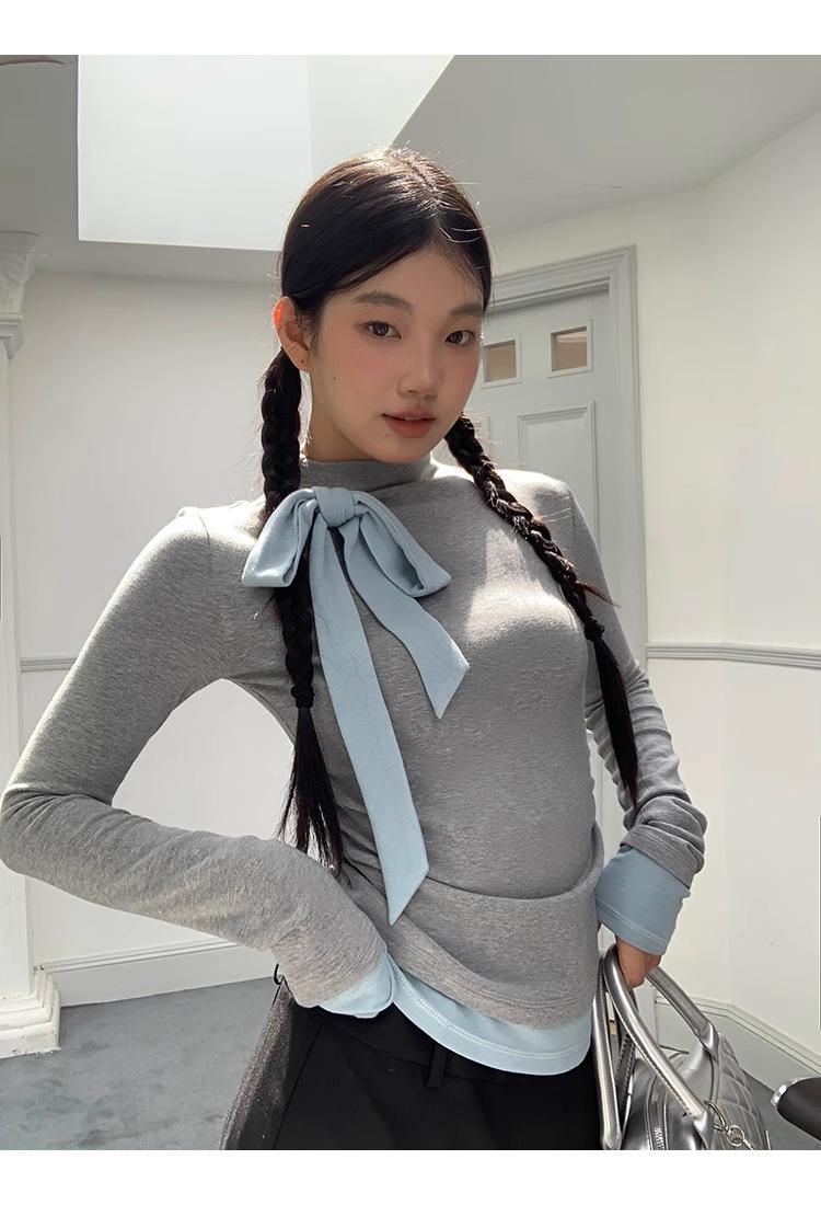 Camiseta de manga larga con cuello medio alto y lazo de otoño de dos piezas falsas de Niche para mujer, top plisado interior ajustado para mujer
