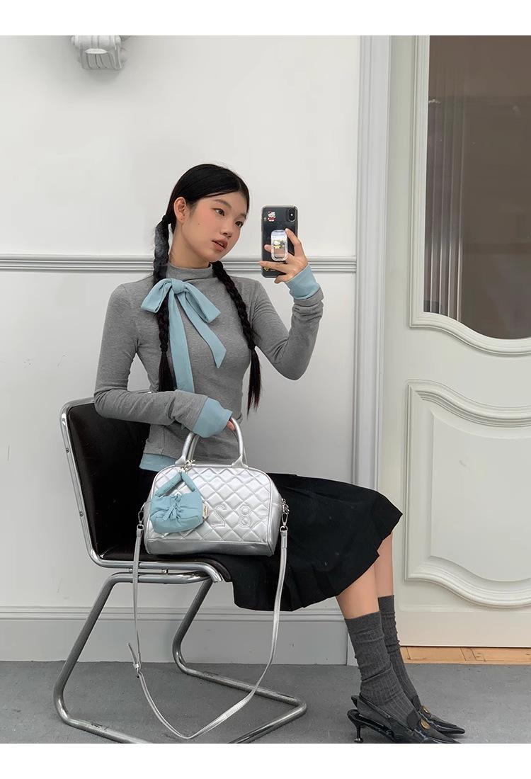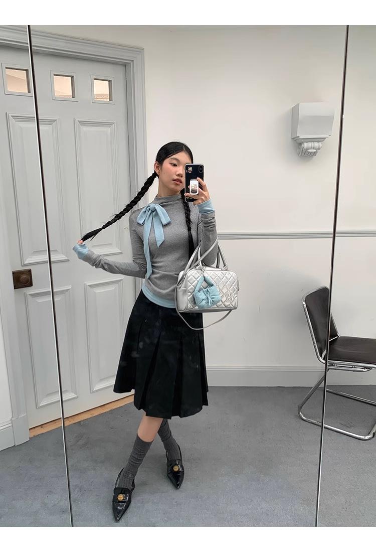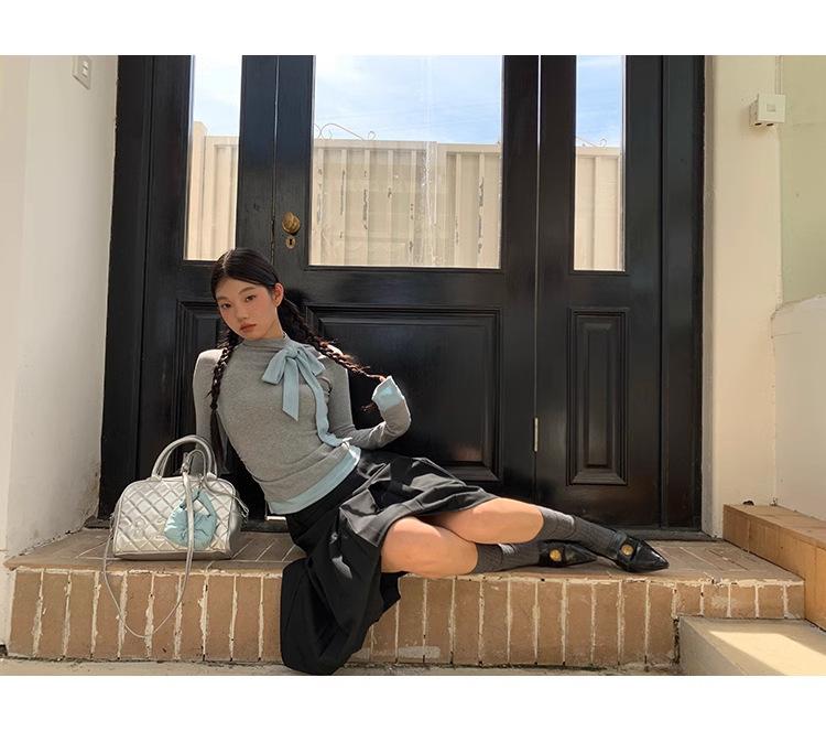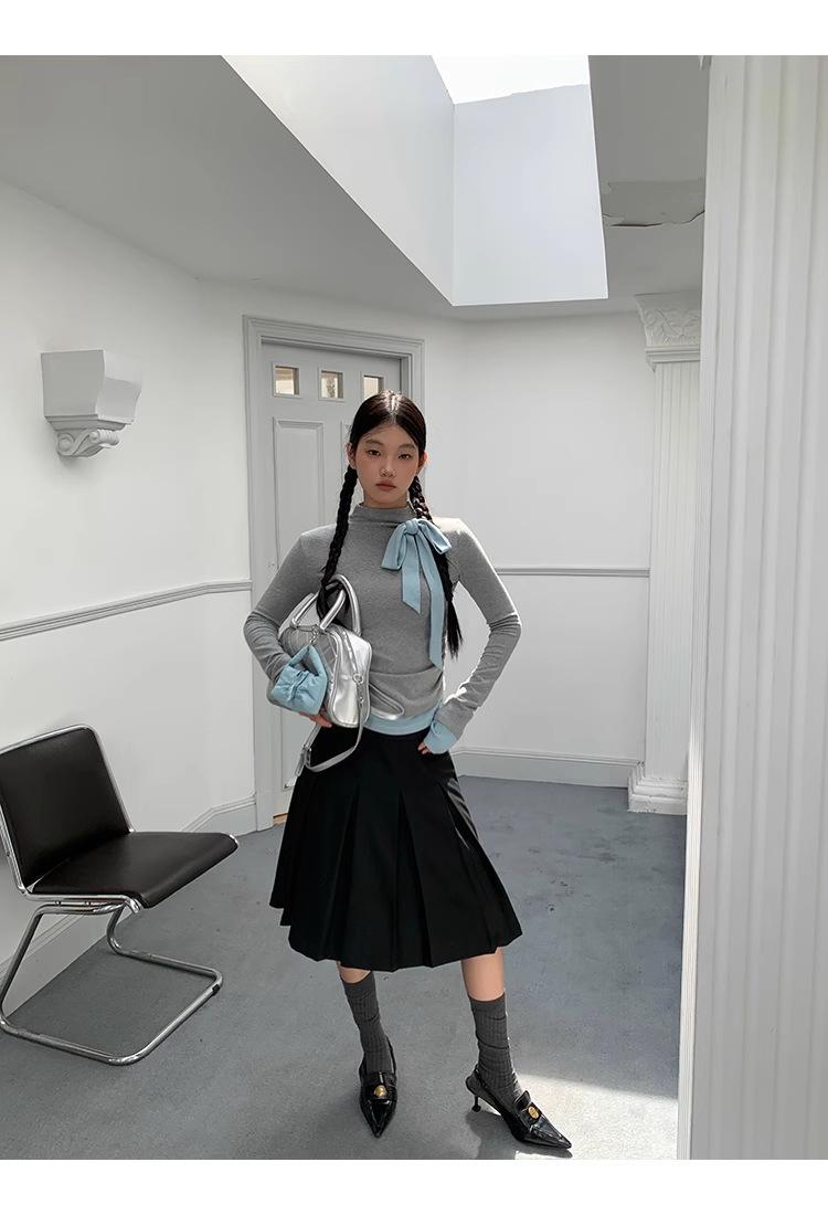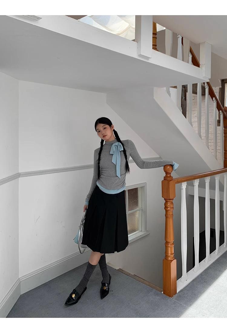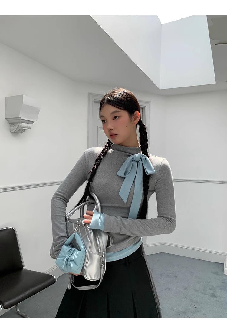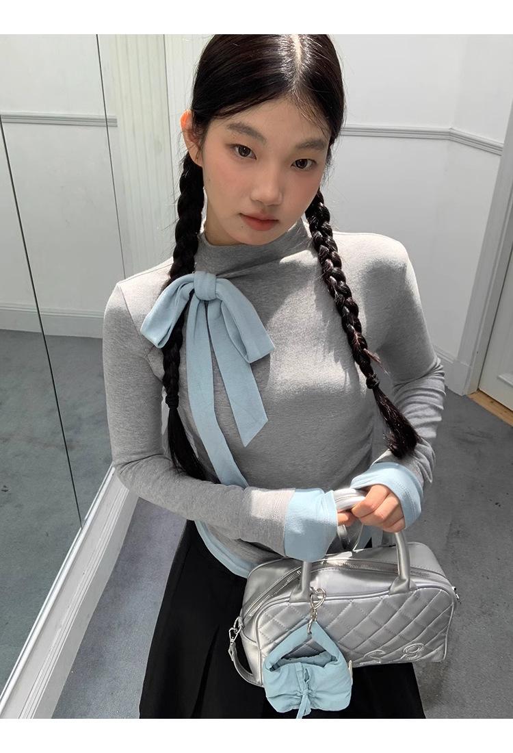 Camiseta de manga larga con cuello medio alto y lazo de otoño de dos piezas falsas de Niche para mujer, top plisado interior ajustado para mujer