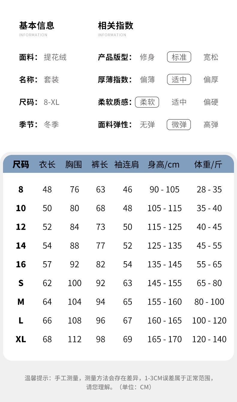 Size 8 [recommended height 90-105], Size 10 [recommended height 105-115], Size 12 [recommended height 115-125]...